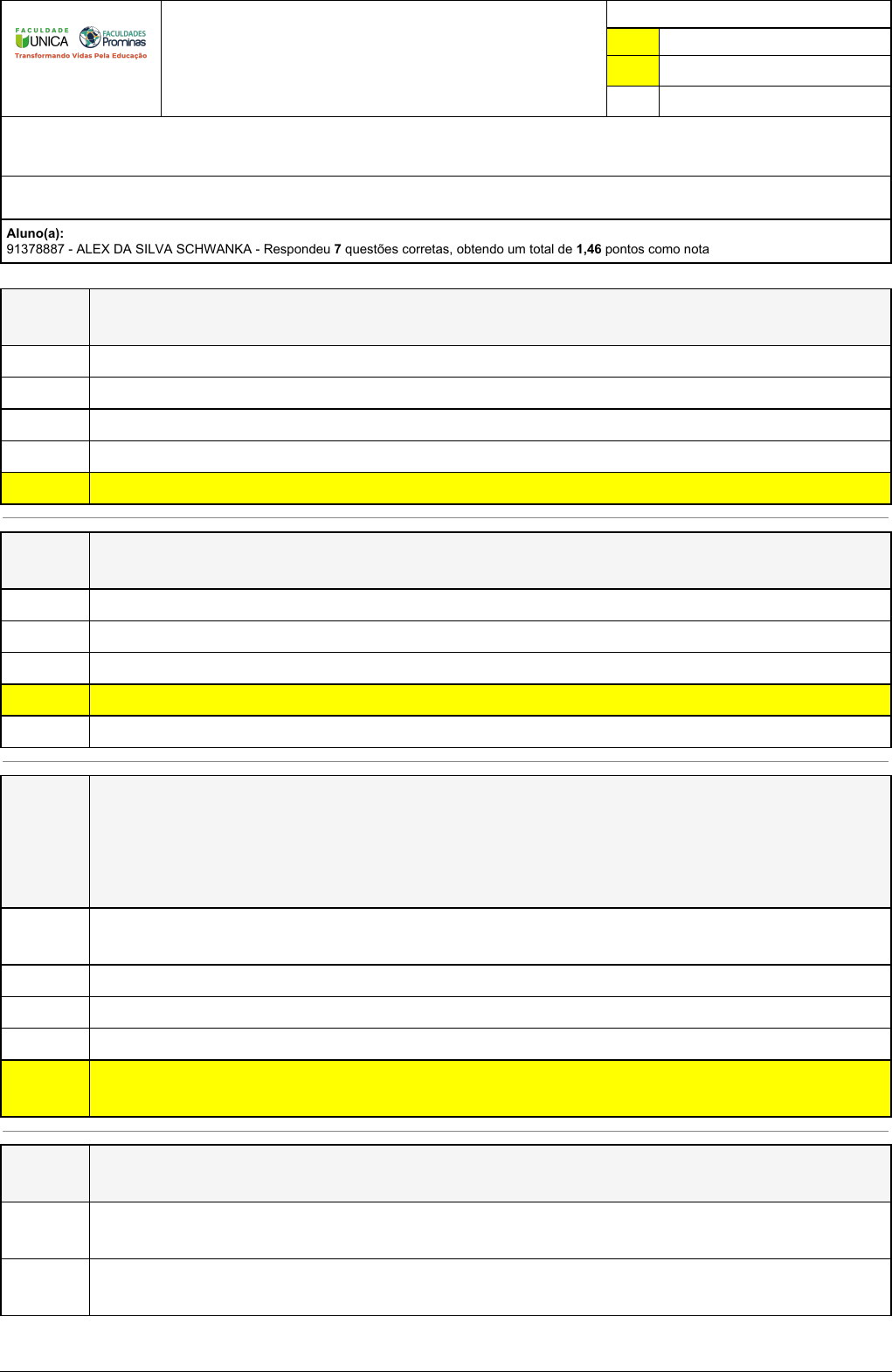 Pincel Atômico - 28/01/2023 20:42:58 1/3 ALEX DA SILVA SCHWANKA CAMINHO DO CONHECIMENTO Atividade finalizada em 28/01/2023 20:42:33 (tentativa: 2) LEGENDA Resposta correta na questão # Resposta correta - Questão Anulada X Resposta selecionada pelo Aluno Disciplina: PRÁTICA PEDAGÓGICA INTERDISCIPLINAR: HISTÓRIA DA FILOSOFIA CONTEMPORÂNEA E MODERNA [capítulos - 1] - Avaliação com questões, com o peso total de 1,67 pontos Turma: Segunda Graduação: Segunda Graduação 6 meses - Licenciatura em Filosofia - Grupo: FPD-FEV2022 - SGegu0A231122 [77466] Aluno(a): 91378887 - ALEX DA SILVA SCHWANKA - Respondeu 7 questões corretas, obtendo um total de 1,46 pontos como nota Questão 001 O filósofo Hegel (1770-1831) irá descortinar três causas principais para a eclosão da modernidade, a saber: A) O cristianismo; a Reforma Protestante e o Absolutismo. B) O fim do feudalismo; a Revolução dos cravos e o Iluminismo. C) A contrarreforma religiosa; a Revolução francesa e a modernidade. D) O antigo regime; a Independência dos E.U.A e as grandes navegações. X E) A Reforma Protestante; a Revolução francesa e o Iluminismo. Questão 002 Ao brotar das ruínas do autoritarismo religioso, a ciência moderna, detentora do método, propõe-se como A) algo religioso. B) algo idealista. C) algo desprovido de experimentos. X D) algo útil e prático. E) algo apenas do âmbito teórico. Questão 003 A importância da fundamentação do método científico será uma das maiores responsabilidades do pensamento de Galileu Galilei (1564-1642), o “pai da ciência moderna”. Partindo da perspectiva de que a realidade “é concebida como um sistema racional de mecanismos físicos, cuja estrutura profunda e invisível é matemática” (CHAUÍ, 2000, p. 56). Assim, podemos dizer que A) a fundamentação da ciência liga-se a um sistema de racionalidades que é, principalmente, teológica. B) para Galileu, a estrutura do conhecimento é metafísica. C) o método científico não se faz necessário para a ciência moderna. D) a determinação da racionalidade desvia-se das estruturas da matemática. X E) a racionalidade irá aproximar a razão dos modelos experimentais das ciências exatas. Questão 004 Podemos compreender o desencantamento do mundo, próprio do movimento histórico Iluminista, como A) a superação do caráter científico do mundo em prol de uma organização matemática da filosofia. B) a compreensão de que as estruturas filosóficas e o livre pensamento são inseparáveis das determinações religiosas e doutrinárias. Lucca Destacar Pincel Atômico - 28/01/2023 20:42:58 2/3 X C) a superação da organização de mundo anterior, pautado no pensamento livre e autônomo. D) a superação da organização de mundo anterior, pautado no misticismo e na religiosidade. E) a conservação as estruturas místico/mágicas/religiosas do mundo e, consequentemente, da organização das estruturas político-sociais. Questão 005 O método científico, central para a atividade científica, pode ser definido como A) o caminho pelo qual o cientista em conjunto com a técnica vê-se incapaz de fomentar regularidades, ou seja, leis naturais que não podem ser comprovadas por meio de experimentações. B) o caminho pelo qual a ciência se faz a priori, ou seja, sem a necessidade da confirmação metódica/experimental. C) o caminho pelo qual a ciência será construída pauta na sua proximidade com a religião e, principalmente, na centralidade da existência de Deus. D) o caminho pelo qual a ciência será construída a partir de uma atitude contemplativa com relação à realidade. X E) o caminho pelo qual a ciência será construída pautada na observação sistemática da realidade; no estabelecimento de regularidades e na confirmação por meio de experimentos. Questão 006 O uso crítico da razão propõe não apenas a superação da religião na organização do mundo, como também um novo modo de compreensão do conhecimento, centrado, principalmente X A) na concepção de que a racionalidade é um produto do sujeito. B) na concepção de que o mundo e o conhecimento são regidos pela metafísica religiosa. C) na concepção de que o saber científico deve, sobretudo, ser um produto da emoção humana. D) na concepção de que o conhecimento é advindo de Deus. E) na concepção de que o mundo é um local encantado, mágico e místico. Questão 007 A razão subjetiva é determinante para o pensamento moderno/científico. Contudo, há dois modos complementares de compreendê-la. Assinale abaixo a alternativa que corresponde a estes dois modos. A) A razão subjetiva é um modo de compreensão do real ligada às emoções e a liberalização da natureza. B) A razão subjetiva é romântica e, deste modo, propõe o gênio e não o cientista como detentor dos métodos de conhecimento do real. X C) A razão subjetiva é inerente às ações do indivíduo e, consequentemente, se insere como modo de dominação e instrumentalização da natureza. D) A razão subjetiva é ligada a sensibilidade e as emoções provindas do natural. E) A razão subjetiva é, consequentemente, religiosa e ligada aos princípios teológicos. Pincel Atômico - 28/01/2023 20:42:58 3/3 Questão 008 Reale e Antiseri (2005, p. 219), afirmam que o Iluminismo adota como característica fundamental “uma decidida confiança na razão humana, cujo desenvolvimento é visto como progresso da humanidade, e em um desinibido uso crítico da razão.” A partir disso, o uso crítico da razão passa a ser determinado pela A) condução científica da ausência de referencial metódico. B) razão tutelada pela religião. X C) consolidação do método científico como central para a determinação do conhecimento. D) confiabilidade do saber proposto pelas antigas tradições. E) fundamentação da religião como condutora do conhecimento.