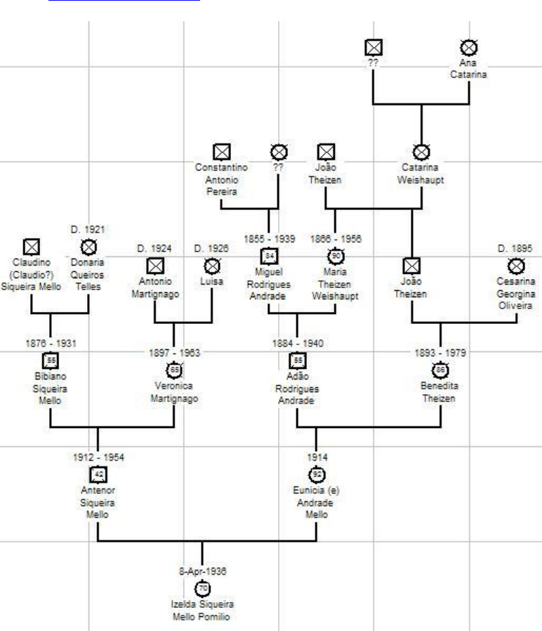 Este texto tem dois objetivos: 1. Identificar os descendentes da família “Siqueira Mello”, oriundos principalmente de Bebiano Siqueira Mello, que deixou descendentes em Jundiaí e em São Paulo (capital) e arredores. 2. Identificar a ascendência de Izelda Siqueira Mello Pomilio (minha mãe). Esta parte percorre o caminho dos Siqueira Mello e dos Andrade As informações que se seguem, no que se refere às gerações antigas, devem-se principalmente às lembranças de Rosalinda (Linda) Siqueira Mello Falocci e de Eunice de Andrade Mello. De inestimável importância são as informações e correções fornecidas por Aline Melo (em 2017/2018), com achados nos bancos genealógicos e diversos registros cartoriais. Àqueles que tiverem mais informações, fotos, agradeço a colaboração enviando para que seja possível melhorar este documento. José Antenor Pomilio, 18 de fevereiro de 2018 japomilio@gmail.com mailto:japomilio@gmail.com 1 Izelda Siqueira Mello Nasceu em Jundiaí, SP, em 8 de abril de 1936. Primogênita de Eunice (Eunicia) Rodrigues de Andrade e Antenor Siqueira Mello. Teve duas irmãs: Ineida (nascida e falecida em Jundiaí em1939 e 1946 respectivamente) e Ineuza (nascida em Jundiaí em 11/03/1941). A infância transcorreu na Vila Rami, em Jundiaí, onde residiam à Rua Cica. Cursou até o quarto ano do então curso primário, o que era normal naquela época, pois o nível de ensino seguinte só existia em escolas localizadas no centro da cidade, o que dificultava o acesso. Como os pais trabalhavam, teve muito convívio com a avó paterna, Verônica, que na época morava com a família. Nesta época auxiliava nas tarefas domésticas e levava as refeições (marmita) para os pais em seus locais de trabalho. Aos 13 anos começou a trabalhar na cerâmica Cidamar (onde trabalhava o pai) e depois de 3 anos foi trabalhar na tecelagem Argos. Jundiaí, à época, era um grande centro têxtil. Aos 17 anos fez uma cirurgia para correção de estrabismo, que se instalou quando tinha 3 anos, possivelmente por causa de uma convulsão. Começou a namorar o futuro esposo, Vavo, em 1953. Izelda e Norivaldo (Vavo) casaram-se em 1/12/1956. Inicialmente residiram em Jundiaí, onde nasceram Roseli Aparecida Pomilio (1/2/1958) e José Antenor (6/5/1960). Residiram na casa de Izelda, na Rua Cica, depois se transferiram para a R. Regente Feijó, em seguida para a Rua Monteiro Lobato (onde nasceu Roseli) e R. 13 de Maio (onde nasceu Antenor) e posteriormente compraram uma casa na Vila Scavone. A mãe de Izelda (Eunice) sempre residiu com eles. Inicialmente a irmã (Ineuza) também residiu com eles, até seu casamento. Em 1964 mudaram-se para São Caetano do Sul em virtude do novo emprego do marido. Em 1972 mudaram-se para Santo André onde Izelda reside até hoje. Vavo, Roseli, Izelda e Antenor (Itanhaém, ~1968) Izelda (~2000) 1.1 Antenor Siqueira Mello Nasceu em Itatiba (bairro Curupira?) (ver Bibiano) em 22/02/1912, mas foi registrado em 11/3/1912. Casou-se com Eunice em 29/11/1935. Teve três filhas: Izelda, Ineida (nascida e falecida em Jundiaí em 11/7/1939 e 11/??/46 respectivamente) e Ineuza (nascida em Jundiaí em 11/03/1941). Ineuza se casou com Nivaldo Bomeisel e tiveram os filhos Denise e Dênis. Sempre trabalhou na cerâmica Cidamar. Inicialmente, após o casamento, moraram em casa da “colônia”, ou seja, casas da Cidamar onde moravam seus empregados. Em 1951 se mudaram para a casa da Rua Cica, casa que construíram. Faleceu com problemas cardíacos em 31/07/1954. Está enterrado no cemitério N. S. do Desterro (centro) em Jundiaí. Eunice faleceu em Santo André, em 2014, aos 100 anos. Eunice, Antenor, Izelda, Ineuza e amiga (foto à direita) aprox. 1952. 1.1.1 Bibiano (Bebiano) Siqueira Mello Nasceu em 7/1/1876 (em Taubaté, conforme registro de óbito) e faleceu em Jundiaí em 3/10/1931. Segundo registro no cartório de Jarinu (SP), no Livro B-1, folha 7-V, termo n°18 1 em 04/06/1893, Bebiano de Siqueira Mello casou-se com Elisiaria Maria Rosa, filha de Anna Maria Rosa. Deste primeiro casamento teve um filho, de nome Claudino (o qual teve 14 filhos). Após o falecimento de Elisiaria, casou-se com Verônica Martignago. Moravam em Itatiba, em uma fazenda, a qual foi arrendada em aprox. 1919, quando a família se mudou para Jundiaí. Do casamento com Verônica teve os seguintes filhos: Bibiano (Bianico), Antenor, Antonio, Rosalinda (Linda) e José. Conta-se na família que Bibiano participava de manifestações populares como a congada, possuindo uma espada ritual (que está em posse de José Falocci), além de fazer simpatias e benzeduras. Era seu um “Livro de São Cipriano” com rezas e receitas, que foi queimado pela sua esposa, Verônica, após sua morte. Bibiano, filho, (nascido em 1910 e falecido em 1965) casou-se com Onofra e se estabeleceram em Osasco. Seus filhos são: Milton, Celino, Tonico, Catarina e ? 1 Informações coletadas por Aline Melo. Os demais se mantiveram em Jundiaí. Antonio (nascido em 7/5/1916 e morto em 23/4/??) se casou com Jandira Malatesta e tiveram cinco filhos: Oscar, Marinite (Tota), Toninho, Cláudio e José Edgar. José (nascido em outubro de 1918 e falecido em abril de 1986) se casou Olinda Biasotto e tiveram quatro filhos: Adão, José (Zezinho), Eva e Maria Aparecida (Cida). Rosalinda (nascida em 31/1/1914, registrada em 1/3/1914, falecida no Rio de Janeiro em ???) casou com Zanobi Falocci, mudou-se para São José dos Campos e, posteriormente, para o Rio de Janeiro. Tiveram três filhos: Ailton, José e Maria Aparecida. Bibiano e Verônica 1.1.1.1 Cláudio de Siqueira Mello Pai de Bibiano, às vezes referido como Claudino, é o mais antigo familiar identificado na linha Siqueira Mello. Segundo depoimento de Linda (Rosalinda) S. Mello, seria português, militar e teria servido na guerra do Paraguai, como alferes (haveria uma citação de seu nome em livro sobre a Guerra do Paraguai em livro do historiador Rocha Pombo). Teria vindo par
