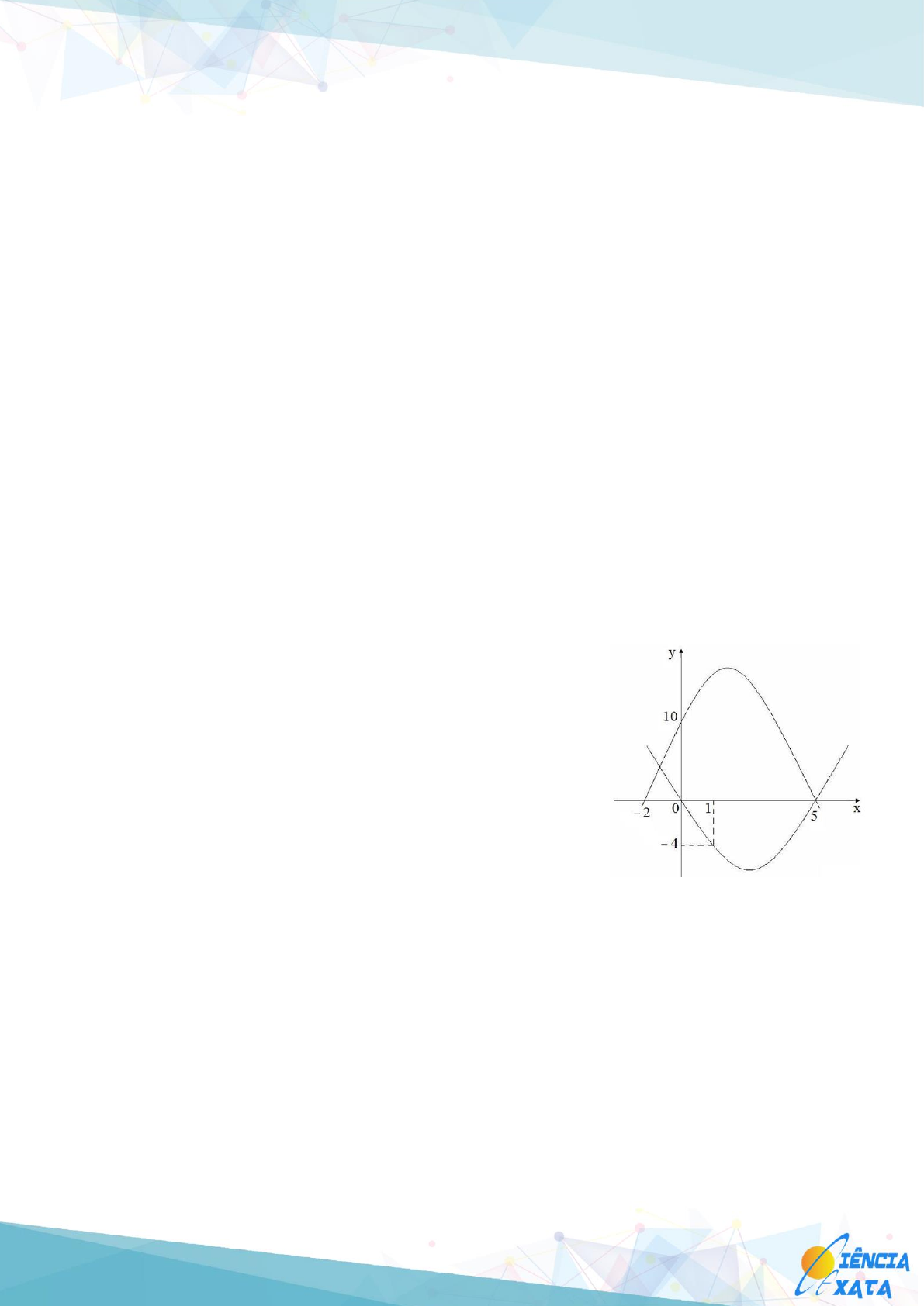 CIÊNCIA EXATA CONCURSOS www.cienciaexata.com – youtube.com/cienciaexata – LISTA DE QUESTÕES – CARGO PEB MATEMÁTICA CONSULPLAN (conteúdo específico) CONSULPLAN – Questões de 2010 (Prefeitura de Poço Redondo/SE): 21) Assinale o valor do produto m . n, para que o resto da divisão de 4x 5 + 3x 3 + mx 2 – x + n por 2x 3 + x 2 + 5 seja igual a − 9x 2 + 4x − 8: A) 8 B) 6 C) 10 D) 4 E) 12 22) Num guarda-roupa há 13 camisas, sendo 7 sociais e 6 esportivas. De quantas maneiras uma pessoa poderá escolher 5 camisas desse guarda-roupa para uma viagem, de forma que pelo menos duas delas sejam esportivas? A) 842 B) 964 C) 1056 D) 1092 E) 1154 23) Num lava-jato, cujo funcionamento é de 10 horas por dia, são lavados 120 carros em 8 dias. Para garantir que num período de 10 dias sejam lavados 180 carros, é necessário que o número de horas de funcionamento diário do lava-jato aumente em: A) meia hora. B) 1 hora e meia. C) 1 hora. D) 2 horas. E) 2 horas e meia. 24) A seguir, estão representadas duas parábolas de funções quadráticas distintas. Quais são as coordenadas dos pontos de interseção entre as duas parábolas que representam essas funções? A) (5, 0); (−1, 4) B) (0, 5); (6, −1) C) (0, 5); (−1, 5) D) (5, 0); (−1, 6) E) (5, 0); (−1, 5) 25) Uma bola de isopor, cuja superfície esférica tem uma área de 36πcm 2 foi colocada numa caixa cúbica de papelão. Considerando que a superfície esférica da bola se encontrou inscrita na superfície cúbica da caixa, pode-se afirmar que a razão entre o volume da bola e o volume da caixa é de: A) π/6 B) π/4 C) π/3 D) π/8 E) π/9 26) Sejam as matrizes: 1 x 1 x 1 A e B 2 2 2 1 . Qual é a soma dos possíveis valores de x, para que o determinante da matriz B.A seja igual a − 6? A) 3 B) − 5 C) – 2 D) – 3 E) 2 LISTA DE QUESTÕES – CARGO PEB CONSULPLAN MATEMÁTICA (conteúdo específico) 27) Para que o mínimo da função y = x 2 – 2x + k seja igual a −16, é correto afirmar: A) k é primo. B) k é maior que 5. C) k não é inteiro. D) k não é natural. E) k não é negativo. 28) O quinto termo de uma progressão aritmética é 44. Sendo a razão desta progressão igual a 6, qual é a soma entre o primeiro e o centésimo termo dessa progressão? A) 614 B) 626 C) 634 D) 648 E) 656 Gabarito: CONSULPLAN – Questões de 2011 (Prefeitura de Santo Antônio do Descoberto/GO): 21) Num supermercado estão disponíveis 12 variedades de biscoito e 8 sabores de chá em caixa. De quantas maneiras pode-se comprar 3 pacotes distintos de biscoito e 2 caixas de chá de sabores diferentes? A) 5265 B) 6160 C) 6250 D) 5825 E) 6340 22) Seja (x, 14, x + 10, 24, x + 20, 34,...) uma progressão aritmética. A soma dos 10 primeiros termos dessa sequência é igual a: A) 300 B) 315 C) 285 D) 304 E) 288 23) A soma dos possíveis valores de b, para que o resto da divisão do polinômio p(x) = 2x 2 + 3x + 5 por d(x) = 2x + b, seja igual a 7 é: A) 2 B) 1 C) 3 D) 5 E) 4 LISTA DE QUESTÕES – CARGO PEB CONSULPLAN MATEMÁTICA (conteúdo específico) 24) Sejam as funções f(x) = ax – 1 e g(x) = x + b. Qual o valor do produto a . b, considerando que o ponto de interseção entre os gráficos dessas duas funções tem abscissa igual a 2 e ordenada igual a 7? A) 14 B) 20 C) 16 D) 12 E) 18 25) Um limão tem formato esférico, do qual 40% do volume é constituído por suco. Sendo seu raio igual a 3cm, qual volume máximo de suco pode ser obtido com 10 limões iguais a este? (Considerar π = 3) A) 382ml B) 432ml C) 364ml D) 428ml E) 416ml 26) De uma torneira caem 3 gotas de água a cada 2 segundos. Se o volume de cada gota é igual a 0,05ml, qual o volume total de água despejado num intervalo de tempo de 2 dias? A) 15,28 litros. B) 12,96 litros. C) 10,48 litros. D) 16,24 litros. E) 9,64 litros. 27) Diego foi a matinê de um circo cujo preço do ingresso é 20% inferior ao preço cobrado pelo espetáculo noturno. Como era o dia de seu aniversário, o circo ainda lhe ofereceu um desconto de 25% do valor da matinê e assim Diego pagou R$18,00. Qual o valor do ingresso para o espetáculo noturno? A) R$32,00 B) R$28,00 C) R$30,00 D) R$24,00 E) R$25,00 28) A soma dos algarismos de um número primo menor que 100 é igual a 17. O sucessor desse número primo é: A) Divisível por 11. B) Múltiplo de 4. C) Quadrado perfeito. D) Múltiplo de 10. E) Divisível por 7. Gabarito: LISTA DE QUESTÕES – CARGO PEB CONSULPLAN MATEMÁTICA (conteúdo específico) CONSULPLAN – Questões de 2012 (Prefeitura de Uberlândia/MG): 21) Seja a função quadrática y = ax 2 + bx + c, cujo gráfico que intercepta o eixo y no ponto de ordenada – 2 tem vértice (1, – 1) e passa pelo ponto (3, – 5). A função considerada A) apresenta duas raízes negativas. B) tem concavidade voltada para cima. C) não apresenta raízes reais. D) apresenta raízes reais opostas. E) tem todos os seus coeficientes negativos. 22) A soma do maior número natural de 3 algarismos distintos divisível por 12 com o maior número natural par de 3 algarismos distintos múltiplo de 9 é A) 1.948. B) 1.962. C) 1.960. D) 1.968. E) 1.956. 23) Sabe-se que um supermercado dispõe de 12 caixas que atendem, em média, 99 clientes em meia hora. Se dois caixas estiverem fechados, o número de clientes que serão atendidos num intervalo de 2 horas e 40 minutos é A) 320. B) 360. C) 400. D) 440. E) 480. 24) Uma escola recebeu 8 novos alunos do 2° ano do ensino médio. Se essa escola tem 2 turmas de 2° ano, de quantas formas os alunos novatos poderão ser distribuídos igualmente nessas turmas? A) 56 B) 64 C) 98 D) 42 E) 70 25) Seja p um número natural primo, tal que p . (p – 1) = 1.332. O valor de p 2 + p + 1 é A) 1.407. B) 1.526. C) 1.839. D) 1.603. E) 1.542. 26) Três cubos idênticos foram colados entre si formando um paralelepípedo cuja área total mede 686 cm². O volume de cada cubo utilizado é A) 343 cm 3 . B) 512 cm 3 . C) 216 cm 3 . D) 484 cm 3 . E) 529 cm 3 . 27) Sejam os po