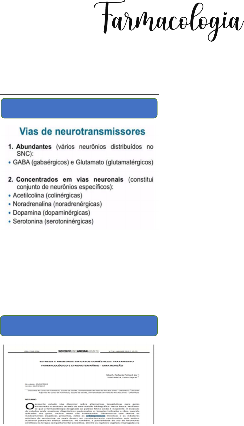 @meedVeet_innova Pt 2 Introdução Os principais alvos dos psicotrópicos são: (1) receptores específicos de neurotransmissores; (2) transportadores de membrana; (3) enzimas, inibindo a degradação e aumentando a concentração de neurotransmissores. ➢ As principais classes de fármacos antidepressivos são: ➢ Inibidores da monoamino-oxidase (IMAO); ➢ Antidepressivos tricíclicos (ADT); ➢ Inibidores seletivos da recaptação de serotonina (ISRS). Inibidores da monoamino-oxidase (IMAO) ➢ A enzima monoamino-oxidase (MAO) está localizada na membrana mitocondrial externa e é expressa na maioria dos tecidos corporais, aparecendo em altos níveis no fígado. ➢ Existem duas isoformas da MAO, sendo que a MAO-A catalisa a degradação da serotonina (5-HT) e noradrenalina (NA), enquanto a MAO-B apresenta maior seletividade por benzilaminas e 2- feniletilaminas. ➢ O efeito farmacológico dos IMAO está relacionado com o aumento da capacidade de armazenamento e liberação dos neurotransmissores 5-HT e NA pelos neurônios no SNC. O principal efeito adverso observado é a hipotensão, levando a diminuição do tônus simpático e consequente redução da pressão arterial sistêmica, mesmo efeito observado da clonidina. Diversos efeitos adversos comuns que podem aparecer com o uso dos IMAO são tremores, insônia, ganho de peso decorrente do aumento de apetite e efeitos anticolinérgicos (boca seca, visão embaçada, retenção urinária, etc.) Fármacos Antidepressivos Neurotransmissores Antidepressivos tricíclicos (ADT) ➢ São fármacos amplamente utilizados para tratar desvios comportamentais em gatos; Exemplo: Amitriptilina, Clomipramina e Doxepina. ➢ Essa classe atua inibindo a recaptação de noradrenalina e serotonina pelas terminações nervosas e bloqueando os receptores de glutamato e canais de sódio. ➢ O tratamento terapêutico com tal classe de fármacos não é recomendado em casos agudos, pois esses fármacos apresentam efeito clínico tardio e devem ser administradas durante 30 dias, no mínimo. ➢ Ainda, podem ser observados alguns efeitos colaterais como sonolência, aumento de peso e até mesmo redução do “grooming”. ➢ Apresentam como principais efeitos adversos o aumento da frequência cardíaca, midríase, redução da produção de lágrimas, retenção urinária e constipação . Obs: Seu uso deve ser feito somente quando necessário e sob orientação profissional. Inibidores seletivos da recaptação de serotonina (ISRS) ➢ Agem de modo a inibir a recaptação pré- sináptica de serotonina e noradrenalina, como consequência elevam a concentração de serotonina e bloqueiam os receptores de acetilcolina, dopamina e noradrenalina. Exemplo: Fluoxetina, Paroxetina, Fluvoxamina, Sertralina e Citalopram. ➢ Embora atuem preferencialmente sobre os receptores serotoninérgicos, os ISRS apresentam em suas estruturas químicas grupamentos fenoxila ou fenila, os quais permitem uma interação molecular junto aos receptores colinérgicos, adrenérgicos e histaminérgicos. ➢ Efeitos colaterais atrelados à ação antagonista: inibição da ingesta de alimentos e eventuais episódios de vômito. ➢ Outras indicações também ocorrem para os ISRS, incluindo o tratamento da ansiedade generalizada, síndrome do pânico, transtorno obsessivo compulsivo e desordens alimentares.