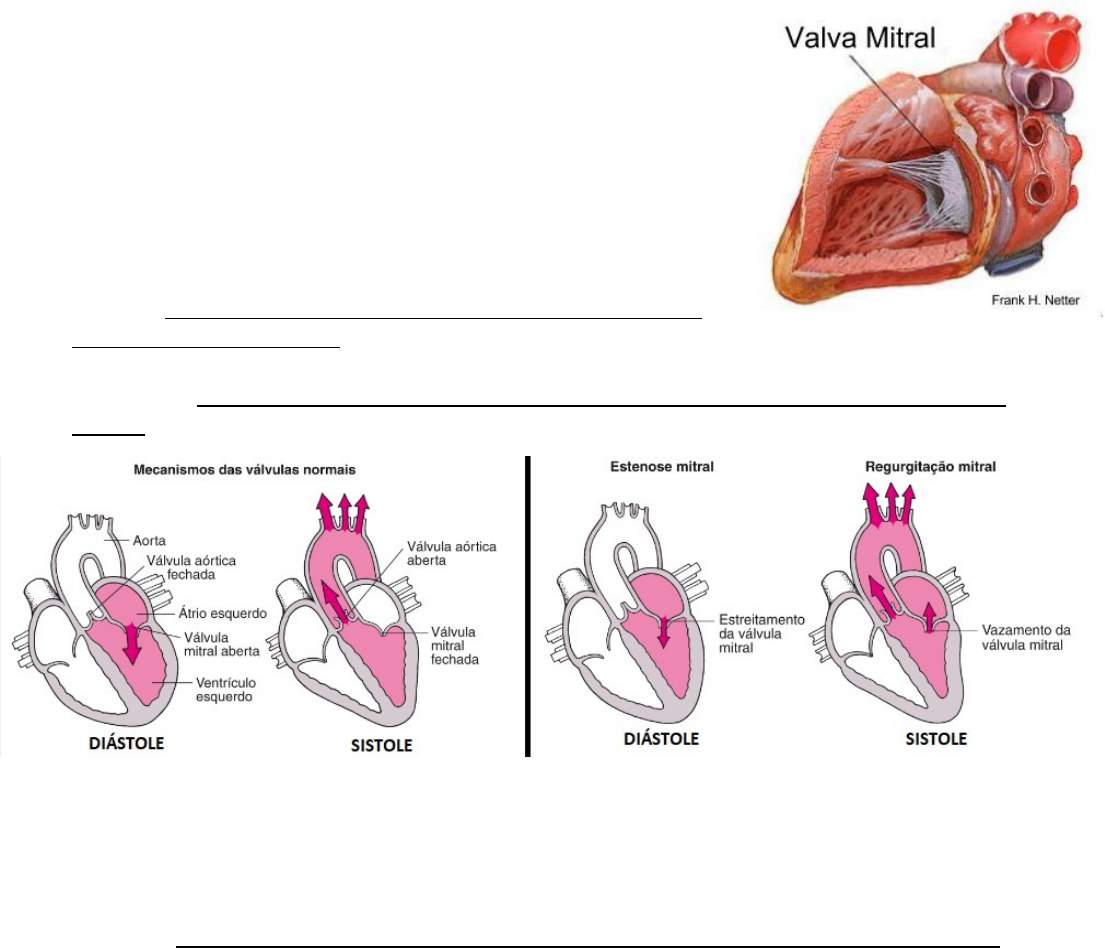 VALVOPATIA MITRAL · A valva mitral é uma valva atrioventricular que se situa entre o átrio esquerdo(AE) e o ventrículo esquerdo(VE), sendo bicúspide, na qual sua função é a de fechar e abrir conforme o ciclo cardíaco, permitindo o fluxo de sangue do AE para o VE durante a diástole e interrompendo o fluxo entre estas duas câmaras durante a sístole · Entretanto, por diversas etiologias, a valva mitral pode ter sua função prejudicada, resultando em consequências para o coração e, mais tardiamente, todo o corpo, como será visto no quadro clínico As patologias das valvas, incluindo a mitral, dividem-se em: · Estenose: É o estreitamento da abertura da valva quando ela deveria estar aberta no ciclo cardíaco, no caso da valva mitral, durante a diástole, prejudicando o enchimento do VE · Insuficiência: É quando a valva permanece aberta no momento do ciclo cardíaco na qual deveria estar fechada, no caso da valva mitral, durante a sístole, permitindo assim o refluxo de sangue para o AE OBS: Uma valva pode ter dupla lesão, ou seja, estenose e insuficiência simultaneamente ESTENOSE MITRAL · Como dito, a estenose mitral é o estreitamento da área de abertura da valva mitral durante a diástole, diminuindo o volume de sangue que é direcionado ao VE, levando a diversas repercussões patológicas na pessoa, a depender da gravidade da estenose mitral ETIOLOGIA · A estenose mitral pode ter uma etiologia congênita ou adquirida, como visto abaixo: CONGÊNITA As causas congênitas ocorrem por erros na formação da valva, estando presentes desde o nascimento, como as abaixo: · Hipoplasia do anel · Fusão das comissuras · Valva em paraquedas · Anel supravalvar · Duplo orifício mitral ADQUIRIDAS É quando a estenose mitral ocorreu secundária a uma doença base, como: · Febre reumática: É a principal etiologia de estenose mitral no Brasil · Degenerativa: Presente sobretudo em idosos, DRC(pela deposição de cálcio na valva), como visto nos países desenvolvidos · Síndrome carcinóide · Doenças infiltrativas · LES · Artrite reumatóide · Doença de Fabry FISIOPATOLOGIA · Quando a valva mitral se abre, o valor normal da área é em torno de 4-6cm2, quando a pessoa possui uma estenose, ocorre diminuição desta área, que promove um aumento no gradiente diastólico entre AE e VE(Pela dificuldade de passagem de sangue entre as câmaras). · Como o AE não consegue esvaziar corretamente, ele começa a possuir uma sobrecarga que é transmitida retrogradamente, que seria para a circulação veno-capilar pulmonar, que possui um aumento pressórico(Resistência vascular pulmonar), sendo que, conforme a doença avança, esse dano retrógrado vai se tornando cada vez maior, passando para a artéria pulmonar, sobrecarga sistólica do VD, visto que agora a pressão na pulmonar está maior, dificultando seu esvaziamento. · Após isso, a sobrecarga cada vez maior no VD leva, à longo prazo, a sua falência, que gera uma insuficiência tricúspide, permitindo o regurgitamento de sangue do VD para o AD, que, assim como o restante das câmaras afetadas, ao longo do tempo também irá sofrer danos, levando a uma hipertensão venosa sistêmica em todo corpo, acarretando em hepatomegalia, esplenomegalia, edema, dentre outros achados ao exame físco · Além disso, como ocorre menor chegada de sangue ao VE(pela falência do VD e estenose da valva mitral), existe menor débito cardíaco, reduzindo a perfusão tecidual e também acarretando em manifestações do quadro clínico, como astenia e dor torácica · Como visto pela fisiopatologia, usualmente a única cavidade poupada nesta patologia é o VE, visto que o dano é no AE e nas estruturas localizadas retrogradamente a ele, portanto, a queda no DC não é por um déficit contrátil nesta câmara OBS: Uma complicações, devido a todo dano gerado pela estenose mitral, é a ocorrência de fibrilação atrial. CLASSIFICAÇÃO DA ESTENOSE MITRAL · A estenose mitral possui graus de gravidade, sendo dividida em estenose mitral leve, moderada ou grave, conforme a área valvar ou gradiente diastólico, como visto na tabela abaixo: GRAU DA LESÃO ÁREA VALVAR GRADIENTE DIASTÓLICO LEVE >1,5cm2 e <2cm2 <5mmHg MODERADA >1,0cm2 e <1,5cm2 Entre 5-10mmHg GRAVE <1,0cm2 >10mmHg OBS: Vale o pior, ou seja, uma área moderada, porém com gradiente grave, significa uma insuf. Mitral grave. QUADRO CLÍNICO O quadro clínico da estenose mitral consiste em: · Dispneia: Geralmente é a principal queixa clínica do paciente, e também a mais frequente · Palpitações · Hemoptise: Pelo aumento da pressão pulmonar, podendo levar a ruptura de veias brônquicas · Rouquidão: Pelo crescimento do AE, que leva a compressão do nervo laríngeo-recorrente · Dor torácica: · Complicações embólicas: Pela alteração no fluxo sanguíneo dentro do coração · Astenia: Pela queda no débito cardíaco, assim como a dor torácica · Edema: Pela congestão venosa sistêmica · Dor abdominal: Promovida pela distensão da cápsula hepática devido a hepatomegalia promovida pela congestão venosa · Ascite: Pela congestão venosa sistêmica EXAME FÍSICO Durante o exame físico, existem achados da estenose mitral: · Ortopneia · Jugular túrgida · Caquexia · Ictus cordis: Usualmente está normal, visto que o VE é poupado · Impulsão do mesocárdio: Pode ser um achado pela aumento do VE · Frêmito diastólico no foco mitral AUSCULTA: Na ausculta, a estenose mitral possui as seguintes características: · Sopro mesodiastólico com reforço pré-sistólico no foco mitral (Rufflar) · M1 Hiperfonética: M1 é o componente mitral da B1(M1+T1), que na estenose mitral está hiperfonética pois a valva, por estar “travada”, ocasiona um barulho maior ao se fechar · Estalido de abertura: Pela maior dificuldade na abertura da valva, gerando um som maior quando ela se abre · P2 Hiperfonética: P2 é o componente pulmonar da B2(A2+P2), que está hiperfonéti