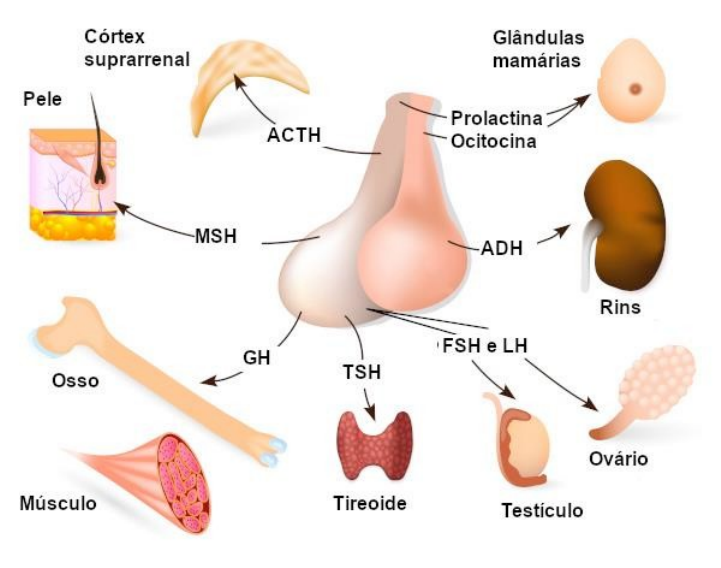Aula 2 - Hormônios hipofisários e seu controle pelo hipotálamo sexta-feira, 2 de dezembro de 2022 11:49 Hormônios hipofisários e seu controle pelo hipotálamo Hipófise - neurohipófise (hipófise posterior) e adenohipófise (hipófise anterior) As células da hipófise podem ser acidófilas ou basófilas Acidófilas - Somatotropos (GH, somatrotofina); Mamotropos (Prolactina) Basófilas - Gonadotrofos (FSH e hormonio luteinizante); tirotropos (TSH e tirotropina) e Corticotropos (H. adenocorticotropa, ACTH e corticotropina) A Hipófise Anterior Contém Vários Tipos Diferentes de Célula Que Sintetizam e Secretam Hormônios. 1. Somatotropos — hormônio do crescimento humano (hGH). 2. Corticotropos — hormônio adrenocorticotrópico (ACTH). 3. Tireotropos — hormônio tireoestimulante (TSH). 4. Gonadotropos — hormônios gonadotrópicos, que compreendem o hormônio luteinizante (LH) e o hormônio foliculoestimulante (FSH). 5. Lactotropos — prolactina (PRL). Os Hormônios da Hipófise Posterior São Sintetizados por Corpos Celulares no Hipotálamo. Os hormônios da hipófise posterior são produzidos no hipotálamo. O HIPOTÁLAMO CONTROLA A SECREÇÃO HIPOFISÁRIA · Sinais hormonais ou nervoso · A hipofise anterior tem sua secreção controlada por hormonios liberadores ou inibidores secretados pelo hipotálamo; (a maior parte são hormonios liberadores) · A hipófise posterior por sinais nervosos. O hipotálamo recebe sinais vindos de diversas partes do sistema nervoso: • Dor • Depressão • Excitação • Estímulos olfativos • Concentrações de nutrientes, eletrólitos, água e hormônios no sangue excitam ou inibem o hipotálamo; O hipotálamo é o centro coletor de informações relativas ao bem-estar interno do organismo e grande parte dessa informação é utilizada para controlar as secreções da hipófise. • Hormônios liberadores e inibidores: produzidos por neurônios especiais no hipotálamo; • Neurônios com origens em diversas áreas do hipotálamo e enviam suas fibras nervosas para a eminência mediana; • Secretam hormônios que são captados pelo sistema porta hipotalâmico-hipofisário e levados para os sinusóides da hipófise anterior. Os principais hormônios liberadores e inibidores do hipotálamo são: 1. Hormonio liberador de tireotropina (TRH): liberação de hormonio estimulante da tireoide 2. Hormonio liberador de corticotropina (CRH): liberação do hormonio adrenocorticotrópico Estimula o corticotropico a produzir e secretar 3. Hormonio liberador do h do crescimento(GHRH): liberação de h. do crescimento e do h. de inibição do h. do crescimento (GHIH) ou somatostatina Inibidor - somatostatina 4. Hormonio liberador de gonadotropina (GnRH): liberação de LH e FSH; 5. Hormonio inibidor da prolactina (PIH): inibe a secreção de prolactina. HORMÔNIO DO CRESCIMENTO (GH) - SOMATROTOPINA ou homonio somatotrófico Promove crescimento vertical, e em espessura do osso, O GH não tem uma glândula alvo. Aumento do tamanho da célula e mitose, multiplicação celular. Efeitos metabólicos do GH: 1. gh promove disposição de proteínas nos tecidos . Aumento do transporte de aminoácidos através das membranas celulas . Aumenta tradução de RNA/transcrição de DNA; . Redução do catabolismo de proteinas -uso de ácidos graxos. 2. gh promove da utilização de gorduras como fonte de energia . Liberação de ácidos graxos do tecido adiposo . O gh aumenta a conversão desses ácidos graxos em acetil CoA e sua utilização como fonte de energia . Poupa proteínas e carboidratos Liberação dos ac graxos, que vao ser utilizados para fornecer energia. Gh poupa glicose 3. Redução na utilização de carboidrados - induz a uma resistencia à insulina - atenuando as ações da insulina 4. GH estimula cresciemento ósseo e de cartilagens . Elevar crescimento esquelético . Aumenta a deposição de proteinas nos tecidos, por células osteogenias e condrocíticas que vão levar ao crescimento . Conversão de condrócido em célula osteogênica: deposição de osso novo. . Quando as epífises se unem o gh promove o crescimento em espessura. . Osteoblastos x Osteoclastos . O gh é forre estimulador dos osteoblatos. - leva a deposição de tecido novo O gh leva o fígado a formar somatomedinas, que apresentam o potente efeito de aumentar todos os aspectos do crescimento ósseo. E muitos dos efeitos dessas somatomedinas, são similares aos efeitos da insulina. E por isso a somatomedina são chamadas de fatores de crescimento semelhantes à insulina (IGF) RESUMO: Hipotálamo induz a produção e secreção de GH pela hipófise anterior que vai agir no fígado e nos ossos, podendo atuar diretamente nos ossos, como tbm indiretamente por meio das somatomedinas. · A principal somatomedina produzida no fígado é somatomedina C ( IGF-1) - tendo uma meia vida mais longa que o GH. Sendo transportada no sangue por proteina produzida em resposta ao GH. · GH possui meia vida curta REGULAÇÃO DA SECREÇÃO DO GH · Secretado na vida toda · Padrão pussátil, liberado em picos do dia - por voltas das 23h/00h · Fatores que podem levar a secreção de GH: jejum, hipoglicemia, baixa concentração de ácidos graxos no sangue, exercícios intensos. · HIPÓFISE POSTERIOR Hormonios produzidos nos corpos celulares nos núcleos paraventricular (ocitocina) e supraótico (vasopressina). E são transportador por neurofisinas até as terminações nervosa na HP. Funções fisiológicas do ADH · Antidiurese · Em presença de ADH: aumenta reabsorção de agua - torna os túbulos mais permeáveis a agua. Regulação · Aumento da osmolaridade do LEC estimula secreção do ADH (Osmorreceptores próximos ao hipotálamo) · Baixa volemia e pressão estimulam ADH