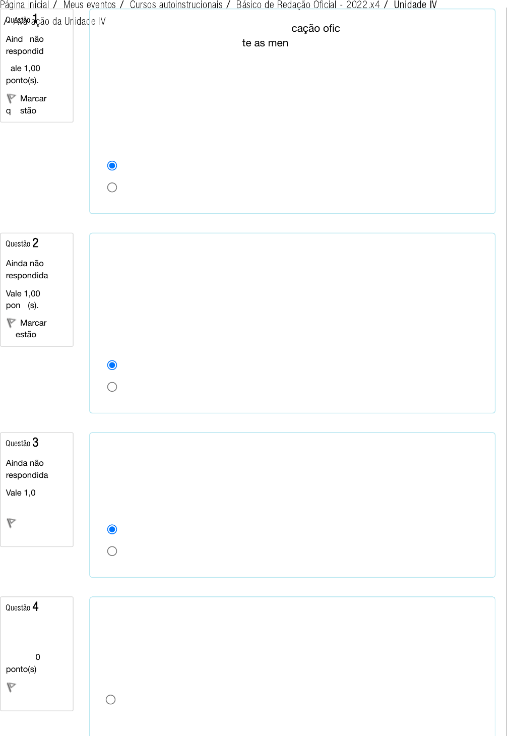 Página inicial / Meus eventos / Cursos autoinstrucionais / Básico de Redação Oficial - 2022.x4 / Unidade IV / Avaliação da Unidade IVQuestão 1 Ainda não respondida Vale 1,00 ponto(s). Marcar questão Questão 2 Ainda não respondida Vale 1,00 ponto(s). Marcar questão Questão 3 Ainda não respondida Vale 1,00 ponto(s). Marcar questão Questão 4 Ainda não respondida Vale 1,00 ponto(s). Marcar questão A Mensagem é o instrumento de comunicação oficial entre os Chefes dos Poderes Públicos, notadamente as mensagens enviadas pelo Chefe do Poder Executivo ao Poder Legislativo para informar sobre fato da administração pública; para expor o plano de governo por ocasião da abertura de sessão legislativa; para submeter ao Congresso Nacional matérias que dependem de deliberação de suas Casas; para apresentar veto; enfim, fazer comunicações do que seja de interesse dos Poderes Públicos e da Nação. Escolha uma opção: Verdadeiro Falso Sobre as recomendações com relação ao uso de e-mails: Não se deve utilizar texto em caixa alta para destaques de palavras ou trechos da mensagem pois denota agressividade de parte do emissor da comunicação e não devem ser remetidas mensagem com tamanho total que possa exceder a capacidade do servidor do destinatário. Escolha uma opção: Verdadeiro Falso Exposição de motivos (EM) é o expediente dirigido ao Presidente da República ou ao Vice-Presidente para: propor alguma medida; submeter projeto de ato normativo à sua consideração; ou informá-lo de determinado assunto. Escolha uma opção: Verdadeiro Falso (AL-RR/ASSISTENTELEGISLATIVO/2018) O correio eletrônico tornou-se uma das principais formas de comunicação para o envio de documentos. A respeito dessa forma, NÃO se deve considerar que: Escolha uma: a. sua característica principal seja a agilidade no envio das informações. https://ead.dpf.gov.br/anpcidada/ https://ead.dpf.gov.br/anpcidada/my/ https://ead.dpf.gov.br/anpcidada/course/index.php?categoryid=3 https://ead.dpf.gov.br/anpcidada/course/view.php?id=1152 https://ead.dpf.gov.br/anpcidada/mod/quiz/view.php?id=20795 Questão 5 Ainda não respondida Vale 1,00 ponto(s). Marcar questão Questão 6 Ainda não respondida Vale 1,00 ponto(s). Marcar questão Questão 7 Ainda não respondida Vale 1,00 ponto(s). Marcar questão b. os recursos de confirmação de leitura ou recebimento devam ser utilizados na mensagem. c. o vocabulário utilizado deva ser mais informal, compatível com uma comunicação oficial. d. para sua aceitação como documento original seja necessária a certificação digital. (TCE-PA/2016) Em relação às finalidades dos textos oficiais, julgue o item seguinte: A mensagem é um expediente de natureza informativa usado por todas as repartições públicas para comunicar-se com os cidadãos. Escolha uma opção: Verdadeiro Falso A exposição de motivos é dirigida a um Ministro de Estado pelo Presidente da República. Escolha uma opção: Verdadeiro Falso (TCE-PA/2016) Em relação às finalidades dos textos oficiais, julgue o item seguinte. A exposição de motivos é o expediente dirigido ao presidente ou ao vice- presidente da República, geralmente emitido por um ministro de Estado. Escolha uma opção: Verdadeiro Falso Sobre as recomendações com relação ao uso de e-mails: Questão 8 Ainda não respondida Vale 1,00 ponto(s). Marcar questão Questão 9 Ainda não respondida Vale 1,00 ponto(s). Marcar questão Questão 10 Ainda não respondida Vale 1,00 ponto(s). Marcar questão Sempre devemos utilizar fundo ou papéis de parede eletrônicos personalizados, pois podem provar que o e-mail é autêntico. Escolha uma opção: Verdadeiro Falso Salvo lei específica, não é dado ao ente público impor a aceitação de documento eletrônico que não atenda os parâmetros da ICP-Brasil. Escolha uma opção: Verdadeiro Falso Sobre forma e estrutura de um e-mail: Local e data, quando especificados no corpo do texto do e-mail, devem sempre ser grafados ao final, antes da assinatura. Escolha uma opção: Verdadeiro Falso Próximo Navegação do questionário ANDERSON KUEHNE Finalizar tentativa ... Tempo restante 0:13:00 1 2 3 4 5 6 7 8 9 10 © 2016 - ACADEMIA NACIONAL DE POLÍCIA VOCÊ ACESSOU COMO ANDERSON KUEHNE (SAIR) https://ead.dpf.gov.br/anpcidada/user/view.php?id=146837&course=1152 https://ead.dpf.gov.br/anpcidada/mod/quiz/summary.php?attempt=280798 https://ead.dpf.gov.br/anpcidada/user/profile.php?id=146837 https://ead.dpf.gov.br/anpcidada/login/logout.php?sesskey=ckGW7t7n5Z