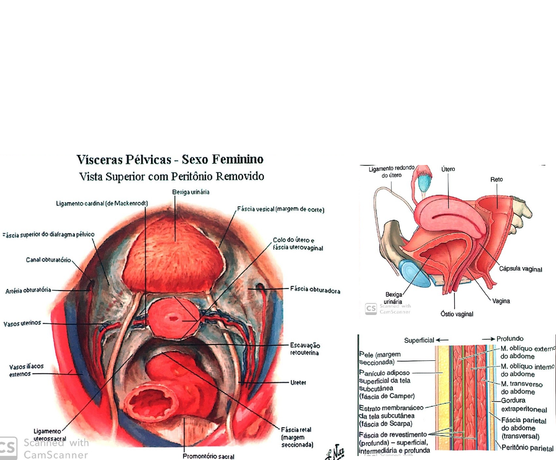 Maria Eduarda Pontes Nozaki - TVII Fáscia da Pelve · Definição: tecido conjuntivo que ocupa o espaço que está situado entre o peritônio membranáceo e as paredes e o assoalho pélvico musculares e que não é ocupado pelas vísceras pélvicas · Fáscia Membranácea da Pelve - é uma continuação da fáscia endoabdominal (entre as paredes musculares abdominais e o peritônio) - no tórax recobre o espaço entre o gradil costal e a pleura parietal - formada pelos componentes parietal e visceral · Parietal - lâmina membranácea de espessura variável que reveste a face interna dos músculos que formam as paredes e o assoalho da pelve — obturador interno, piriforme, isquiococcígeo, levantador do ânus - e parte dos músculos esfíncteres da uretra - partes específicas da fáscia parietal recebem o nome do músculo que cobrem (ex: fáscia obturatória) - fáscia forma espaços ocos entre os órgãos: paracisto (bexiga), paracolpo (vagina), paraprocto (reto), paramétrio (útero) - espaços são preenchidos por tecido conjuntivo areolar e gordura fáscia endopélvica (preenche e dá sustentação aos órgãos) - em alguns lugares a fáscia areolar fica mais densa formando estruturas ligamentares - Ligamento Pubovesical: fundo (base) da bexiga urinária ao púbis. - Ligamento Transverso do útero: colo do útero e fórnice da vagina até as paredes laterais da pelve - Ligamento Sacrouterino · Visceral - consiste na fáscia membranácea que reveste diretamente os órgãos pélvicos - junção entre a visceral e a parietal forma o arco tendíneo da fáscia visceral da pelve (faixa bilateral contínua do púbis até o sacro) *Obs: o peritônio está acima da fáscia membranácea da pelve
