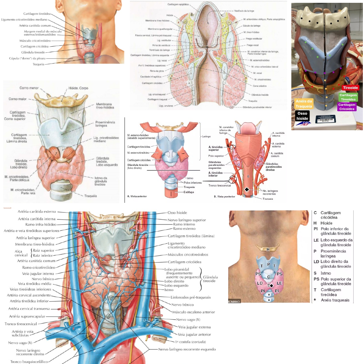 Maria Eduarda Pontes Nozaki - TVII Glândula Tireoide e Paratireoide · Glândula Tireoide · Localização: parte anterior do pescoço, no nível das vértebras C5 a T1, profundamente aos músculos esternotireóideo e esterno-hióideo · Morfologia - possui 2 lobos (direito e esquerdo) que são conectados entre si por uma parte central denominada istmo da glândula tireoide (anteriormente ao segundo e terceiro anéis traqueais) - glândula está envolvida por uma cápsula de tecido conjuntivo - contém 2 tipos de células: células foliculares (localizadas nos folículos tireoidianos – produz T3 e T4) e células parafoliculares (localizadas entre os folículos - regula o metabolismo de cálcio, principalmente suprindo a reabsorção óssea) · Sintopia: ântero-inferior ao pescoço; ântero-lateral à traqueia; abaixo da laringe; anterior ao esôfago · Glândulas Paratireoides · Localização: situa-se entre as margens do lobo posterior da glândula tireoide e sua cápsula - pequenas estruturas ovoides ou lentiformes com coloração marrom-amareladas - existem 2 de cada lado (superior e inferior) - cada glândula paratireoide possui uma fina cápsula de tecido conjuntivo com septos intraglandulares - secretam o hormônio paratireoideo (PTH): controle do nível e da distribuição de cálcio e fósforo - órgãos-alvo: ossos, trato digestório (intestino) e rins - efeito geral do PTH é o aumento dos níveis plasmáticos de cálcio e a diminuição dos níveis plasmáticos de fosfato · Sintopia: posterolateralmente à tireoide; medialmente às artérias carótidas comuns e lateralmente a traqueia · Vascularização · Arterial: arco da aorta tronco braquiocefálico artéria subclávia tronco tireocervical artéria tireóidea (lado direito) artérias tireoides inferiores (suprem, principalmente, a face posterior) e superiores (suprem, principalmente, a face anterossuperior da glândula) - lado esquerdo: artéria subclávia tem origem direta do arco da aorta · Venosaveia tireoide inferiores - veia tireoide superiores + veia tireoide médias veia jugular interna veia braquiocefálica veia cava superior · Linfática: linfonodos cervicais superficiais linfonodos cervicais profundos tronco jugular ducto linfático direito ou ducto linfático (Esquerdo) AVD ou AVE · Trígonos das Regiões Anterior · Trígono Carotídeo - contém: artéria carótida comum (bifurca-se em artérias carótidas interna e externa – nível superior da cartilagem tireóidea), veia jugular interna e nervo vago (NC X), hipoglosso (NC XII), acessório (NC XI) · Limites - Posterior: músculo esternocleidomastoideo - Anterior: músculo omo-hióideo - Antero-superior: músculo digástrico · Trígono Muscular: músculos infra-hióideos, linha mediana do pescoço e homoioide - divisão da anterior para posterior: musculo esternocleidomastoide · Limites - Anterior: linha mediana do pescoço - Posterior: margem anterior do músculo esternocleidomastoide - Superior: margem inferior da mandíbula - Ápice: incisura jugular no manúbrio - Teto: tela subcutânea que contém o músculo platisma - Assoalho: faringe, laringe e glândula tireoide. *Obs: 1) Região anterior é mais comum em cirurgias região lateral é mais comum em neurocirurgião ou ortopedia 2) Trígono lateral: veia jugular externa, ramos laterais do tronco tireocervical, a 3° parte da artéria subclávia e parte da artéria occipital, ramos cutâneos do plexo cervical, plexo braqueal, ramos do plexo cervical, nervo acessório, nervo supraescapular, linfonodos cervicais superficiais e profundos, musculo escalenos · Bainha Carotídea - estende desde o trígono carótico até o trígono muscular - contém: artérias carótidas interna, veia jugular interna, nervo vago (NC X), vasos e linfonodos cervicais profundos, nervo do seio carótico, fibras nervosas simpáticas (plexos periarteriais caróticos), nervo laringorrecorrente, nervo frênico, TS, nervo hipoglosso *Obs: Glomo carotídeo é responsável pela captação a quantidade de gas carbônico e pressão arterial lesões pode levar a alterações hemodinâmicas severas devido a perda do controle da PA e níveis de gases, controle de FR e FC · Planos teciduais · Fáscia superficial (tecido subcutâneo): pele, lâmina de tecido conectivo, vasos, nervos, gordura e músculo platisma. · Fáscia Cervical Profunda - formada por 3 laminas - entre as laminas há a formação de compartimentos que comunicam a região cervical com o mediastino e que formam a bainha carótica - Espaço Pré Traqueal (ou Pré – Visceral): área entre a lamina superficial e pré traqueal comunica região cervical e mediastino (ex: metástase de tumor cervical para mediastino, sangramentos e infecções) - Espaço Retrofaríngeo: entre a fascia bucofaringea e a fascia pré vertebral · Lâmina Pré – Traqueal: sustentam as vísceras - presente na parte anterior do pescoço - estende-se do hióide ao pericárdio - envolve: músculos infra-hióideos e glândula tireoide - forma a alça do músculo digástrico · Lâmina Cervical Superficial: sustentam os músculos - envolve todo o pescoço - dividida em camada superficial e profunda - camada superficial envolve musculo trapézio e esternocleidomastóideo e a glândula submandibular - forma a cápsula fibrosa da parótida · Lamina Pré Vertebral: isola os músculos profundos do pescoço e a coluna vertebral - estende-se da base do crânio até T3 - contínua com a bainha axilar - envolve: coluna vertebral e músculos associados. *Obs: 1) Fascia pré traqueal se une a membrana bucofaringea (deve ser seccionada também para retirar) 2) Fáscia alar: situada no espaço retrofaríngeo e promove a união entre as 2 bainhas carotídeas · Visão para Acesso Cirúrgico: pele tecido subcutâneo músculo platisma fáscia cervical superficial lamina superficial da fáscia cervical profunda afasta os músculos infra-hióides abre fáscia pré traqueal tireoide fascia bucofaríngea - ac