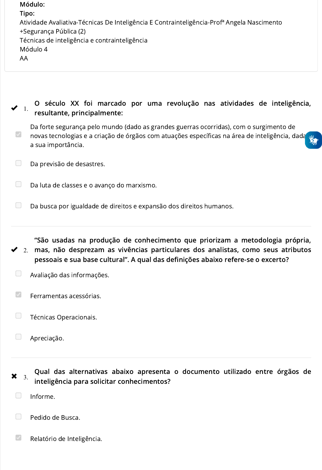 01/02/2023 11:08 UNINA https://cursor.unina.edu.br/Account/Questionario.aspx?token=U3R1ZGVudENsYXNzSWQ9ODc4OTk4JlF1ZXN0aW9ubmFpcmVJZD0xNzA3MC… 2/5 O século XX foi marcado por uma revolução nas atividades de inteligência, resultante, principalmente: Da forte segurança pelo mundo (dado as grandes guerras ocorridas), com o surgimento de novas tecnologias e a criação de órgãos com atuações especí�cas na área de inteligência, dada a sua importância. Da previsão de desastres. Da luta de classes e o avanço do marxismo. Da busca por igualdade de direitos e expansão dos direitos humanos. “São usadas na produção de conhecimento que priorizam a metodologia própria, mas, não desprezam as vivências particulares dos analistas, como seus atributos pessoais e sua base cultural”. A qual das de�nições abaixo refere-se o excerto? Avaliação das informações. Ferramentas acessórias. Técnicas Operacionais. Apreciação. Qual das alternativas abaixo apresenta o documento utilizado entre órgãos de inteligência para solicitar conhecimentos? Informe. Pedido de Busca. Relatório de Inteligência. Módulo: Tipo: Atividade Avaliativa-Técnicas De Inteligência E Contrainteligência-Profª Angela Nascimento +Segurança Pública (2) Técnicas de inteligência e contrainteligência Módulo 4 AA 1. 2. 3. 01/02/2023 11:08 UNINA https://cursor.unina.edu.br/Account/Questionario.aspx?token=U3R1ZGVudENsYXNzSWQ9ODc4OTk4JlF1ZXN0aW9ubmFpcmVJZD0xNzA3MC… 3/5 Estimativa. A contrainteligência é dividida em segmentos que tratam de assuntos especí�cos, dentre eles, está o segmento que trata da produção do conhecimento, sendo denominado de: Segurança Complexa. Segurança Ativa. Segurança de Assuntos Internos. Segurança Orgânica. A atividade de Inteligência se subdivide em dois ramos, são eles: Contrainteligência e Anti-inteligência. Inteligência e Contrainteligência. Inteligência e Vigilância. Contraespionagem, Inteligência e Anti-inteligência. Assinale a alternativa que apresenta medidas defensivas tomadas na tentativa de detectar uma possível vigilância adversa: Contraturno. Contrainteligência. Contravigilância. Vigilância. As atividades de inteligência são citadas desde os primórdios das civilizações, no entanto, é possível a�rmar que o primeiro registro histórico se encontra: Nas Pirâmides do Egito. Na Bíblia Sagrada. 4. 5. 6. 7. 01/02/2023 11:08 UNINA https://cursor.unina.edu.br/Account/Questionario.aspx?token=U3R1ZGVudENsYXNzSWQ9ODc4OTk4JlF1ZXN0aW9ubmFpcmVJZD0xNzA3MC… 4/5 Na Grécia Antiga. Na Idade Média. É o tipo de entrevista que ocorre quando o entrevistador não esconde sua condição de policial: Encoberta. Mista. Ostensiva. Elicitação. “Caracteriza a atividade de ISP como uma produtora de conhecimentos precisos, claros e imparciais, de tal modo que consiga expressar as intenções, óbvias ou subentendidas, dos alvos envolvidos ou mesmo as possíveis ou prováveis consequências dos fatos relatados”. A qual característica da Inteligência de Segurança Pública o excerto se refere? Produção de Conhecimento. Verdade com Signi�cado. Assessoria. Ações Especializadas. Qual das alternativas abaixo apresenta o produto de todas as ações sistemáticas materializado nos Relatórios de Inteligência? Conhecimento Criminal. Conhecimento de inteligência. Ações de Inteligência. Documento informação. 8. 9. 10. 01/02/2023 11:08 UNINA https://cursor.unina.edu.br/Account/Questionario.aspx?token=U3R1ZGVudENsYXNzSWQ9ODc4OTk4JlF1ZXN0aW9ubmFpcmVJZD0xNzA3MC… 5/5 UNINA Copyright © 2011 - 2023. Todos direitos reservados.