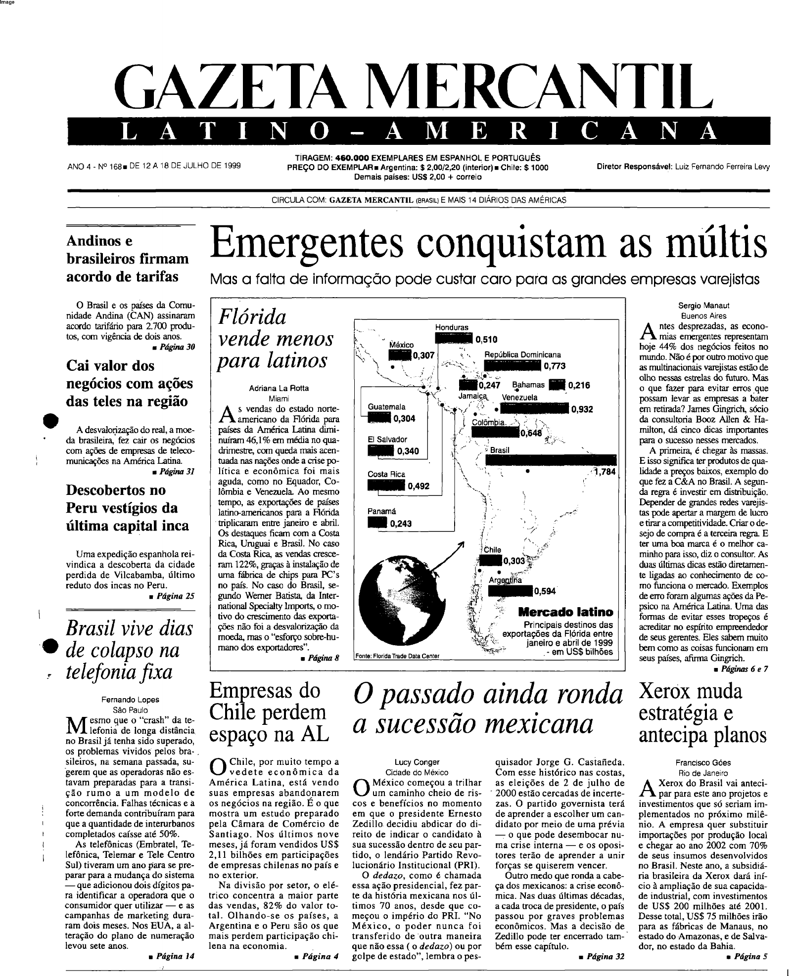 ANO 4 - N° 168: DE 12 A 19 DE JULHO DE 1999 PREÇO oo E×E|v|Pt_An1 Argentina: s 2.00;2,20 (interior) 1 chile; s 1000 Diretor Responsável: Luiz Fernenoo Ferreiro Lew