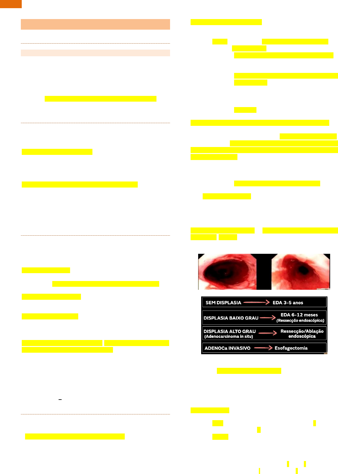 1 Luana Mascarenhas Couto 18.2- EBMSP Doença do Refluxo Gastroesofágico (DRGE) Introdução Definição: O refluxo gastroesofágico é fisiológico, contudo quando há causa disfunção na vida do paciente diz que há uma Doença do refluxo. Nesta patologia há uma perda do mecanismo antirrefluxo, ou seja, o esfíncter esofagiano inferior está relaxado por hipotonia ou por um relaxamento espontâneo. Quadro Clínico O quadro clínico é dividido em quadro típico e quadro atípico, de modo que: - Sintomas Típicos/esofágicos: Pirose ou queimação retroesternal; Regurgitação; - Sintomas atípicos/respiratórios/extraesofágicos: são sintomas que não ocorrem por inflamação direta da mucosa esofágica, de modo que encontraremos: Tosse e Rouquidão; Broncoespasmos e Pneumonia de repetição. Diagnóstico O diagnóstico da DRGE é realizado através de: - Quadro Clínico; - Prova terapêutica: neste caso prescreve-se o tratamento padrão do DRGE, caso tenha dado certo dizemos que há o diagnóstico. Essa prova terapêutica é feita por 2 semanas. -pHmetria de 24 horas: É feita quando não se consegue realizar o diagnóstico pela prova terapêutica Padrão-ouro. OBS: Impedanciometria: é um novo exame no mercado que se consegue diagnosticar os refluxos ácidos, como os não ácidos. - Endoscopia digestiva alta (EDA): é feita quando há sinais de alarme ou complicações, sendo estes: Dispepsia + anemia; Perda de peso; Icterícia; Odinofagia; Disfagia; Idade > 45 anos. Tratamento O tratamento da DRGE se dá por meio de: - Medidas antirrefluxo ou comportamentais: Dieta controlada; Elevar a cabeceira; Perder peso; Não comer 2-3 horas antes de deitar. - Tratamento medicamentoso: é feito através de: Inibidores de bomba de prótons (IBP): realizado 1x/dia de manhã, 30 minutos antes do café da manhã, por 8 semanas Tratamento definitivo. Se fez a prova terapêutica por 2 semanas e diagnosticou a DRGE devemos realizar o tratamento definitivo por 6 semanas; Se fez a prova terapêutica por 2 semanas e não melhorou, deve-se dobrar a dose na 2ª semana: 2 comprimidos pela manhã ou 1 de manhã e 1 à noite. Se não melhorou na 2ª semana, diz-se que o paciente é refratário. - Tratamento cirúrgico: é feito em pacientes refratários, ou seja, aquele paciente que fez a prova terapêutica dobrada por 2 semanas e não melhorou. Outras indicações são: pacientes com sintomas recorrentes (responde ao IBP, mas quando retira ele piora) ou pacientes com complicações (estenose e úlcera). Recorrente: Sintomas leves: usar IBP por livre demanda; Sintomas moderados/grave: cirurgia. OBS: ESÔFAGO DE BARRET NÃO É INDICAÇÃO CIRURGICA, mas é uma complicação da DRGE. É uma metaplasia intestinal, que ocorre com transformação do epitélio escamoso para cilíndrico. O paciente geralmente é assintomático. O diagnóstico é feito através de EDA, onde iremos ver um aspecto vermelho salmão e o diagnóstico definitivo é feito através da biópsia. O tratamento desta condição depende do quadro da metaplasia. OBS1: Exames pré-operatórios: neste caso devemos solicitar 2 exames: Phmetria de 24 horas (para confirmação diagnóstica) e esofagomanometria (para escolher a melhor técnica cirúrgica). Existem 2 técnicas disponíveis, sendo elas: - Fundoplicatura: pode ser feita de maneira: Total: faz quando a Manometria está normal Fundoplicatura de Nissen (válvula de 360º); Parcial: feita quando há uma dismotilidade, ou seja, Manometria alterada. Pode ser feita de maneira anterior ou posterior: Anterior: técnica de Dor e Thal; Posterior: técnica de Lind e Toupet (DICA- Quer ficar lindão? Joga o Topete para trás).