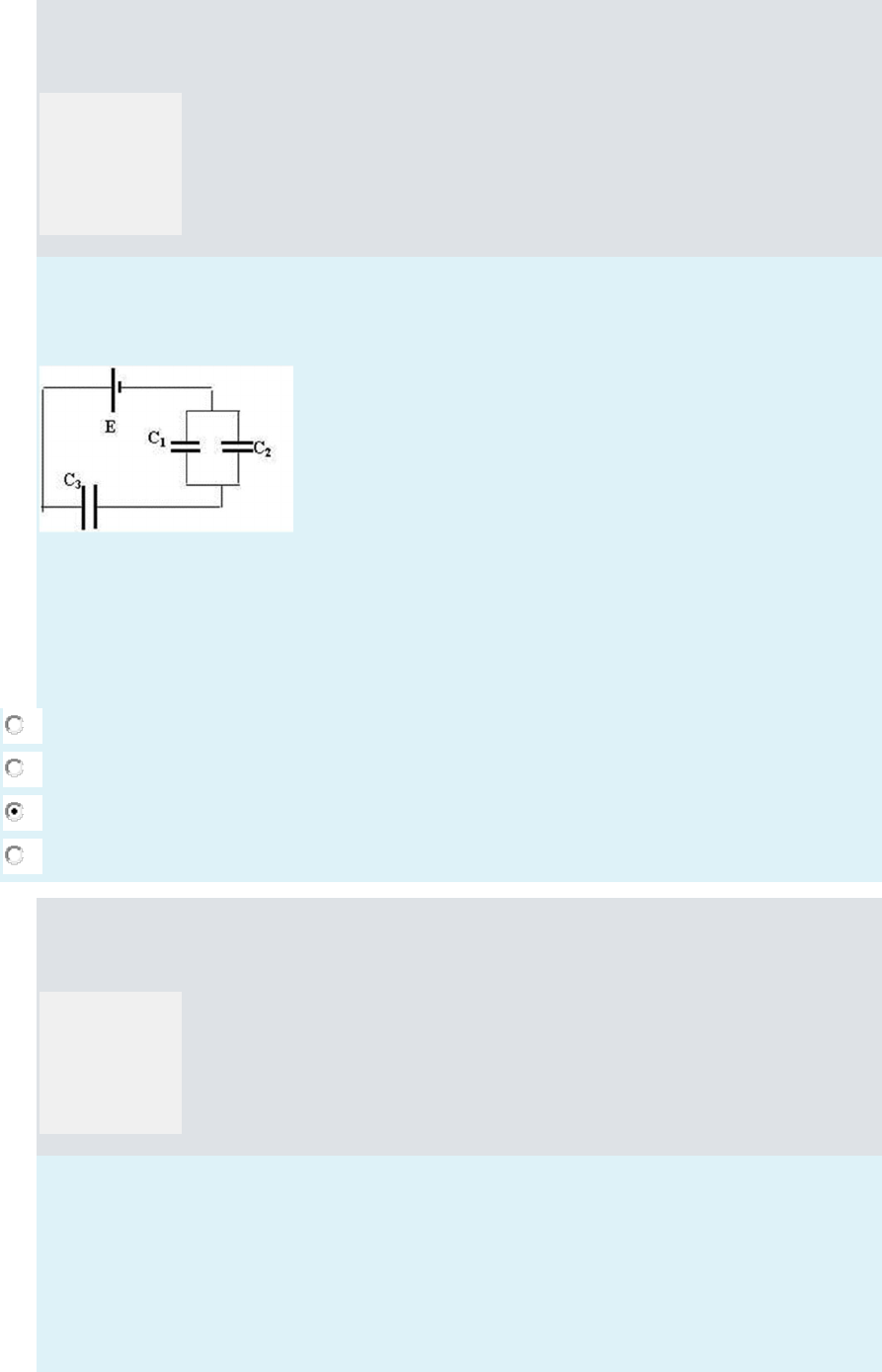 Questão 1 Completo Atingiu 3,00 de 3,00 Remover marcação Texto da questão Considere o circuito abaixo, onde E=10V, C1= 2μF, C2 = 3µF e C3 = 5μF. De acordo com essas informações, é INCORRETO afirmar que a carga: Escolha uma opção: a. Em C1 é 10µC b. Em C3 é 25μC c. Fornecida pela bateria é 10µC d. Em C2 é 15μC Questão 2 Completo Atingiu 3,00 de 3,00 Remover marcação Texto da questão O potencial elétrico gerado por uma configuração de carga em um ponto é dado por V=(x−2)2(y+1)2(z−1)3VV=(x−2)2(y+1)2(z−1)3V.Usando coordenadas retangulares podemos afirmar que o campo elétrico na origem é: Escolha uma opção: a. E⃗ (0,0,0)=16(x^−3y^+z^)V/mE→(0,0,0)=16(x^−3y^+z^)V/m b. E⃗ (0,0,0)=−16(x^−y^+3z^)V/mE→(0,0,0)=−16(x^−y^+3z^)V/m c. E⃗ (0,0,0)=−16(3x^−y^+z^)V/mE→(0,0,0)=−16(3x^−y^+z^)V/m d. E⃗ (0,0,0)=16(x^−y^+3z^)V/mE→(0,0,0)=16(x^−y^+3z^)V/m Questão 3 Completo Atingiu 3,00 de 3,00 Remover marcação Texto da questão Uma casca esférica de raio a possui densidade superficial de carga uniformemente distribuída sobre sua superfície. O fluxo de campo sobre uma superfície gaussiana de raio a será: Escolha uma opção: a. ΦE=E4πa2ΦE=E4πa2 b. ΦE=4πϵ0a2ΦE=4πϵ0a2 c. ΦE=14πϵ0a2ΦE=14πϵ0a2 d. ΦE=14πϵ0qr2ΦE=14πϵ0qr2 Questão 4 Completo Atingiu 3,00 de 3,00 Remover marcação Texto da questão Um capacitor ideal de placas paralelas está ligado a uma fonte de 12,0 volts. De repente, por um processo mecânico, cada placa é dobrada sobre si mesma, de modo que a área efetiva do capacitor fica rapidamente reduzida à metade. A fonte é mantida ligada em todos os instantes. Nessa nova situação, pode-se afirmar, em relação àquela inicial, que: Escolha uma opção: a. o campo elétrico e a carga não mudam de valor. b. o campo elétrico dobra e a carga acumulada também. c. o campo elétrico dobra e a carga fica reduzida à metade. d. o campo não muda, mas a carga fica reduzida à metade. Questão 5 Completo Atingiu 3,00 de 3,00 Remover marcação Texto da questão Quando um elétron se move de A até B, ao longo da linha de campo elétrico como mostrado na figura). O campo elétrico realiza um trabalho de 3,94x10-19 J. Podemos afirmar que a diferença de potencial entre os pontos C e B é: Escolha uma opção: a. VC - VB = 2,46 V b. VC - VB = 0 V c. VC - VB = - 2,46 V d. VC - VB = VC - VA Questão 6 Completo Atingiu 3,00 de 3,00 Remover marcação Texto da questão Um corpo A fica eletrizado negativamente quando atritado em um corpo B e, em seguida, são colocados em suportes isolantes. Quando as barras metálicas C e D tocam, respectivamente, A e B, ocorre transferência de: Escolha uma opção: a. prótons de A para C e elétrons de B para D. b. elétrons de C para A e prótons de D para B. c. prótons de A para C e de D para B. d. elétrons de A para C e de D para B. Questão 7 Completo Atingiu 0,00 de 3,00 Remover marcação Texto da questão Dados três capacitores de capacitância iguais. Cada um como uma capacitância c, dentre todas as associações possíveis a única que não está correta é: Escolha uma opção: a. 3C23C2 b. C3C3 c. 2C32C3 d. 3C3C Questão 8 Completo Atingiu 3,00 de 3,00 Remover marcação Texto da questão Um contador Geiger possui um cilindro metálico com 2cm de diâmetro, tendo estendido ao longo do seu eixo um fio de 1,3 x 10-4 cm de diâmetro. Se aplicarmos 850 V entre eles, O campo elétrico na superfície do fio será: Escolha uma opção: a. E = 13,6 . 106 N/C b. E = 136 . 106 N/C c. E = 1,36 . 106 N/C d. E = 1,36 . 104 N/C Questão 9 Completo Atingiu 3,00 de 3,00 Remover marcação Texto da questão Uma carga elétrica de 5,0 x10-6 C é posta num ponto do espaço, onde fica sob a ação de uma força elétrica de 10 N, para o norte. Nesse referido ponto, o campo elétrico tem intensidade de: Escolha uma opção: a. 0,5 x10-6 N/C e dirige-se para o norte. b. 0,5 x10-6 N/C e dirige-se para o sul. c. 0,5 x10-6 N/C e dirige-se para o sul. d. 2x106 N/C e dirige-se para o norte. Questão 10 Completo Atingiu 0,00 de 3,00 Remover marcação Texto da questão A figura Representa uma configuração de duas cargas de mesmo modulo e sinais contrários separadas por uma distância d. Os pontos M e N estão equidistantes da origem em seus respectivos eixos cartesianos. O campo elétrico nos pontos M e N estão corretamente representados no esquema da figura: Escolha uma opção: a. b. c. d. Questão 11 Completo Atingiu 0,00 de 3,00 Remover marcação Texto da questão Uma carga q é colocada no interior de uma casca esférica grossa, de raio interno a e raio externo b. Sobre essa configuração de carga podemos dizer que: Escolha uma opção: a. O campo elétrico em r > b é zero. b. O campo elétrico entre a e b é E⃗ =14πϵ0qr2E→=14πϵ0qr2 c. O campo elétrico entre a e b é zero. d. O campo elétrico em r < a é zero. Questão 12 Completo Atingiu 0,00 de 3,00 Remover marcação Texto da questão A figura Representa uma configuração de duas cargas de mesmo módulo e sinais contrários, separadas por uma distância d. O campo elétrico no ponto N que está a uma altura z do centro que une as duas cargas é: Escolha uma opção: a. E⃗ =14πϵ02qd(z2+d24)32z^E→=14πϵ02qd(z2+d24)32z^ b. E⃗ =14πϵ02qd(z2+d24)32x^E→=14πϵ02qd(z2+d24)32x^ c. E⃗ =−14πϵ02qd(z2+d24)32z^E→=−14πϵ02qd(z2+d24)32z^ d. E⃗ =−14πϵ02qd(z2+d24)32x^E→=−14πϵ02qd(z2+d24)32x^ Questão 13 Completo Atingiu 3,00 de 3,00 Remover marcação Texto da questão A intensidade da força elétrica entre duas cargas q, quando separadas por uma distância d, é F. Suponha que uma carga q1 = q seja colocada frente a duas outras cargas, q2 = 3q e q3 = 4q, segundo a disposição mostrada na figura. A intensidade da força elétrica resultante sobre a carga q1, devido às cargas q2 e q3, será: Escolha uma opção: a. 5F b. 2F c. 4F d. 3F Questão 14 Completo Atingiu 3,00 de 3,00 Remover marca