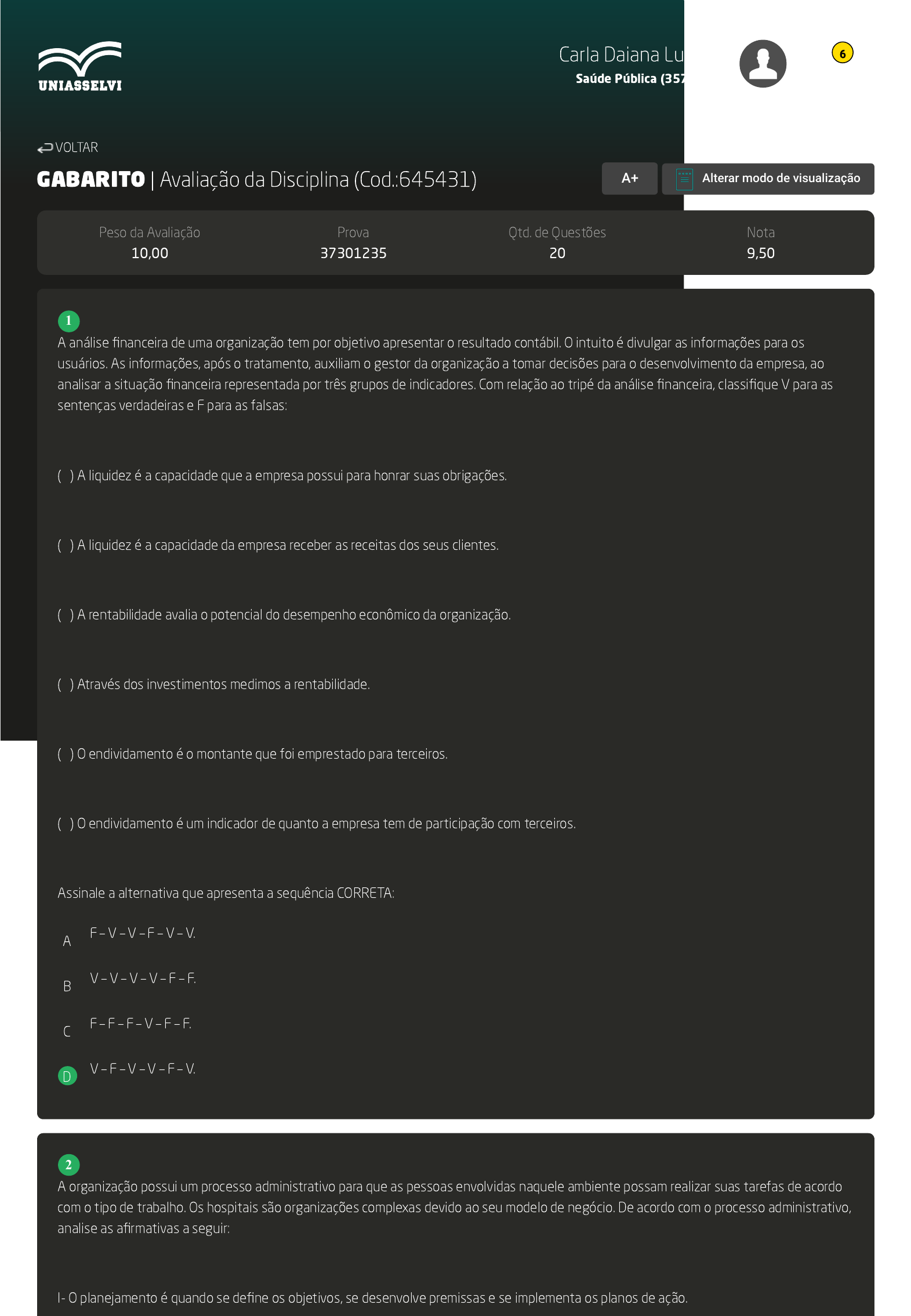 GABARITO | Avaliação da Disciplina (Cod.:645431) Peso da Avaliação 10,00 Prova 37301235 Qtd. de Questões 20 Nota 9,50 A análise financeira de uma organização tem por objetivo apresentar o resultado contábil. O intuito é divulgar as informações para os usuários. As informações, após o tratamento, auxiliam o gestor da organização a tomar decisões para o desenvolvimento da empresa, ao analisar a situação financeira representada por três grupos de indicadores. Com relação ao tripé da análise financeira, classifique V para as sentenças verdadeiras e F para as falsas: ( ) A liquidez é a capacidade que a empresa possui para honrar suas obrigações. ( ) A liquidez é a capacidade da empresa receber as receitas dos seus clientes. ( ) A rentabilidade avalia o potencial do desempenho econômico da organização. ( ) Através dos investimentos medimos a rentabilidade. ( ) O endividamento é o montante que foi emprestado para terceiros. ( ) O endividamento é um indicador de quanto a empresa tem de participação com terceiros. Assinale a alternativa que apresenta a sequência CORRETA: A F – V – V – F – V – V. B V – V – V – V – F – F. C F – F – F – V – F – F. D V – F – V – V – F – V. A organização possui um processo administrativo para que as pessoas envolvidas naquele ambiente possam realizar suas tarefas de acordo com o tipo de trabalho. Os hospitais são organizações complexas devido ao seu modelo de negócio. De acordo com o processo administrativo, analise as afirmativas a seguir: I- O planejamento é quando se define os objetivos, se desenvolve premissas e se implementa os planos de ação. VOLTAR A+ Alterar modo de visualização 1 2 Carla Daiana Ludwig Saúde Pública (3575705) 6 II- A organização do trabalho é quando se tem a divisão e o agrupamento das atividades, orientação das pessoas, reorganização dos recursos e coordenação dos esforços. III- A direção é quando existe uma direção parcial para a liderança, a motivação, o gerenciamento dos conflitos e a recompensa aos funcionários. IV- O controle é a necessidade de controlar as necessidades da organização, definição de padrões, monitoramento, comparação do desempenho e tomadas de ações para garantir os objetivos. Assinale a alternativa CORRETA: A As afirmativas II e III estão corretas. B Somente a afirmativa II está correta. C As afirmativas I, II e IV estão corretas. D Somente a afirmativa I está correta. Um determinado hospital possui ativos totais (bens e direitos) de R$ 2 milhões e passivos (obrigações) de R$ 1 milhão. Se considerar que capital próprio tem um custo de 20% e o capital de terceiros 10%, qual o custo médio ponderado de capital? A 16,67%. B 13,33%. C 15,00%. D 10,00%. Dentro do plano de negócios, o planejamento financeiro ocupa lugar de destaque, pois demonstra a capacidade da nova empresa quanto à viabilidade financeira. Dito isso, assinale V para verdadeiro e F para falso nas alternativas que seguem: ( ) O planejamento financeiro é responsável pelos valores empregados no investimento. ( ) O planejamento financeiro é responsável por diferenciar investimentos de despesas administrativas. ( ) O planejamento financeiro é responsável por analisar se o produto/serviço será afetado pela sazonalidade. Assinale a alternativa que apresenta a sequência correta de respostas: A V – V – V. B V – F – F. C V – V – F. 3 4 Carla Daiana Ludwig Saúde Pública (3575705) 6 D V – F – V. Uma organização é a soma de vários elementos orientados para um objetivo em comum, visando sempre a qualidade. Segundo Maximiano (1992, p. 14) "uma organização é uma combinação de esforços individuais que tem por finalidade realizar propósitos coletivos. Por meio de uma organização torna-se possível perseguir e alcançar objetivos que seriam inatingíveis para uma pessoa. Uma grande empresa ou uma pequena oficina, um laboratório ou o corpo de bombeiros, um hospital ou uma escola são todos exemplos de organizações." MAXIMIANO, ANTONIO CESAR A. Introdução a administração. 3. ed. São Paulo: Editora Atlas, 1992. Sobre Organização Hospitalar assinale a alternativa correta: A Dentre as classificações hospitalares tem-se por especialidade e pela permanência na unidade hospitalar. O primeiro determinando se a permanência é longa ou curta e o segundo determinando se o hospital é do tipo geral ou especialista. B As organizações hospitalares podem ser ou não voltadas para o lucro, são em sua grande maioria de alta complexidade organizacional devido aos tipos de departamentos e processos internos presentes na sua estrutura. C De acordo com o Ministério da Saúde as organizações hospitalares têm como única e principal função fornecer serviços à população de tal forma que alcancem os melhores lucros. D As organizações hospitalares não possuem o lucro como objetivos, uma vez que seu único e principal objetivo é o atendimento ao paciente/cliente. A demonstração do Fluxo de Caixa deve ser entendida como a diferença entre as receitas e despesas, em um determinado período, realizadas pela organização. Esse entendimento é muito importante para o gestor observar como o fluxo de caixa é formado. Existe uma atividade na Demonstração do Fluxo de caixa que é possível evidenciar por meio de dois métodos, o direto e o indireto. Sobre o exposto, assinale a alternativa CORRETA: A Atividade operacionais que causam prejuízo. B Atividade de investimento. C Método de elaboração da DFC. D Atividade de financiamento. Ser empreendedor é ter iniciativa para criar algo novo e de valor para os clientes/mercado. Há três elementos que são de extrema importância na formação do empreendedor: a família, a escola e a sociedade. Diante disso, analise e associe os itens que seguem: I – Família II – Sociedade 5 6 7 Carla Daiana Ludwig Saúde Pública (3575705) 6 III - Escola ( ) A convivê