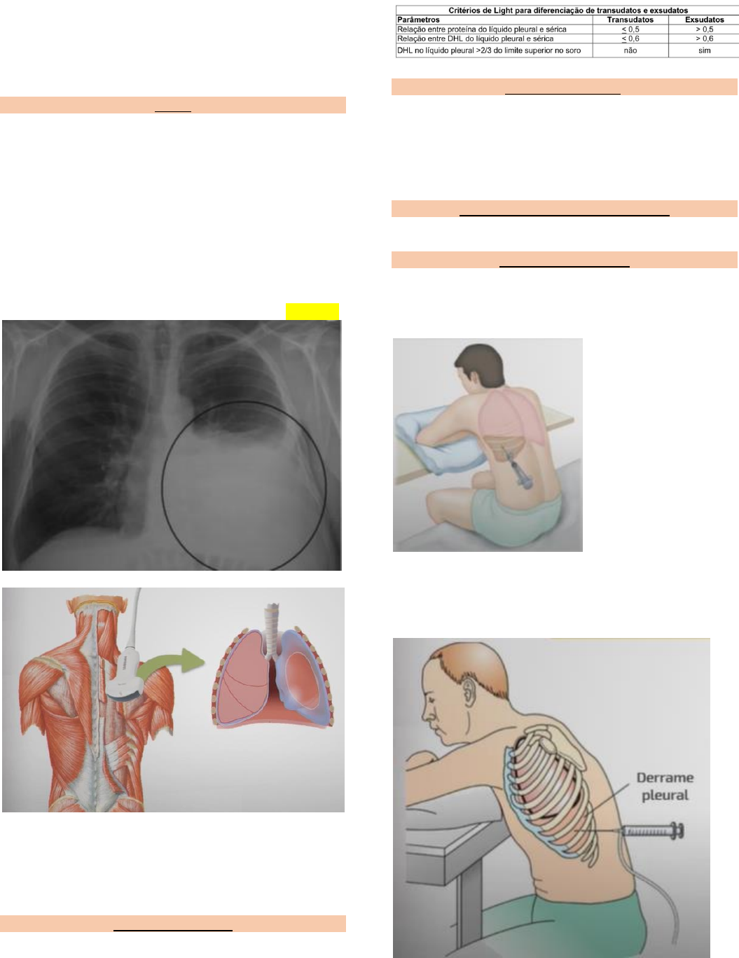 GABRIELA D. BRASIL | MEDICINA – UESB 1 TORACOCENTESE E DRENAGEM DE TÓRAX TORACOCENTESE GERAL • Método para obter líquido pleural (que normalmente é de 5-10mL) → punção • Objetivos: - Diagnostico: para diferenciar transudato de exsudato (quando não sabe a origem) - Terapêutico: drenar/remover quantidade de líquido. Pode ser feito logo após a função diagnostica • Guiada por: - Exame físico: – se guiado pelo EF, pedir Rx tórax decúbito lateral do lado do derrame – guiar só pelo EF se > 1cm - TC - RX tórax: localiza derrame e determina se existe loculação - USG: localiza nível do derrame • Causas derrame pleural - Alteração na absorção: tumor? - Alteração na capilaridade vascular: sepse? - Ascite - Pneumonia, tuberculose COMO DIAGNÓSTICO • Exame de sangue – pedir: - LDH - > nível sérico - Proteína → comparar a pleural com a sérica. Se tiver algum dos critérios de light, o liquido pleural é um exsudato. Se os 3 ao contrario = transudato CONTRAINDICAÇÕES: • Lesão de pele por quimioterapia, herpes zoster, piodermite • Paciente com ventilação mecânica por risco de pneumotórax • Alteração coagulação: ↑ risco sangramento • Trombocitopenia ONDE SE REALIZA O PROCEDIMENTO? • Pode ser realizado até na enfermaria PREPARO DO PACIENTE • paciente sentado com braços e cabeça debruçados sobre uma mesa ou decúbito lateral → paciente apoia os braços e abduz um pouco os membros superiores para escapulas abrirem • Identificar a localização do derrame pleural - exame físico: ausculta e percussão (onde tem macicez e onde tem timpanismo?) - OU guiado por USG Local de punção • 1-2° espaços intercostais abaixo do nível do derrame • NUNCA abaixo do 8 espaço intercostal posterior, pois há RISCO de entrar no abdome • Fazer logo abaixo da ponta final da escapula (linha “hemiclavicular” posterior), 5-10cm lateral aos processos espinhosos das vértebras (da coluna vertebral) GABRIELA D. BRASIL | MEDICINA – UESB 2 • sempre na borda superior da costela ou inferior da costela – na inferior tem a passagem de vasos e nervos REALIZAÇÃO DO PROCEDIMENTO/TÉCNICA 1. Degermação + paramentação 2. Montagem da mesa + testagem dos materiais 3. Antissepsia + assepsia + campo cirúrgico 4. Anestesia local – PRINCIPALMENTE PLEURA PARIETAL - lidocaína 1-2% - Puncionar na borda superior da costela * feixe vascular passa na borda inferior do arco costal - Aspira aos poucos até localizar derrame – quando retornar liquido, retorna a seringa um pouco, para chegar na pleura parietal e anestesiar ela 5. Depois coloca jelco – remove agulha 6. Se para diagnostico, punciona 50-60ml 7. Cuidado com retirada de > 1500ml, pois risco de edema de reexpansao – fazer aos poucos ou tira 1500, espera 40min e assim segue 8. Se terminou, tira jelco, coloca curativo OBS: se saiu exsudato, fazer drenagem torácica no centro cirúrgico e se transudato, o manejo é toracocentese mesmo Após puncionar por toracocentese, se: EXUDATO: DRENAR NO CENTRO CIRÚRIGCO TRANSDUTADO: TORACOCENTESE COMPLICAÇÕES • pneumotórax: Primeira complicação a se pensar • dor local • Infecção]ao • Tosse + dispneia → sinal de alarme de edema de reexpansão (quando tira muito – retirar até 1500) DRENAGEM DE TÓRAX GERAL • Objetivo da drenagem é reestabelecer homeostase pleural INDICAÇÕES • pneumotórax hipertensivo ou bilateral • qualquer pneumotórax sob ventilação mecânica com pressão positiva (que pode piora o pneumotórax) • hemotorax • Trauma – SEMPRE CONTRAINDICAÇÕES • distúrbios coagulação – qualquer condição que tenha risco de sangramento • transudato (toracocentese) MATERIAL • Dreno multifenestrado, siliconizado, firme mas não rígido - tem linha radiopaca - conexão e extensão de látex ou plástico transparente - recipiente com selo d’água – deixar submerso em média 2cm – recipiente não fica totalmente fechado, para não haver aumento de pressão exacerbada nele, tem um respiro • Se, com a saída de exsudato, ficar > 4cm submerso, trocar Cuidados com dreno • Trocar pelo menos 1x/dia ou a cada 12h • Pode ficar até 10 dias • Clampeiar por causa do risco de pneumotorax hipertensivo • Luva, campo cirúrgico estéril, anestésico local (lidocaína), fios de suturas, avental, seringas, clorexidina, tubo torácico, soro 500mL TÉCNICA Posição do paciente - decúbito dorsal e elevar o membro superior do lado procedimento → braço atrás da cabeça → expor área Procedimento 1. Paramentação e degermação 2. Determinar local da incisão - dreno no sentido postero superior - 4-5° espaço intercostal, anterior a linha axilar media 4. antissepsia local, colocar campo cirúrgico 5. Marcar dreno com pinça kelly na porção distal 9orientar quando colocar o dreno) e proximal (local que determina o tamanho do dreno dentro do paciente) 6. anestesia com lidocaína por planos (pele, periósteo, tecido subcutâneo. músculos e pleura parietal) GABRIELA D. BRASIL | MEDICINA – UESB 3 7. incisão de 4-5cm – dissecar até chegar na pleura - punciona – quando puxar algo, colocar dedo para ver se local certo 8. agora introduz dreno/tubo – medir o tamanho do dreno antes, marcar e somar 3cm 9. conecta o selo d’agua - sempre no nível abaixo do paciente 10. depois fixa - técnica meso e contra meso ou pequenos pontos - não fixar no quadril devido a movimentação OBS: ultimo furo do dreno sempre acima da linha radiopaca 11. Radiografia de controle - Certeza do local correto CRITÉRIOS RETIRADA DRENO • Rx mostra melhora e paciente bem → pulmão com boa expansibilidade e paciente com boa clínica • não estar borbulhando após paciente tossir • drenagem baixa em 24h – 50-100ml (algumas fontes falaram 200mL) • liquido tem que estar seroso (não pode ter pus) OBS: se em 10 dias de drenagem ele não se enquadra em nenhum desses pontos ainda, optar por método cirúrgico COMO R