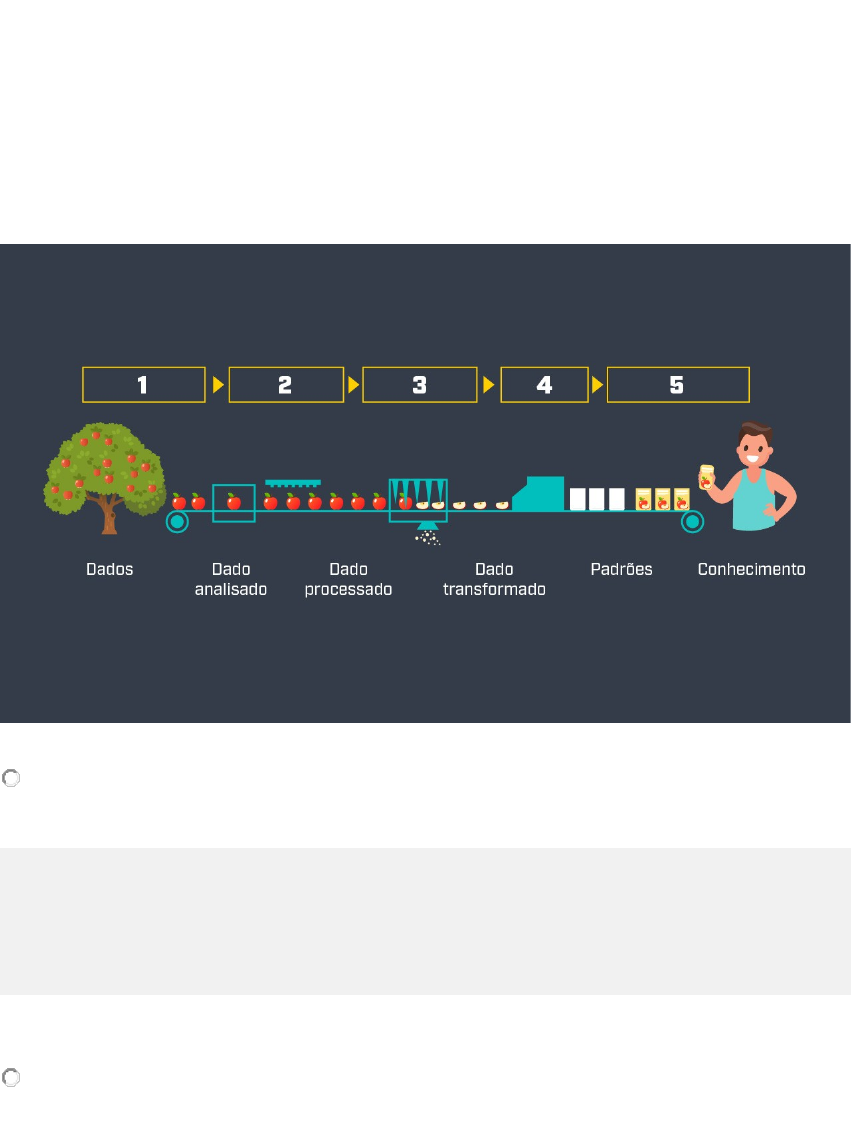 Descoberta de conhecimento com BIG DATA Exercícios 1. Atualmente as informações de bases de dados atingem grandes quantidades de forma muito fácil. A filtragem desses dados, seguida de estudos para transformá-los em conhecimento que permita embasar gestores nas suas tomadas de decisão, é de extrema importância. O processo KDD tem como objetivo transformar em conhecimento esses grandes volumes de dados de maneira sistemática. Analisando a figura abaixo, qual a sequência correta das etapas que compõem o processo KDD? Resposta incorreta. A. 1- Pré-processamento; 2 - Seleção; 3 - Mineração de dados; 4 - Interpretação e avaliação; e 5 -Transformação. As etapas da KDD podem ser divididas da seguinte forma: 1- Seleção 2- Pré-processamento 3- Transformação 4- Mineração de dados 5- Interpretação e avaliação Você acertou! B. 1- Seleção; 2- Pré-processamento; 3- Transformação; 4-Mineração de dados; e 5- Interpretação e avaliação. As etapas da KDD podem ser divididas da seguinte forma: 1- Seleção 2- Pré-processamento 3- Transformação 4- Mineração de dados 5- Interpretação e avaliação Resposta incorreta. C. 1- Transformação; 2- Pré-processamento; 3- Seleção; 4-Mineração de dados; e 5- Interpretação e avaliação. As etapas da KDD podem ser divididas da seguinte forma: 1- Seleção 2- Pré-processamento 3- Transformação 4- Mineração de dados 5- Interpretação e avaliação Resposta incorreta. D. 1- Mineração de dados; 2- Pré-processamento; 3- Transformação; 4-Seleção; e 5- Interpretação e avaliação. As etapas da KDD podem ser divididas da seguinte forma: 1- Seleção 2- Pré-processamento 3- Transformação 4- Mineração de dados 5- Interpretação e avaliação Resposta incorreta. E. 1- Interpretação e Avaliação; 2- Pré-processamento; 3- Transformação; 4-Mineração de dados; e 5- Seleção. As etapas da KDD podem ser divididas da seguinte forma: 1- Seleção 2- Pré-processamento 3- Transformação 4- Mineração de dados 5- Interpretação e avaliação 2. A mineração de dados é uma etapa do KDD que consiste na aplicação de técnicas estatísticas e inteligência artificial em bases de dados volumosas com o objetivo de reconhecer padrões e relações robustas entre os dados. Como deve ser realizada a escolha da técnica mais adequada para a etapa de mineração de dados? Resposta incorreta. A. A escolha deve ser realizada com base na definição dos usuários. Não existe uma técnica que resolva todos os problemas de data mining. Diferentes técnicas servem para diferentes propósitos, cada uma oferecendo vantagens e desvantagens. A escolha da técnica está fortemente relacionada com o tipo de conhecimento que se deseja extrair ou com o tipo de dado no qual ela será aplicada. Você acertou! B. A escolha deve ser com base no tipo de problema a ser solucionado. Não existe uma técnica que resolva todos os problemas de data mining. Diferentes técnicas servem para diferentes propósitos, cada uma oferecendo vantagens e desvantagens. A escolha da técnica está fortemente relacionada com o tipo de conhecimento que se deseja extrair ou com o tipo de dado no qual ela será aplicada. Resposta incorreta. C. A escolha da técnica deve ser sempre por modelos preditivos. Não existe uma técnica que resolva todos os problemas de data mining. Diferentes técnicas servem para diferentes propósitos, cada uma oferecendo vantagens e desvantagens. A escolha da técnica está fortemente relacionada com o tipo de conhecimento que se deseja extrair ou com o tipo de dado no qual ela será aplicada. Resposta incorreta. D. A escolha deve ser por meio de um algoritmo de escolha de técnicas. Não existe uma técnica que resolva todos os problemas de data mining. Diferentes técnicas servem para diferentes propósitos, cada uma oferecendo vantagens e desvantagens. A escolha da técnica está fortemente relacionada com o tipo de conhecimento que se deseja extrair ou com o tipo de dado no qual ela será aplicada. Resposta incorreta. E. A escolha pode ser aleatória. Não existe uma técnica que resolva todos os problemas de data mining. Diferentes técnicas servem para diferentes propósitos, cada uma oferecendo vantagens e desvantagens. A escolha da técnica está fortemente relacionada com o tipo de conhecimento que se deseja extrair ou com o tipo de dado no qual ela será aplicada. 3. Na etapa de interpretação e avaliação do processo KDD, o conhecimento adquirido é interpretado e avaliado para verificar se o objetivo final foi alcançado. O que ocorre caso o objetivo final não tenha sido alcançado? Resposta incorreta. A. O processo é encerrado sem sucesso. Caso o resultado não seja satisfatório, o que não é raro, o processo pode retornar a qualquer um dos estágios anteriores ou até mesmo ser recomeçado. Ou seja, o processo não é simplesmente encerrado e não é necessário alterar os seus objetivos. A característica de iteração do processo permite que ele retorne com resultados diferentes. Resposta incorreta. B. O processo é encerrado e outros analistas de Big Data devem recomeçar o processo com outros objetivos. Caso o resultado não seja satisfatório, o que não é raro, o processo pode retornar a qualquer um dos estágios anteriores ou até mesmo ser recomeçado. Ou seja, o processo não é simplesmente encerrado e não é necessário alterar os seus objetivos. A característica de iteração do processo permite que ele retorne com resultados diferentes. Você acertou! C. Como o KDD é iterativo, o processo pode retornar a uma das etapas anteriores. Caso o resultado não seja satisfatório, o que não é raro, o processo pode retornar a qualquer um dos estágios anteriores ou até mesmo ser recomeçado. Ou seja, o processo não é simplesmente encerrado e não é necessário alterar os seus objetivos. A característica de iteração do processo permite que ele retorne com resultados diferentes. Res