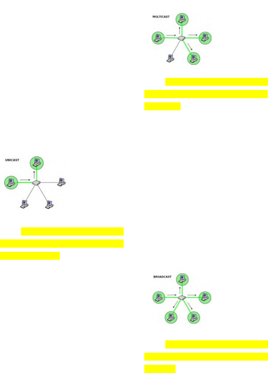 DIREITO UNOESC – UNIVERSIDADE DO OESTE DE SANTA CATARINA @Mateus Mendes Modos de Transmissão A transmissão de dados em uma rede de computadores pode ser realizada em três sentidos diferentes: Unicast, Multicast e Broadcast. Vamos vê-los em detalhes: 4.1 – Unicast (uni= um e cast= transmitir) Nessa comunicação, uma mensagem só pode ser enviada para um destino. Observem que a primeira estação de trabalho está enviando uma mensagem endereçada especificamente para a terceira estação de trabalho. Analogicamente, quando você envia uma mensagem no Whatsapp para uma pessoa específica, você está enviando uma mensagem unicast. 4.2 – Multicast (multi= vários e cast= transmitir). Nessa comunicação, uma mensagem é enviada para um grupo de destino. Observem que a primeira estação de trabalho está enviando uma mensagem endereçada para o grupo da terceira e quartas estações. Analogamente, quando você cria uma lista de transmissão no Whatsapp com um grupo de pessoas e os envia uma mensagem, você está enviando uma mensagem multicast. 4.3 – Broadcast (broad= todos e cast= transmitir) Nessa comunicação, uma mensagem é enviada para todos os destinos. Observem que a primeira estação de trabalho está enviando uma mensagem endereçada a todas as estações de trabalho. Analogamente, quando você cria uma lista de transmissões no Whatsapp com todos os seus contatos e os envia uma mensagem, você está enviando uma mensagem broadcast. 2