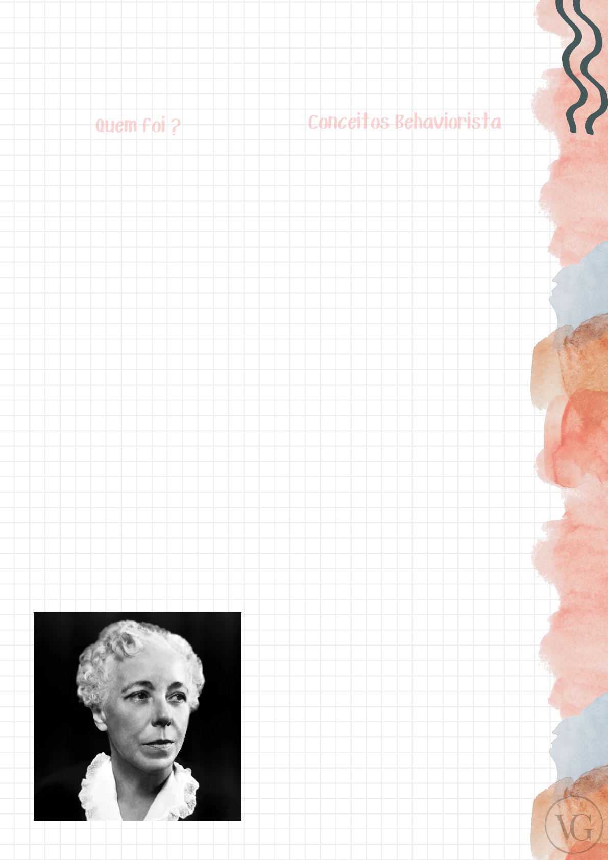 GV Karen HorneyKaren Horney Karen Horney (1885-1952) foi uma psicanalista alemã, conhecida por sua contribuição para o desenvolvimento da psicologia feminina e do psicodinamismo. Ela nasceu em 1885 e estudou medicina antes de se interessar pela psicologia. Horney foi uma crítica fervorosa da teoria freudiana da libido e do conceito de instinto. Em vez disso, ela desenvolveu uma abordagem centrada na pessoa e na cultura, argumentando que muitos dos problemas emocionais das pessoas são resultados das relações sociais e da influência cultural. Horney também foi uma defensora do movimento feminista e argumentou que as mulheres são frequentemente sujeitas a padrões culturais desiguais e a pressões sociais que as levam a desenvolver uma auto-imagem negativa. Além disso, Horney desenvolveu conceitos como "movimentos neuroticos de escape", "soluções neuroticas" e "conflitos culturais", que ajudaram a ampliar a compreensão dos problemas emocionais e a fornecer uma base teórica para o tratamento deles. A obra de Horney continua sendo estudada e aplicada na atualidade, sendo reconhecida como uma contribuição importante para o desenvolvimento da psicologia clínica. Quem foi ?Quem foi ? Karen Horney desenvolveu uma abordagem psicanalítica centrada na pessoa e na cultura, diferente da teoria freudiana que enfatizava o instinto e a libido. Ela argumentou que muitos dos problemas emocionais das pessoas são resultados de suas relações sociais e da influência cultural. De acordo com Horney, as pessoas buscam movimentos neuróticos de escape para lidar com conflitos internos e externos, que podem incluir soluções neuróticas como a agressividade, a submissão ou a auto-afirmação. Estes comportamentos disfuncionais surgem como uma tentativa de lidar com o sentimento de insuficiência ou inferioridade. A teoria de Horney também destaca o papel dos conflitos culturais na formação da personalidade e dos problemas emocionais. Ela argumentou que as mulheres, por exemplo, são frequentemente sujeitas a padrões culturais desiguais e a pressões sociais que as levam a desenvolver uma auto-imagem negativa. A terapia de Horney enfatiza a importância da compreensão da relação entre a pessoa e sua cultura, e visa ajudar as pessoas a compreender e mudar seus comportamentos disfuncionais. O objetivo é ajudar as pessoas a desenvolver relações saudáveis e positivas com os outros, e a melhorar sua autoestima e bem- estar emocional. Em resumo, a abordagem de Karen Horney na psicanálise é centrada na pessoa e na cultura, e enfatiza a importância da compreensão das influências sociais e culturais na formação da personalidade e nos problemas emocionais. Conceitos BehavioristaConceitos Behaviorista