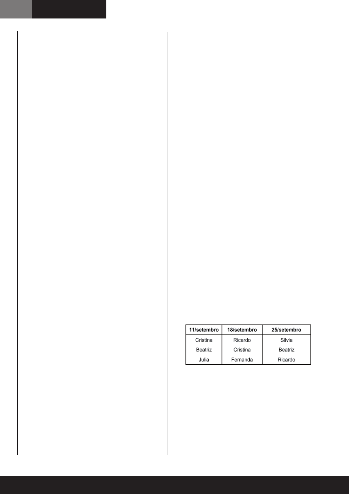 16 Raciocínio Lógico EDITORA APROVAÇÃO 12. é contradição 13. é tautologia 14. é contingência 15. A 16. D 17. E 18. A 19. E 20. C 21. C 22. C 23. A 24. D 25. C 26. E 27. C 28. A 29. E 30. A 31. D 32. D 33. E 34. A 35. D 36. E 37. B 38. E 39. C 40. C 41. C 42. E 43. A 44. A 45. A 46. E 47. A 48. E 49. C 50. B 51. A 52. C 53. E 54. E 55. B 56. A 57. A 58. B 59. E 60. B 61. D 62. B 63. C 64. B 65. A 66. C INTERPRETAÇÃO 1. (FISCAL DO TRABALHO/98) Um crime foi come- tido por um e apenas uma pessoa de um grupo de cinco suspeitos: Armando, Celso, Edu, Juarez e Tarso. Perguntados sobre quem era o culpado, cada um deles respondeu: Armando: “Sou inocente” Celso: “Edu é o culpado” Edu: “Tarso é o culpado” Juarez: “Armando disse a verdade” Tarso: “Celso mentiu” Sabendo-se que apenas um dos suspeitos mentiu e que todos os outros disseram a verdade, pode-se concluir que o culpado é: a.) Armando b.) Celso c.) Edu d.) Juarez e.) Tarso 2. (ICMS/97) Cinco ciclistas apostaram uma corrida. - “A” chegou depois de “B”. - “C” e “E” chegaram juntos. - “D” chegou antes de “B” - Quem ganhou chegou sozinho. Quem ganhou a corrida a.) A b.) B c.) C d.) D e.) E 3. Sérgio possui quatro irmãos, certo dia foi usar sua camiseta do SÃO PAULO e não a encontrou no seu armário. No seguinte, lá estava ela no seu armário. Querendo descobrir qual dos seus irmão que a tinha usado, recebeu as seguintes respostas em sua averiguação. Marcos declarou: João que a usou. João declarou: Quem a usou foi Márcia. Nelson declarou: Eu não usei a camiseta. Márcia protestou: João está mentindo. Sabendo-se que apenas umas das respostas é verídica. Quem foi o responsável pelo repenti- no sumiço de sua camiseta do SÃO PAULO, “O MELHOR DOS TIMES!!!!!!” a.) Marcos b.) João c.) Nelson d.) Márcia e.) Ninguém, pois o SÃO PAULO não é o melhor time do mundo. 4. (FCC/03) Em um dia de trabalho no escritório, em relação aos funcionários Ana, Cláudia, Luís, Paula e João, sabe-se que: - Ana chegou antes de Paula e Luís. - Paula chegou antes de João. - Cláudia chegou antes de Ana. - João não foi o último a chegar. Nesse dia, o terceiro a chegar no escritório para o trabalho foi a.) Ana. b.) Cláudia. c.) João. d.) Luís. e.) Paula. 5. (FCC/03) Em uma repartição pública que funcio- na de 2a a 6a feira, 11 novos funcionários foram contratados. Em relação aos contratados, é ne- cessariamente verdade que a) todos fazem aniversário em meses diferentes. b) ao menos dois fazem aniversário no mesmo mês. c) ao menos dois começaram a trabalhar no mesmo dia do mês. d) ao menos três começaram a trabalhar no mes- mo dia da semana. e) algum começou a trabalhar em uma 2 a feira. 6. (FCC/03) A tabela indica os plantões de funcionários de uma repartição pública em três sábados consecutivos: Dos seis funcionários indicados na tabela, 2 são da área administrativa e 4 da área de informá- tica. Sabe-se que para cada plantão de sábado são convocados 2 funcionários da área de in- formática, 1 da área administrativa, e que Fer- nanda é da área de informática. Um funcionário que necessariamente é da área de informática é a.) Beatriz b.) Cristina c.) Julia d.) Ricardo e.) Silvia EDITORA APROVAÇÃO 17Raciocínio Lógico 7. (FCC/03) Um departamento de uma empresa de consultoria é composto por 2 gerentes e 3 con- sultores. Todo cliente desse departamento ne- cessariamente é atendido por uma equipe for- mada por 1 gerente e 2 consultores. As equipes escaladas para atender três diferentes clientes são mostradas abaixo: Cliente 1: André, Bruno e Cecília. Cliente 2: Cecília, Débora e Evandro. Cliente 3: André, Bruno e Evandro. A partir dessas informações, pode-se concluir que a.) Evandro é consultor. b.) André é consultor. c.) Bruno é gerente. d.) Cecília é gerente. e.)Débora é consultora. 8. (FCC/03) Com relação a três funcionários do Tri- bunal, sabe-se que I . João é mais alto que o recepcionista; II . Mário é escrivão; III . Luís não é o mais baixo dos três; IV . um deles é escrivão, o outro recepcionis- ta e o outro segurança. Sendo verdadeiras as quatro afirmações, é correto dizer que a.) João é mais baixo que Mário. b.) Luís é segurança. c.) Luís é o mais alto dos três. d.) João é o mais alto dos três. e.) Mário é mais alto que Luís. GABARITO 1. E 2. D 3. C 4. E 5. D 6. A 7. A 8. D DIAGRAMA LÓGICO 01. (EPUSP) Carlos, João, Ana, Márcia e Alfredo es- tão numa festa. Sabendo-se que cada um deles possuem diferentes profissões: Advogado, Ad- ministrador, Psicólogo, Físico e Médico. Temos: • O advogado gosta de conversar com Ana, Márcia e João, mas odeia conversar com o médico. • Carlos, Ana e o advogado têm três filhos. • O médico diz a Alfredo que salvou ontem a vida de quatro crianças. • Carlos, Ana e Márcia dançam com o ad- ministrador. Podemos afirmar que João é o: a.) Advogado b.) Administrador c.) Psicólogo d.) Físico e.) Médico 02. (AFTN/96) Os carros de Artur, Bernardo e César são, não necessariamente nesta ordem, uma Brasília, uma Parati e um santana. Um dos car- ros é cinza, um outro é verde, e o outro é azul. O carro de Artur é cinza; o carro de César é o Santana; o Carro de Bernardo não é verde e não é a brasília. As cores da brasília, da parati e do santana são, respectivamente a.) cinza, verde e azul b.) azul, cinza e verde c.) azul, verde e cinza d.) cinza, azul e verde e.) verde, azul e cinza 03. (AFC/96) Três irmãs — Ana, Maria e Cláudia — fo- ram a uma festa com vestidos de cores diferen- tes. Uma vestiu azul, a outra branco, e a terceira preto. Chegando à festa, o anfitrião perguntou quem era cada uma delas. A de azul respondeu: “Ana é a que está de branco”. A de branco fa- lou: “Eu sou Maria”. E a de preto disse: “Cláudia é quem está de branco”. Como o anfitrião sabia que Ana sempre diz a verdade, qu