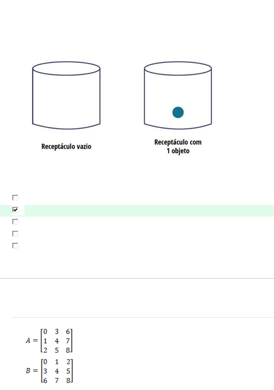 AOL-4 de de Matemática Aplicada 1. Existem diversas noções intuitivas de conjunto no contexto do cotidiano dos seres humanos. Cada uma dessas noções se associa em maior ou menor medida com o conceito de conjunto da matemática. A noção intuitiva de conjunto como receptáculo, por exemplo, facilita o entendimento acerca de alguns tipos de conjuntos matemáticos específicos. Tendo isso em vista, considere a figura a seguir: Considerando essas informações e o conteúdo estudado acerca de conjuntos, afirma-se que a noção intuitiva de conjunto como receptáculo auxilia no entendimento de dois tipos de conjuntos porque: 1. pode armazenar elementos inteiros não nulos. 2. se concebe a ideia de conjunto vazio e conjunto unitário. Resposta correta 3. a noção intuitiva impõe um limite interno para representação de conjuntos. 4. é possível visualizar objetos com esse tipo de representação. 5. fornece elementos algébricos para o entendimento desses conjuntos. 2. Matrizes são objetos matemáticos compostos por linhas e colunas, onde cada elemento recebe sua própria “coordenada”. Como esses objetos matemáticos comportam diversos elementos, operá-los não é algo trivial. As operações matriciais possuem diversas condições para que sejam possíveis suas realizações. Considere duas matrizes A e B a seguir: Considerando essas informações e o conteúdo estudado sobre matrizes, analise as afirmativas a seguir e assinale V para a(s) verdadeira(s) e F para a(s) falsa(s): I. ( ) É possível realizar o produto AB dessas matrizes. II. ( ) A soma dessas matrizes irá gerar uma matriz de ordem igual a ambas. III. ( ) A subtração A – B dessas matrizes irá gerar uma matriz de ordem diferente a ambas. IV. ( ) O produto AB irá gerar uma matriz de ordem diferente de ambas. Agora, assinale a alternativa que apresenta a sequência correta: 1. F, F, V, F. 2. F, F, V, V. 3. V, F, F, V. 4. V, V, F, F. Resposta correta 5. V, V, F, V. 3. Existem inúmeros tipos de relações entre conjuntos numéricos, sendo elas definidas como qualquer subconjunto do produto cartesiano desses conjuntos. A relação de equivalência, por exemplo, é um tipo específico de relação entre dois conjuntos. Tendo isso em vista, considere a relação R e os conjuntos A e B a seguir: Considerando essas informações e o conteúdo estudado sobre relações, supondo que R seria uma relação de equivalência, analise as afirmativas a seguir e assinale V para a(s) verdadeira(s) e F para a(s) falsa(s): I. ( ) Caso R fosse uma relação de equivalência, deveria considerar-se B = A. II. ( ) Caso R fosse uma relação de equivalência, deveria valer a propriedade reflexiva. III. ( ) Caso R fosse uma relação de equivalência, deveria valer a propriedade assimétrica. IV. ( ) Caso R fosse uma relação de equivalência, deveria valer a propriedade intransitiva. Agora, assinale a alternativa que apresenta a sequência correta: 1. V, V, F, F. Resposta correta 2. F, F, V, F. 3. V, F, V, V. 4. V, F, F, V. 5. F, F, V, V. 4. Existem inúmeras noções intuitivas para o conceito matemático de conjunto. Uma das noções trabalhadas nessa disciplina foi o entendimento de conjuntos por meio de uma coleção de objetos. Uma banda, por exemplo, é um conjunto, pois se trata de uma coleção de pessoas. Uma sala de aula com alunos, da mesma maneira, também se refere a um conjunto. Considerando essas informações e o conteúdo estudado sobre conjuntos como coleções de objetos, pode-se dizer que essa noção intuitiva diverge da noção matemática de conjuntos porque: 1. elementos para esse tipo de conjunto são pessoas. 2. conjuntos vazios e unitários ficam de fora dessa noção intuitiva. Resposta correta 3. conjuntos matemáticos estão associados a noção de conjuntos como grupos. 4. existem infinitos conjuntos numéricos com infinitos elementos. 5. conjuntos matemáticos são descritos por números reais e os de pessoas, por inteiros. 5. Conjuntos numéricos têm aplicação em diversos contextos do dia a dia. Com isso em vista, um estudante de Matemática Aplicada buscou analisar a frequência das pessoas da sua família nas casas de sua mãe (M) e de sua avó (V), representando as pessoas que frequentam cada casa como elementos dos conjuntos M e V. Chegou-se à seguinte situação: seu tio João frequenta a casa da sua avó, mas não a de sua mãe. Já sua tia Marta frequenta ambas as casas. Roberto, seu primo, frequenta apenas a casa de sua mãe. Por fim, sua irmã Regina mora em outra cidade e não frequenta a casa de ninguém. A representação dessa situação em diagramas de Venn proposta pelo aluno foi a seguinte: Considerando essas informações e o conteúdo estudado sobre conjuntos, pode-se dizer que essa representação está equivocada porque: 1. João e Roberto deveriam pertencer ao mesmo conjunto. 2. Regina e João são elementos de U. 3. João está como elemento de M. 4. Roberto está como elemento de M. 5. as posições dos nomes Regina e Marta deveriam estar trocadas. Resposta correta 6. O estudo de muitos temas relacionados à matemática pode estar associado à aprendizagem de novos vocábulos, muitas vezes, por meio de uma nova simbologia. Essa nova simbologia, tal como no português, possui seus sinônimos, ou seja, conjuntos de símbolos diferentes que representam o mesmo objeto matemático. Considere as duas representações a seguir: A = {} A = Ø Considerando essas informações e o conteúdo estudado sobre conjuntos, pode-se dizer que ambas as representações se referem ao mesmo objeto matemático porque: 1. referem-se à representação de um conjunto infinito. 2. tratam de uma coleção de elementos unitários. 3. tratam da representação de um conjunto vazio. Resposta correta 4. representam o elemento nulo, complementar ao conjunto universo. 5. representam um conjunto unitário, que contém apenas o elemento Ø. 7. As operações matriciais pautam-se em operações aritméticas 