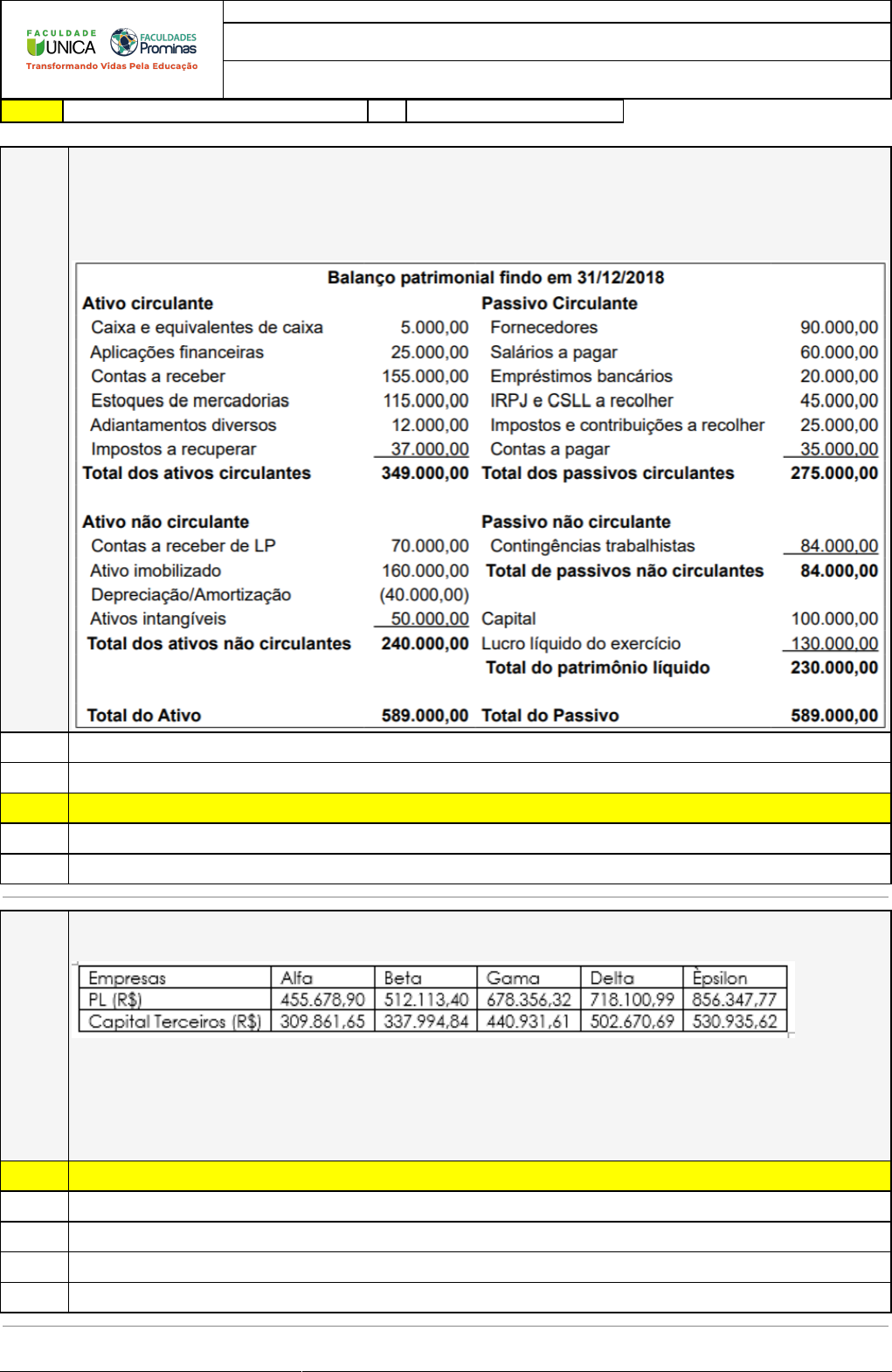 04/02/2023 20:07:50 1/4 REVISÃO DE SIMULADO Nome: RAIANE CARDOSO SANTOS Disciplina: Análise das Demonstrações Contábeis Respostas corretas são marcadas em amarelo X Respostas marcardas por você. Questão 001 Concurso Vunesp 2019 (adaptado) assinale a alternativa que indica o índice de participação de capital de terceiros (CT/PL), utilizando-se do balanço patrimonial fornecido pela contabilidade de uma empresa. Utilize apenas duas casas decimais, sem a aplicação do critério de arredondamento. A) 2,05. B) 1,65. X C) 1,56. D) 1,77. E) 1,8. Questão 002 (Contador Transpetro 2011 – CESGRANRIO) – Informações de empresas do segmento da indústria têxtil: Empresas Alfa Beta Gama Delta Èpsilon PL (R$) 455.678,90 512.113,40 678.356,32 718.100,99 856.347,77 Capital Terceiros (R$) 309.861,65 337.994,84 440.931,61 502.670,69 530.935,62 Ao se considerar o índice de Endividamento, a empresa que apresenta a maior proporção é a X A) Delta. B) Gama. C) Beta. D) Alfa. E) Épsilon. 04/02/2023 20:07:50 2/4 Questão 003 Das Demonstrações contábeis de uma empresa foram retiradas as informações a seguir: Com base em dois indicadores de estrutura de capital da empresa, analise as afirmativas abaixo e assinale a alternativa correta. A) Os indicadores de composição de endividamento e participação de capital de terceiros mostram uma recuperação do ciclo operacional da empresa, pois conseguiu-se melhorar o período de recebimento das vendas. X B) os indicadores de composição de endividamento e participação de capital de terceiros mostram um crescimento do endividamento de curto prazo e também uma maior participação do capital de terceiros em relação ao capital próprio no período 2.018/2.019. C) A participação de capital de terceiros aumentou no período 2.018/2.019, melhorando os custos financeiros da empresa. D) Nos dois anos analisados o indicador de participação de capital de terceiros foi de 170,59% em 2.019 e 165,62% em 2.018, mostrando uma recuperação do patrimônio líquido e por consequência uma melhora na rentabilidade do período. E) A composição do endividamento melhorou no período, passando de 50,12% em 2.018 para 37,21% em 2.019. Questão 004 Concurso FGV 2018 (adaptado) uma sociedade empresária apresenta endividamento geral de 0,70. Isso significa que A) de suas dívidas, 30% correspondem a passivos sobre os quais incidem juros. B) seus ativos totais correspondem a 70% de seus passivos totais. C) ela é capaz de pagar 70% de suas dívidas totais com os seus ativos com realização a curto e a longo prazo. X D) do seu ativo total, 30% são financiados por capital próprio. E) ela é capaz de pagar 70% de suas dívidas de curto prazo com os seus ativos de curto prazo. 04/02/2023 20:07:50 3/4 Questão 005 Utilizando o Balanço Patrimonial abaixo, podemos afirmar que a composição de endividamento (PC/CT) e Imobilização do Patrimônio Líquido ((ANC – ARLP)/PL) é respectivamente: A) 74,05% e 35,00%. X B) 80,63% e 75,96%. C) 20,69% e 32,89%. D) 76,60% e 73,91%. E) 52,36% e 48,69%. Questão 006 Uma sociedade empresária apresentava os seguintes índices de endividamento geral e de composição do endividamento, nos anos de 2014 a 2016: Sobre essa sociedade empresária, assinale a afirmativa correta. A) Há um aumento no endividamento geral em 2016 comparado com 2015. B) Há um aumento nos prazos de pagamento das dívidas. X C) Há uma diminuição nos passivos onerosos. D) Há um aumento na parcela do ativo financiada por recursos próprios. E) Há um aumento na rentabilidade. 04/02/2023 20:07:50 4/4 Questão 007 (Concurso Nucepe 2018, adaptado) A empresa SDR S/A apresentou as seguintes informações relacionadas a seu passivo apurado no exercício de 2019: Fornecedores R$ 500,00 Comissões a pagar R$ 100,00 Pró-labore a pagar R$ 100,00 Salários a pagar R$ 200,00 Empréstimos Bancários a curto prazo R$ 1.750,00 Financiamento a longo prazo R$ 1.000,00 Capital Social R$ 2.900,00 Lucros Acumulados R$ 100,00 Considerando-se as informações acima, o índice relativo à composição do endividamento corresponde X A) R$ 0,72. B) R$ 1,00. C) R$ 0,54. D) R$ 0,64. E) R$ 0,39. Questão 008 (Concurso FCC – 2018) A Cia. dos índices apresentava a seguinte situação patrimonial e financeira em 31/12/2017, com os valores expressos em reais: A Cia. dos índices apresentava, em 31/12/2017, índice de A) imobilização dos recursos não correntes igual a 83%. X B) composição do endividamento igual a 40%. C) participação de capitais de terceiros em relação ao patrimônio líquido igual a 100%. D) liquidez corrente igual a 1. E) liquidez geral igual a 2.