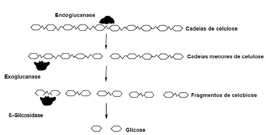 Celulases e suas aplicações Celulases são enzimas responsáveis pela degradação da celulose, principal composto presente nas células vegetais. Enzimas são moléculas capazes de “acelerar” reações químicas e estão presentes em todas as células. A celulose é um polissacarídeo formado por várias unidades de glicose unidas entre si através de ligações químicas. As celulases realizam a quebra das ligações químicas existentes entre as unidades de glicose que formam a celulose. No caso das celulases, três enzimas fazem parte desse grupo, elas recebem os nomes de endoglucanases, exoglucanases e beta-glicosidases. As endoglucanases agem na região interna da fibra de celulose e liberam compostos menores formados por poucas unidades de glicose, os chamados oligossacarídeos (açúcares pequenos). As exoglucanases agem nas extremidades das fibras de celulose e liberam unidades de glicose (livres) ou celobiose, que são compostos menores, formados por duas unidades de glicose. As beta-glicosidases quebram a ligação química existente entre as duas unidades de glicose que formam a celobiose, liberando unidades de glicose (livres). Figura 1: Ação das celulases sobre a molécula de celulose (modificado de WRIGHT et al., 1988) As celulases são utilizadas em diversas aplicações biotecnológicas. Na indústria têxtil, essas enzimas são usadas para dar melhor acabamento aos tecidos, tornando-os mais lisos, macios e com melhor caimento. Elas atuam degradando as fibras da superfície do tecido, compostas basicamente por celulose. As celulases também são utilizadas no processo de envelhecimento do jeans, através da remoção parcial do corante índigo. Esse processo, anteriormente era realizado com pedra-pomes o que causava inúmeras desvantagens tanto aos equipamentos utilizados (máquinas de lavar e secadoras), que sofriam desgaste, quanto aos tecidos, que tinham sua qualidade diminuída devido à abrasão excessiva. As celulases também são utilizadas na indústria de bebidas para produção de sucos de frutas e nos processos de vinificação. Essas enzimas facilitam a extração de sucos e a maceração para produção de néctares de frutas por romperem a rede de celulose que ajuda reter o líquido nas células vegetais. Na produção de vinhos, as beta-glicosidases, melhoram a extração de pigmentos e substâncias aromatizantes presentes na casca da uva. Além disso, degradam compostos de sabor desagradável, liberando substâncias flavorizantes, melhorando o aroma e o sabor do vinho. As celulases também exercem papel importante na nutrição animal. Ao ser incorporadas à ração, essas enzimas, juntamente com as celulases produzidas pelos micro- organismos presentes no rúmen do animal, aumentam a digestibilidade das fibras da parede celular vegetal, melhorando a conversão do alimento ingerido (pastagem) em carne e leite. Na fabricação de detergentes, proporcionam maior limpeza e menor degradação dos tecidos e na indústria de polpa e papel, tornam o papel mais branco e liso. Entretanto, o interesse por essas enzimas tem aumentado muito devido a sua utilização no processo de produção de etanol a partir de resíduos vegetais como bagaço e palha de cana, talos, sabugo e palha de milho, cascas de arroz e demais grãos, além de restos de madeiras, os chamados materiais lignocelulósicos. Texto preparado por Ariane Zanchetta, bióloga e estudante de doutorado do Programa de Pós-Graduação em Microbiologia do Instituto de Biociências, Letras e Ciências Exatas, Ibilce-Unesp, SP, Brasil. Leituras complementares sugeridas: CASTRO, A. M.; PEREIRA JR, N. Produção, propriedades e aplicação de celulases na hidrólise de resíduos agroindustriais. Química Nova, v. 33, n. 1, p. 181-188, 2010. LOPES, C. S. D. Análise ambiental da fase de acabamento do jeans. Interfacehs Revista de Saúde, Meio Ambiente e Sustentabilidade, v. 6, n. 3, p. 87-102, 2011. LIMA, A. L. G.; NASCIMENTO, R. P.; BON, E. P. S.; COELHO, R. R. R. Streptomyces drozdowiczii cellulase production using agro-industrial by-products and its potential use in the detergent and textile industries. Enzyme and Microbial Technology, v. 37, p. 272-277, 2005. MARTINS, A. S.; VIEIRA, P. F.; BERCHIELLI, T. T.; PRADO, I. N. Degradabilidade de volumosos utilizando enzimas fibrolíticas. Acta Scientiarum: Animal Sciences, v. 30, n. 4, p. 435-442, 2008. WRIGHT, J. D.; WYMAN, C. E.; GROCHMANN, K. Simultaneous saccharification and fermentation of lignocellulose: Process evaluation. Applied Biochemistry and Biotechnology, v. 17, p. 75-90, 1988.
