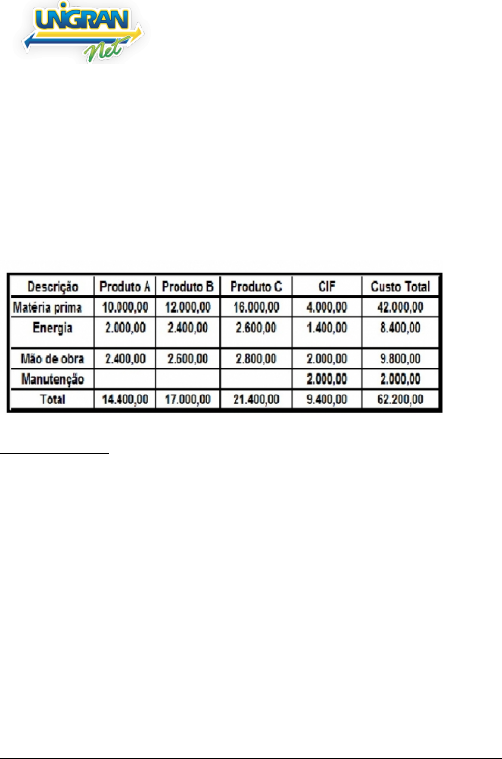 CENTRO UNIVERSITÁRIO DA GRANDE DOURADOS PROVA DO ALUNO Protocolo: 468837 Página 1 - 04/12/2018 às 19:39 P1 e P2 Curso: Administração Disciplina: Contabilidade Comercial Data de aplicação: 27/11/2018 Data de Gabarito: 28/11/2018 RGM: 023.5724 Aluno(a): LETICIA APARECIDA MONTEIRO PROVA 01 Questão 1 - Aula # - Apresente o custo total do produto B após o rateio. a) 16.963,38 b) 20.026,80 [CORRETA] c) 25.209,82 d) 26.254,60 Questão 2 - Aula # - Leia a frase abaixo e faça a correlação. ( ) São aquelas realizadas com a finalidade de se obter o chamado capital de financiamento, ou desconto concebido por realizações antecipadas de funcionamento; ( ) São aquelas que ocorrem nos estabelecimentos que têm como finalidade, vender ou promover alguma mercadoria ou produto; ( ) São gastos têm como finalidade manter a máquina administrativa funcionando com regularidade, na tarefa de gerir, controlar ou administrar uma riqueza patrimonial. Correlação: I - Despesas Administrativas; II - Despesas Financeiras; III - Despesas Comerciais. Assinale a alternativa correta. a) I, II, III b) II, III, I [CORRETA] c) III, II, I d) I, III, II CENTRO UNIVERSITÁRIO DA GRANDE DOURADOS PROVA DO ALUNO Protocolo: 468837 Página 2 - 04/12/2018 às 19:39 Questão 3 - Aula # - Leia a frase abaixa e faça a correlação. ( ) Gasto relativo ao bem ou ao serviço utilizado na produção de outros bens e serviços, que só é reconhecido como custo no momento da utilização dos fatores de produção. ( ) Compra de um produto ou serviço qualquer que gera sacrifício financeiro para a entidade, sacrifício esse representado por entrega ou promessa de ativos ( ) Bem ou serviço consumido direta ou indiretamente para obtenção de receitas, são itens que reduzem o Patrimônio Líquido. Correlação: I - Despesa II - Gasto III - Custo Assinale a alternativa correta: a) I, II, III b) III, II, I [CORRETA] c) II, III, I d) III, I, II Questão 4 - Aula # - Leia a afirmativa abaixo e assinale a alternativa correta. Os custos são classificados em relação ao produto que estão sendo produzidos, assim os custos estão presentes nas empresas sendo elementos importantes na tomada de decisão. PORQUE. Quando estamos tratando dos custos os mesmos podem ser classificados em diretos e indiretos já que estes custos influenciam apenas os itens que compõem a produção. Assinale alternativa correta. a) A primeira afirmativa esta correta e a segunda esta incorreta; [CORRETA] b) A primeira afirmativa esta incorreta e a segunda esta correta; c) Ambas afirmativas estão corretas; d) Ambas afirmativas estão incorretas; Questão 5 - Aula # - A empresa JHD LTDA, fabrica 02 produtos, sendo que o produto A, corresponde a 60% das vendas e o produto B 40% das vendas. O produto A é vendido por R$ 50,00 tendo custos de despesas variáveis é de R$ 32,00 e os custos e despesas fixa de R$ 8,00. O produto B é vendido por R$ 60,00 e custos e despesas variáveis por R$ 32,00 e os custos e despesas fixas R$ 12,00. Apresente a margem de contribuição conjunta dos produtos A e B. a) Margem de contribuição dos produtos A e B é R$ 22,00 [CORRETA] b) Margem de contribuição dos produtos A e B é R$ 16,40 c) Margem de contribuição dos produtos A e B é R$ 11,20 d) Margem de contribuição dos produtos A e B é R$ 10,80 Questão 6 - Aula # - Qual é formula correta da margem de contribuição? assinale a alternativa correta. CENTRO UNIVERSITÁRIO DA GRANDE DOURADOS PROVA DO ALUNO Protocolo: 468837 Página 3 - 04/12/2018 às 19:39 a) Preço de Venda unitário - Custo e Despesas Variáveis unitário [CORRETA] b) Preço de Venda unitário - Custo Variável unitario + Custo Fixo unitario c) Preço de Venda unitário - Custo Variável unitario - Custo Fixo unitario d) Preço de Venda unitário - Custo Variável unitario + Despesa Fixa unitaria Questão 7 - Aula # - A empresa CTB LTDA, esta produzindo dois novos produtos, que neste momentos iremos chamar de PRODUTO A e PRODUTO B. Os custo diretos de produção já esta alocado no quadro abaixo, mas estes produtos para serem produzidos recebeu um montante em custos indiretos de R$ 54.000,00 principalmente referente as horas que obteve um total de 600 horas, sendo distribuído da seguinte maneira: PRODUTO A, 360 horas e PRODUTO B, 240 horas. Neste sentido o controller da empresa deverá utilizar do critério de rateio para identificar qual produto obteve maior custos de produção. Peço que realize a distribuição dos custos pelo critério de rateio e assim apresente o custo dos produtos. Descrição produto A produto B Total Materia prima.......................R$ 10.000,00 .........R$ 26.000,00 .......R$ 36.000,00 Mão de Obra Direta ..............R$ 6.000,00 ...........R$ 4.000,00 ......R$ 10.000,00 Total custos Diretos...............R$ 16.000,00 .........R$ 30.000,00 ......R$ 46.000,00 Total custos Indiretos .......................................................................R$ 54.000,00 Assinale a alternativa correta: a) O produto A tem um custo direto de R$ 16.000,00 e o produto B tem custo direto de R$ 46.000,00 b) O produto B tem um custo direto de R$ 30.000,00 e o produto A tem custo direto de R$ 54.000,00 c) O produto A tem um custo indireto de R$ 48.400,00 e o produto B tem custo indireto de R$ 21.600,00 d) O produto B tem um custo indireto de R$ 21.600,00 e o produto A tem custo indireto de R$ 32.400,00 [CORRETA] Questão 8 - Aula # - A empresa WWF S.A produz 03 três produtos diferentes, onde cada produto recebe os seguintes custos e despesas no periodo. I - Produto A, Tem preço de venda de R$ 50,00 com custo variavel de R$ 28,00 e despesa fixa de R$ 10,00 e despesa variável de R$ 10,00 I - Produto B, Tem preço de venda de R$ 40,00 com custo variavel de R$ 16,00 e despesa fixa de R$ 22,00 e despesa variável de R$ 10,00 I - Produto C, Tem preço de venda de R$ 42,00 com custo variavel de R$ 14,00 e despesa fixa de R$ 26,00 e despesa variavel de R$ 8,00 I - Produto D, Tem pre