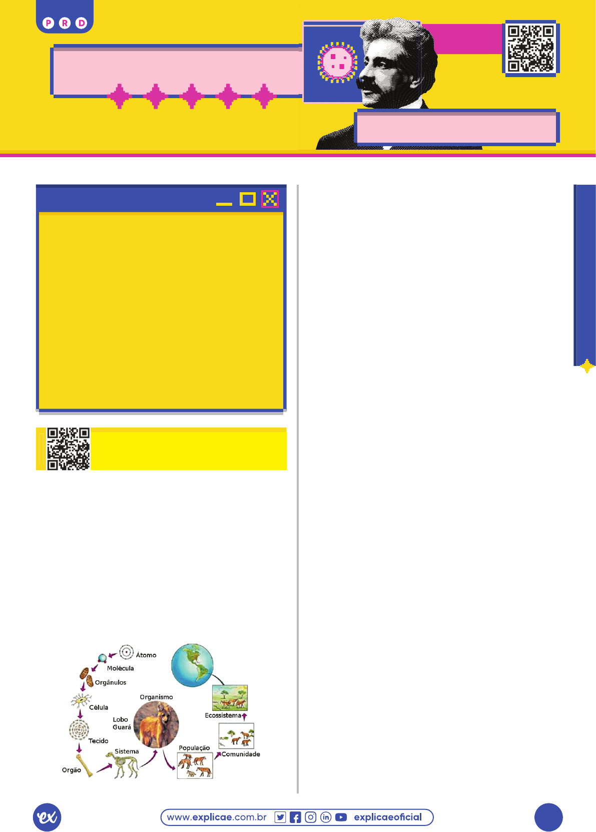 547 BI OL OG IA | F RE NT E A | C AP ÍT UL O 01 1. INTRODUÇÃO À BIOLOGIA FRENTE A | CAPÍTULO 01 REVISE & Responda A Biologia é uma ciência de enorme alcance. Novas e empolgantes descobertas biológicas são realizadas diariamente. Já imaginou estudar todas as informações que você encontrar no amplo espectro da biologia sem estarem organizadas de forma acessível? Mas você não precisa se preocupar com isso, pois os biólogos têm suas descobertas separadas em áreas específi cas como a Bioquímica (dedica-se à compreensão da vida no nível molecular), a Citologia (analisa a célula e seus componentes), a Histologia (estuda os tecidos vivos) e outras mais. E toda pesquisa biológica tem um propósito que servirá para desvendar os mistérios sobre a vida. Não é fácil defi nir vida, mas reconhecemos a vida em função do que os seres vivos fazem. Por isso, iniciaremos o nosso estudo com as caraterísticas que os seres vivos apresentam e como os biólogos realizam suas pesquisas científi cas. Introdução CONCEITO E NÍVEIS DE ORGANIZAÇÃO DOS SERES VIVOSVID EO A U LA Biologia, palavra formada pela junção de bio (signifi ca vida) e logos (signifi ca estudo), ou seja, biologia é a ciência que se propõe a estudar a vida em diferentes níveis. Sendo assim, o tema do seu estudo são os seres vivos em vários aspectos, como são formados, como se organizam e como se interrelacionam e se relacionam com o ambiente, por exemplo. Nosso foco não será o estudo da formação das palavras (etimologia), mas existem alguns afi xos (prefi xos e sufi xos) que contribuirão enormemente com os nossos estudos. Por isso, atente-se à ênfase dada às formações das palavras pelo(a) orientador(a) de biologia durante as aulas. NÍVEIS DE ORGANIZAÇÃO DOS SERES VIVOS https://www.coladaweb.com/biologia/ecologia/as-caracteristicas-dos-seres-vivos Como foi dito na abertura do capítulo, o amplo espectro de temas que são estudados pela biologia pode ser organizado em níveis hierárquicos. Esses níveis hierárquicos fi caram conhecidos como níveis de organização dos seres vivos ou níveis de organização biológica e estão citados e exemplifi cados na fi gura a seguir. Átomos Partículas a nível submicroscópico que se unem através de ligações químicas para a formação de moléculas. Exemplos: átomos de C, H, O, N. Moléculas Conjunto eletricamente neutro de dois ou mais átomos ligados que formam os compostos químicos inorgânicos e orgânicos. Exemplos: H2O, C6H12O6. Organela (ou organóide) Subunidade da célula envolvida numa determinada função celular. Exemplo: mitocôndria. Célula Unidade morfofi siológica fundamental da vida. Exemplo: célula eucariótica animal. Tecido Conjunto de células que têm uma função específi ca em organismos multicelulares. Exemplo: tecido ósseo. Órgão Conjunto de tecidos que cumprem uma função do organismo multicelular. Exemplo: osso. Sistemas conjunto de órgãos que cumprem uma função principal do organismo multicelular. Exemplo: sistema esquelético. Indivíduo/Organismo ser constituído por uma ou mais células, caracterizadas por possuírem um “arranjo” único de informação genética, o que identifi ca sua espécie. Exemplo: Chrysocyon brachyurus (lobo-guará). População Conjunto de indivíduos de uma mesma espécie que interagem entre si, habitando uma determinada área geográfi ca em um dado intervalo de tempo. Exemplo: população de lobos-guarás. BIOLOGIA | 1. INTRODUÇÃO À BIOLOGIA 548 BI OL OG IA | F RE NT E A | C AP ÍT UL O 01 Comunidade (ou biocenose) Conjunto de organismos de espécies diferentes que interagem entre si, habitando uma determinada área geográfi ca em um dado intervalo de tempo. Exemplo: a comunidade da qual faz parte uma população de lobos- guarás inclui as populações de plantas e de outros animais com os quais eles coabitam. Ecossistema Sistema defi nido pelas relações entre grupos de seres vivos e entre estes os o ambiente (biótopo) onde se inserem. Ou seja, é a interação entre fatores bióticos e os fatores abióticos de uma determinada área geográfi ca. Exemplo: o cerrado onde estão os lobos-guarás. Biosfera É o conjunto de todos os ecossistemas da Terra. Exemplo: é a esfera do planeta onde encontramos vida. Os biólogos utilizaram uma abordagem denominada reducionismo, uma poderosa estratégia científi ca que reduz sistemas complexos a componentes mais simples e mais acessíveis ao estudo. Mas optamos por demonstrar os níveis de organização biológica partindo de uma visão micro (átomos e moléculas) para uma visão macro (biosfera). ORIENTADA QUESTÃO 01 RES O LU Ç Ã O (UEL) Considere as frases a seguir. I. Atualmente, Rattus norvegicus ocorre em todos os continentes. II. As ratazanas de uma cidade vivem principalmente na rede de esgotos e nos depósitos de lixo. III. Um rato branco é submetido a um experimento de fi siologia em laboratório. As frases nas quais se mencionam, respectivamente, um indivíduo, uma espécie e uma população são: A I, II e III. B I, III e II. C II, III e I. D III, I e II. E III, II e I. CARACTERÍSTICAS GERAIS DOS SERES VIVOSVID EO A U LA Os seres vivos distinguem-se da matéria não-viva (bruta) por algumas características. Por exemplo: a matéria bruta não apresenta composição celular. Já os seres vivos, além de serem formados por células, podem ser subdivididos em seres que apresentam uma única célula denominados unicelulares (bactérias, cianobactérias, protozoários, algumas algas e alguns fungos) e os seres que apresentam mais de uma célula, os multicelulares ou pluricelulares (algumas algas, alguns fungos, as plantas e os animais). A seguir, conheceremos as principais características dos seres vivos e suas derivações. COMPOSIÇÃO QUÍMICA DOS SERES VIVOS https://en.wikipedia.org/wiki/CHON Tanto a matéria bruta (inanimada) quanto a matéria viva (seres vivos) são formados por elementos químicos. 