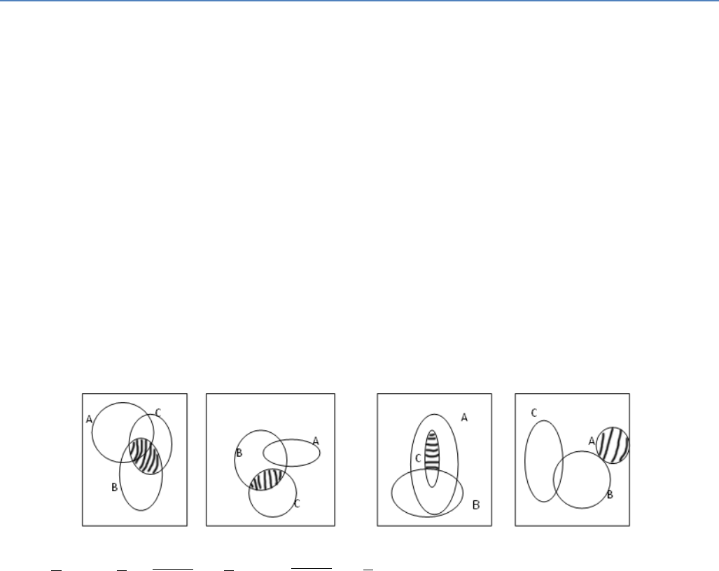 Material didático - Profa. Dra. Adriana Barbosa Santos Revisã o de conceitos bã sicos sobre teoriã de conjuntos Experimento ou fenômeno aleatório: ocorre quando os resultados não podem ser preditos, mesmo que seja observado nas mesmas condições inúmeras vezes. Isto significa que os resultados de um experimento ou fenômeno aleatório estão sujeitos à influência de fatores casuais. Espaço amostral (): é o conjunto de todos os resultados possíveis de um experimento ou fenômeno aleatório. Os resultados que compõem o espaço amostral chamam-se eventos ou pontos amostrais. Eventos: subconjuntos do espaço amostral. Um evento é dito ter ocorrido se qualquer dos seus elementos é um resultado observado. Se A é um evento, A . Evento simples: cada resultado individual possível do experimento. Também são chamados de pontos amostrais. Evento composto: um conjunto de certos eventos simples. Pode ser decomposto em outros eventos simples ou em outros eventos compostos. União: A união de dois eventos A e B, denotada por AB, representa a ocorrência de pelo menos um dos eventos A ou B. Intersecção: A intersecção de dois eventos A e B, denotada por AB, representa a ocorrência dos eventos A e B simultaneamente. Eventos mutuamente exclusivos: Dois eventos são mutuamente exclusivos ou excludentes quando eles não têm elementos em comum, isto é, AB= Eventos complementares: Diz-se que A e B são complementares se sua união é o espaço amostral e sua intersecção é vazia Exercícios 1. Em uma universidade há indivíduos de três segmentos: alunos, funcionários e docentes. Sabe-se que 1800 são alunos, 2150 não são docentes e 15% são docentes, pergunta-se: Quantos indivíduos têm a universidade? Quantos são docentes? 2. Escreva em representação de conjuntos expressões para a região tracejada de cada “diagrama de Venn” apresentado abaixo. 3. Represente por um “Diagrama de Venn”, um de cada vez, os seguintes eventos: a) BA − b) )( BAA c) AB d) BA e) )()( ABAB . 4. Sejam A, B e C três eventos de um espaço amostral. Exprimir os eventos abaixo, usando as operações união, intersecção e complementação: a) somente A ocorre; b) A e C ocorrem, mas B não; c) A, B e C ocorrem; d) pelo menos um ocorre; e) exatamente um ocorre; f) nenhum ocorre; g) exatamente dois ocorrem; h) pelo menos dois ocorrem; i) no máximo dois ocorrem. 5. Considere a experiência que consiste em pesquisar famílias com 3 crianças, em relação ao sexo das mesmas, segundo a ordem do nascimento. Enumerar os eventos: a) ocorrência de dois filhos do sexo masculino; b) ocorrência de pelo menos um filho do sexo masculino; c) ocorrência de no máximo duas crianças do sexo feminino. 6. Lançam-se dois dados simultaneamente. O evento A descreve as situações em que saiu face par nos dois dados. Quantos elementos tem o evento A. Represente o evento A usando produto cartesiano. 7. Uma fábrica de bebidas produz refrigerantes que podem ser classificados ao final da produção em: “conformes” e “não conformes”. Escolhidas 3 unidades de refrigerante, qual o espaço amostral? Se forem escolhidos 5 quantos elementos terá o espaço amostral? 8. Sendo A e B dois eventos em um mesmo espaço amostral “traduza” para a linguagem da Teoria dos Conjuntos, as seguintes situações: a) ao menos um dos eventos ocorre. b) exatamente um dos eventos ocorre; c) nenhum deles ocorre; d) o evento A ocorre mas o B não. B