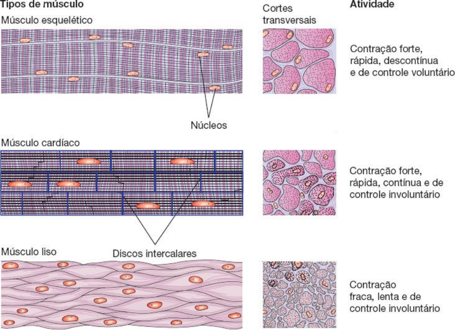 tecido muscular O tecido muscular é constituído de células alongadas, que contêm grande quantidade de filamentos citoplasmáticos compostos de proteínas cujo arranjo torna possível a transformação de energia química em energia mecânica. Estas proteínas produzem a força necessária para a contração das células e do tecido muscular, utilizando a energia armazenada em moléculas de trifosfato de adenosina (ATP). As células musculares têm origem mesodérmica, e, durante sua diferenciação, há síntese de proteínas filamentosas concomitantemente ao alongamento das células. De acordo com suas características morfológicas e funcionais, distinguem-se três tipos de tecido muscular (Figura 10.1): o músculo estriado esquelético, o músculo estriado cardíaco e o músculo liso. Por serem alongadas, as células musculares são também denominadas fibras. O músculo estriado esquelético é formado por feixes de células cilíndricas multinucleadas e muito longas, com estriações transversais. Essas células, ou fibras, têm contração rápida e vigorosa e estão sujeitas ao controle voluntário. O músculo estriado cardíaco, cujas células também apresentam estrias transversais, é formado por células alongadas, porém muito mais curtas que as do músculo esquelético. Suas fibras são ramificadas e se unem por meio de estruturas chamadas discos intercalares, encontradas exclusivamente no músculo cardíaco. A contração das células musculares cardíacas é involuntária, vigorosa e rítmica. O músculo liso é formado por células fusiformes que não têm estrias transversais. Nele, o processo de contração é lento e não está sujeito ao controle voluntário. Determinados componentes das células musculares receberam nomes especiais. A membrana celular é chamada de sarcolema; o citosol, de sarcoplasma; e o retículo endoplasmático liso, de retículo sarcoplasmático. 10.1 Características histológicas dos três tipos de tecido muscular. Na coluna à esquerda, o aspecto desses tecidos em cortes longitudinais e, à direita, em cortes transversais. O músculo esquelético é constituído por fibras com grande diâmetro, longas e multinucleadas. Os núcleos situam-se na periferia da fibra. O músculo cardíaco é constituído por células curtas e unidas pelos discos intercalares. Cada célula tem apenas um ou dois núcleos, localizados no centro. O tecido muscular liso é um agregado de células fusiformes, com um núcleo na parte mais dilatada da célula. 10.2 Organização de um músculo estriado esquelético. Observe a disposição das fibras musculares em feixes e sua separação por diferentes níveis de camadas de tecido conjuntivo: epimísio, perimísio e endomísio. À direita, o esboço de um músculo do qual foi retirado um segmento (em tracejado), representado na figura maior, à esquerda. Organização do músculo estriado esquelético: Os músculos, como o bíceps ou o deltoide, por exemplo, são formados por milhares de fibras musculares organizadas em conjuntos de feixes. Estes são envolvidos por uma camada de tecido conjuntivo chamada epimísio (ver Figuras 10.2 e 10.4), que recobre o músculo inteiro. Do epimísio partem finos septos de tecido conjuntivo que se dirigem para o interior do músculo, separando os feixes. Esses septos constituem o perimísio. Assim, o perimísio envolve os feixes de fibras. Entre as fibras musculares há uma delicada camada de tecido conjuntivo, denominada endomísio (ver Figura 10.4), formada por fibras reticulares e células do tecido conjuntivo. O endomísio contém uma extensa rede de capilares sanguíneos (Figura 10.5). Cada célula muscular esquelética é envolvida por uma lâmina basal (Figura 10.6). O tecido conjuntivo do músculo contém ainda vasos linfáticos e nervos. 10.4 Corte transversal de músculo estriado esquelético, que mostra o epimísio, o perimísio (setas) e o endomísio (pontas de seta). (Picrosirius-hematoxilina. Grande aumento.) 10.5 Corte longitudinal de músculo esquelético. Para demonstrar os vasos sanguíneos, estes foram injetados com resina plástica antes do sacrifício do animal. Observe a extensa rede de capilares sanguíneos (setas) em volta das fibras musculares. (Corante de Giemsa. Fotomicrografia com luz polarizada. Pequeno aumento.) 10.6 Corte transversal de músculo esquelético submetido a técnica imuno-histoquímica para demonstrar laminina, uma glicoproteína presente nas lâminas basais. A localização da laminina é vista em cor marrom (setas). No canto superior direito, há um pequeno nervo em corte oblíquo. Também existe laminina em volta das fibras nervosas. (Grande aumento.) Estrutura das fibras musculares esqueléticas: Quando observadas ao microscópio óptico, as fibras musculares esqueléticas mostram estriações transversais caracterizadas pela alternância de faixas claras e escuras (Figuras 10.7 e 10.8). Quando fibras musculares estriadas (esqueléticas e cardíacas) são observadas por meio de um microscópio de polarização, a faixa escura se apresenta anisotrópica (brilhante) e, por isso, recebe o nome de banda A, enquanto a faixa clara, ou banda I, se apresenta isotrópica (escura). No centro de cada banda I nota-se uma linha transversal escura, a linha Z, melhor chamada de disco Z (ver Figura 10.8). A banda A tem uma zona mais clara no seu centro, a banda H, observável ao microscópio óptico após colorações especiais. 10.7 Fibras musculares estriadas esqueléticas. Em corte transversal das fibras musculares (parte superior), várias estão indicadas por asteriscos. O aspecto granuloso do citoplasma representa miofibrilas seccionadas transversalmente. Observe a localização periférica dos núcleos. Na porção inferior da figura, há três fibras seccionadas longitudinalmente e indicadas por barras. Note a estriação transversal característica dessas fibras. (Hematoxilina-eosina [HE]. Médio aumento.) 10.8 Corte longitudinal de três fib