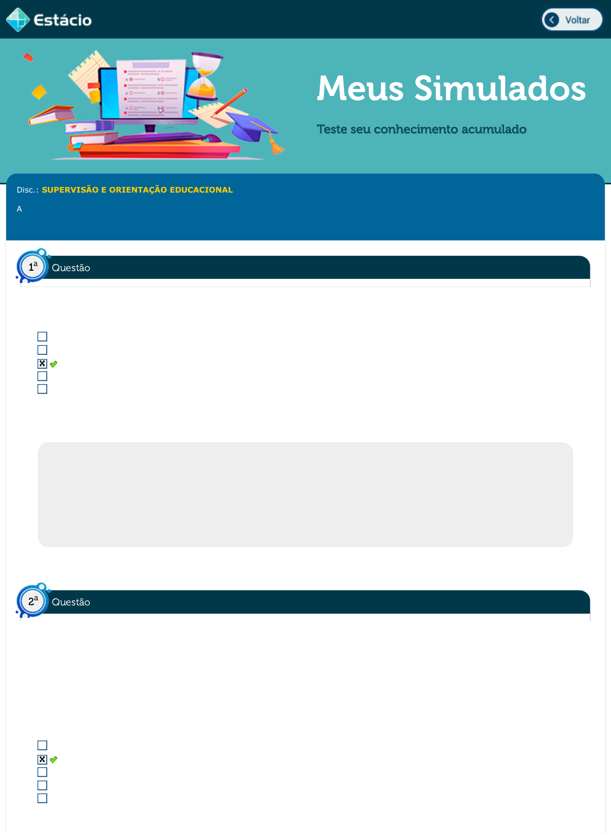 Meus Simulados Teste seu conhecimento acumulado Disc.: SUPERVISÃO E ORIENTAÇÃO EDUCACIONAL Aluno(a): FLAVIA DA SILVA LIMA 202204432201 Acertos: 10,0 de 10,0 07/02/2023 Acerto: 1,0 / 1,0 A Pedagogia tem seu tripé em didática, planejamento e avaliação. Esse trabalho não é somente do docente, mas de toda uma equipe atenta as possibilidades de melhoria. O trabalho da Supervisão Escolar compreende diretrizes ligadas à avaliação e ao planejamento escolar, com o objetivo de: evitar o julgamento das práticas educacionais e o planejamento de ações eficazes. atender apenas a inclusão de crianças com necessidades educativas especiais. mudar as práticas comprometidas com a realidade escolar. estimular uma educação tecnicista, na qual os conteúdos são discutidos em conjunto. controlar o processo de desenvolvimento do currículo dentro do paradigma tradicional. Respondido em 07/02/2023 19:53:01 Explicação: A lógica da supervisão escolar como aquela que investiga e pensa a própria escola buscando soluções abrindo perspectivas ajudando docentes no seu cotidiano a enfrentar novos desafios em termos de políticas públicas, geracionais, tecnológica é um traço fundamental da dinâmica do supervisor nos objetivos dessas práticas. Por isso mudar sim, propor e levar formas de propor mudanças. Controlar currículo em um olhar tradicional, não é o centro do seu trabalho, pelo menos hoje, ou da sua perspectiva nesse sentido a ideia de julgar práticas é algo muito atrasado e pensado em um outro momento. A inclusão deve ser uma perspectiva de toda a escola, nunca excludente, algo que não é só dá supervisão, que sim pensa suas práticas, mas não a define somente pela avaliação pelo planejamento escolar de incluídos. A educação vista como um todo, ele sim deve estimular o conjunto da educação, mas não como uma prática meramente tecnicista é uma escolha por isso não é função clara de supervisor escolar. Acerto: 1,0 / 1,0 O supervisor não é necessariamente quem mais lê, e sim o que mais vivência e pensa acerca dos debates escolares, ainda que sempre busque soluções práticas para suas demandas cotidianas. Neste sentido, leia, com atenção, as afirmativas a seguir: I. O trabalho do Supervisor transcende o conhecimento puro e simples da sala de aula, PORQUE II. O conhecimento discente é suficiente para ser supervisor de uma escola, nos aspectos administrativos e pedagógicos. E assinale: se a segunda afirmativa complementa as ideias da primeira afirmativa. se a primeira afirmativa está correta e a segunda está incorreta. se as duas afirmativas estão corretas. as duas afirmativas estão incorretas. se a primeira afirmativa não está correta e a segunda está correta. Respondido em 07/02/2023 19:56:11 Questão1 a Questão2 a https://simulado.estacio.br/alunos/inicio.asp javascript:voltar(); Explicação: O trabalho do Supervisor transcende o conhecimento puro e simples da sala de aula. Neste sentido, o conhecimento discente é suficiente para ser supervisor de uma escola, nos aspectos administrativos e pedagógicos. O supervisor deve atuar e conhecer todos os ambientes, sujeitos e demandas envolvidos na comunidade escolar. Acerto: 1,0 / 1,0 A formação do Supervisor para a Educação Básica pode ser realizada em cursos de graduação ou de pós-graduação, desde que a Instituição de Ensino garanta nesta formação a estrutura para que ele compreenda o funcionamento da educação brasileira. Atualmente, por exemplo, não podem faltar direcionamentos relativos a: atividades práticas que permitam a simulação da supervisão. conhecimentos específicos de gestão de pessoas, recursos humanos e gestão empresarial. instrumentos pedagógicos a serem aplicados fisicamente. matérias eletivas. a base nacional comum curricular. Respondido em 07/02/2023 19:54:24 Explicação: A base nacional comum curricular é hoje um dos grandes desafios da educação no seu processo alimentação não é possível que na formação de professores hoje não esteja prevista por força de lei os elementos pertinentes a base nacional curricular e a suas formas de implementação daí na formação de um supervisor pedagógico ele não pode renunciar a nenhuma forma de ter efetivamente o desenvolvimento deixa o conteúdo. Acerto: 1,0 / 1,0 (Nova Friburgo - RJ / 2015 - adaptada) Na escola, o orientador educacional é um dos membros da equipe gestora, ao lado do diretor e do coordenador pedagógico. Ele é o principal responsável pelo desenvolvimento pessoal de cada aluno, dando suporte a sua formação como cidadão, à reflexão sobre valores morais e éticos e à resolução de conflitos. Gestão Escolar. Disponível em: https://gestaoescolar.org.br/conteudo/233/o-papel-do-orientador-educacional. Acesso em: 7 dez. 2021. Ao trabalhar com crianças que apresentam baixo rendimento escolar, numa escola que atende a população de baixa renda, uma ATITUDE ADEQUADA do Orientador Educacional consiste em: Apresentar aos alunos os resultados de suas avaliações, e deixar que eles próprios resolvam suas dificuldades escolares. Reconhecer que a escola nada pode fazer para melhorar a situação dos alunos carentes e, portanto, desistir de trabalhar com eles. Realizar estudos de casos com todos os alunos que apresentam dificuldades de aprendizagem, coletando o maior número possível de informações. Envolver toda a equipe escolar, as famílias e os próprios alunos na discussão desses problemas de rendimento e das alternativas de solução para eles. Comunicar ao Conselho Tutelar o baixo rendimento dos alunos, deixando a cargo deles a resolução dessa questão. Respondido em 07/02/2023 20:03:26 Explicação: Gabarito: Envolver toda a equipe escolar, as famílias e os próprios alunos na discussão desses problemas de rendimento e das alternativas de solução para eles. Justificativa: Essa questão se refere a atuação do Orientador Educacional. Ele deve sempre zelar pelo dese