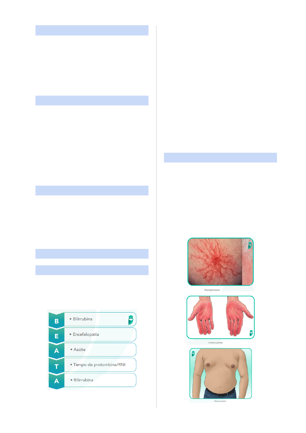 - Fabiana Bilmayer I Hepatologia CIRROSE HEPÁTICA Fique atento, a cirrose representa o estágio final das doenças que causam lesão hepática crônica. Independentemente da etiologia, na cirrose encontramos fibrose hepática, desorganização do parênquima hepático e nódulos de hepatócitos em regeneração envoltos por septos fibrosos. FISIOPATOLOGIA CÉLULA ESTRELADA! Injúria hepática crônica >> Ativação da célula ESTRELADA (célula que armazena vitamina A) >> Produção de matriz extracelular + célula estrelada passa a ter um papel contrátil no miofibroblasto (contrai o sinusóide e contribui para o aumento da resistência vascular intra-hepática = hipertensão portal = fibrose >>>> insuficiência hepática ETIOLOGIA - Hepatite C - Doença hepática alcoólica - Doença hepática gordurosa não alcoólica Estas 3 condições são responsáveis por mais de 80% dos casos. MANIFESTAÇÕES CLÍNICAS CLASSIFICAÇÃO FUNCIONAL ● CHILD-PUGH - BEATA Varia de 5 a 15 pontos. Classifica o paciente em 3 classes. Avalia prognóstico e sobrevida dos pacientes. 3 variáveis laboratoriais e 2 clínicas = 5 parâmetros. - Não existe Child-Pugh 0, SEMPRE começa com no mínimo 5 pontos. ● 5 a 6 pontos = Child A = mortalidade em 10% (A5) ● 7 a 9 pontos = Child B = mortalidade de 30% (B7) ● 10 a 15 pontos = Child C = mortalidade de 82% (C10) ● MELD - BIC Utilizada para lista de espera do transplante. Avalia o risco de óbito em 3 meses caso o transplante não seja realizado. - Valores de 6 a 40. B) Bilirrubina I) INR C) Creatinina ACHADOS DA CIRROSE HEPÁTICA - Icterícia - Ginecomastia (aumento do tecido mamário) - Ascite - Edema - Cabeça de medusa - Hepatomegalia ou atrofia - Hiperandrogenismo (telangiectasias e eritema palmar) - Hipoandrogenismo - Fabiana Bilmayer I Hepatologia DIAGNÓSTICO - Achados clínicos típicos - Hipoalbuminemia - Alargamento do tempo de protrombina (> 5 segundos, acima do tempo de controle) - INR > 1,5/1,7 INVESTIGAÇÃO DA ETIOLOGIA ● História de etilismo ● Sorologia para hepatites virais ● Anticorpos para hepatite autoimune ● Saturação da transferrina e ferritina ● Dosagem da alfa-1-antitripsina Hemograma - Plaquetopenia - Anemia - Leucopenia COMPLICAÇÕES DA CIRROSE - Varizes de esôfago - Ascite - Hepatocarcinoma - Encefalopatia hepática - Síndrome hepatorrenal - Esplenomegalia - Peritonite bacteriana espontânea (PBE) Todo indivíduo com cirrose deve fazer rastreamento de HEPATOCARCINOMA: USG de abdome e alfafetoproteína a cada 6 meses Todo indivíduo com cirrose deve fazer uma ENDOSCOPIA DIGESTIVA ALTA para avaliação de VARIZES ESOFÁGICAS ASCITE GASA - GRADIENTE ALBUMINA SORO ASCITE SERVE PARA DETERMINAR A ETIOLOGIA ALBUMINA SÉRICA - ALBUMINA DO LÍQUIDO ASCÍTICO ● > 1,1 = hipertensão portal (cirrose principal causa / hepatite) ● < 1,1 = outras / neoplasia / tuberculose TRATAMENTO DA ASCITE POR CIRROSE - Restrição de sódio - Diuréticos - Espironolactona - Furosemida (nunca utilizar isoladamente) ORLANDO (LEÃOZINHO) CIRROSE HEPÁTICA ● Eritrócitos: 2,82 ● Hb: 10,24 ● Plaquetas: 149.000 ● Leucócitos: 15.150 ● Bastonetes: 21% ● Ureia: 89 (15 a 40) ● Creatinina: 2,34 ● Fosfatase alcalina: 393 (<270) ● Gama GT: 329 (0-50) ● Albumina: 2,20 (3,5 a 5,5) ● Bilirrubinas >> total: 24,14 (até 1,4) / direta 13,58 (até 0,4) / indireta 10,56 (até 1.0) ● TAP: 24,1 (10 a 15 segundos) ● INR: 2,46 (2,0 a 3,5) ● TGO: 244 ● TGP: 72 ● Potássio: 2,6 - Fabiana Bilmayer I Hepatologia QUESTÕES Descompensação da ascite em cirrótico Conduta: ESPIRONOLACTONA Mecanismo de ação: age no ducto coletor como antagonista da aldosterona, esses canais estimulam a reabsorção de sódio, em troca de potássio ou hidrogênio. Creatinina não faz parte do Child-Pugh Quais são os exames de prova de função hepática? 1. Bilirrubina sérica 2. Albumina sérica 3. Tempo de protrombina (TAP) ou INR 4. Encefalopatia 5. Ascite Síndrome de Gilbert É o distúrbio do metabolismo da bilirrubina mais comum. - Prevalência de 4 a 16%. Ocorre por deficiência PARCIAL da glucoronil-transferase (reduzida em 10% a 35%). A maioria dos pacientes apresentam-se com episódios esporádicos de icterícia, sem outros sintomas. Caracterizada por discreta hiperbilirrubinemia indireta. O uso de fenobarbital regulariza a bilirrubina na maioria das vezes. METAVIR Escore que avalia grau de fibrose hepática Muito utilizado em pacientes com hepatite B e C BIÓPSIA DE FÍGADO O conceito de cirrose é anatomopatológico, razão pela qual o diagnóstico de certeza deveria ser firmado por meio da biópsia hepática. Ademais, com frequência, pacientes com cirrose têm alterações da coagulação ou ascite, que limitam ou contraindicam realizar a própria biópsia. PERITONITE BACTERIANA ESPONTÂNEA É definida pela contagem de PLMN > 250mm no líquido ascítico. Essa infecção geralmente é monobacteriana sendo a E.Coli o agente etiológico mais comum. ATRESIA DE VIA BILIAR Suspeitar sempre quando icterícia prolongada com bilirrubina DIRETA alta.