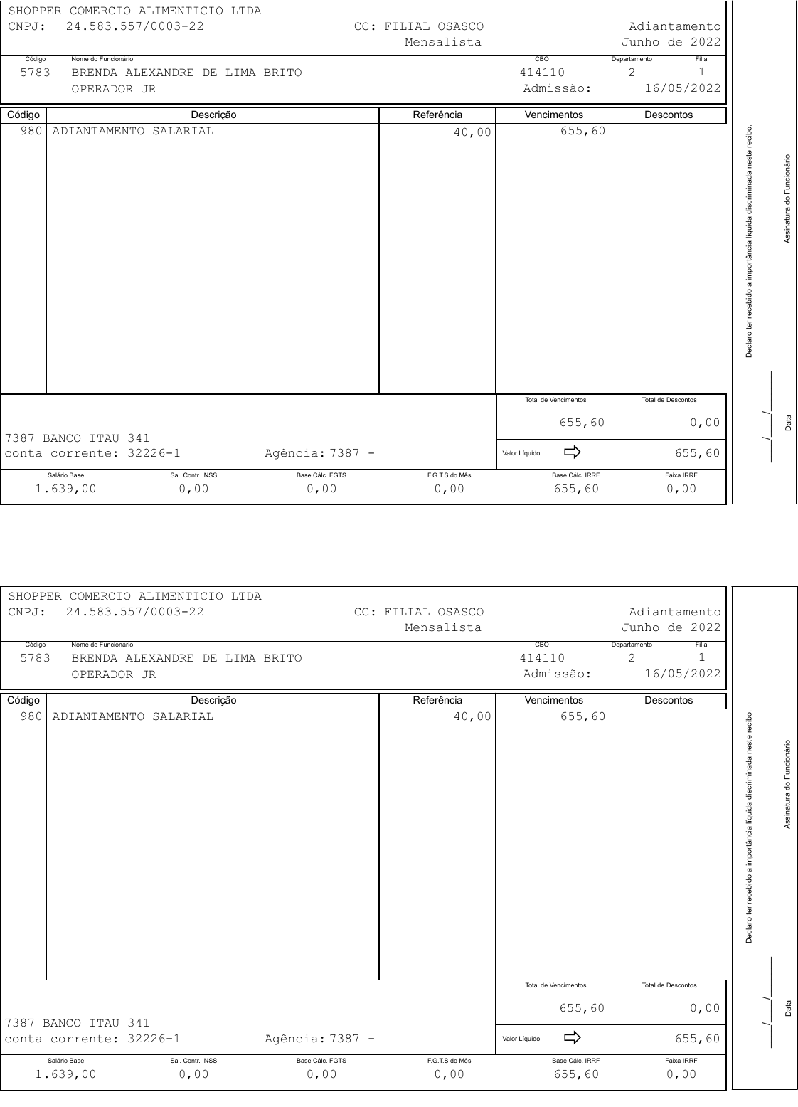 conta corrente: 32226-1 As si na tu ra d o Fu nc io ná rio 0,00 655,60 Código Descrição Referência Vencimentos Descontos 980 ADIANTAMENTO SALARIAL 40,00 655,60 SHOPPER COMERCIO ALIMENTICIO LTDA 24.583.557/0003-22CNPJ: CC: 5783 Código BRENDA ALEXANDRE DE LIMA BRITO Nome do Funcionário CBO 414110 Departamento 2 Filial Adiantamento Junho de 2022 FILIAL OSASCO Mensalista Admissão: 16/05/2022OPERADOR JR 1 conta corrente: 32226-1 0,00 Sal. Contr. INSS 1.639,00 Salário Base 7387 BANCO ITAU 341 Agência: 7387 - Total de Vencimentos Valor Líquido Total de Descontos Base Cálc. FGTS 0,00 F.G.T.S do Mês Base Cálc. IRRF 655,60 Faixa IRRF 0,000,00 D ec la ro te r r ec eb id o a im po rtâ nc ia lí qu id a di sc rim in ad a ne st e re ci bo . 655,60 0,00 655,60 Código Descrição Referência Vencimentos Descontos 980 ADIANTAMENTO SALARIAL 655,60 __ __ /_ __ _/ __ __ __ _ SHOPPER COMERCIO ALIMENTICIO LTDA 24.583.557/0003-22CNPJ: CC: 5783 Código BRENDA ALEXANDRE DE LIMA BRITO Nome do Funcionário CBO 414110 Departamento 2 Filial Adiantamento Junho de 2022 FILIAL OSASCO Mensalista Admissão: 16/05/2022OPERADOR JR 1 0,00 Sal. Contr. INSS 1.639,00 Salário Base 7387 BANCO ITAU 341 Agência: 7387 - Total de Vencimentos Valor Líquido Total de Descontos Base Cálc. FGTS 0,00 F.G.T.S do Mês Base Cálc. IRRF 655,60 Faixa IRRF 0,000,00 As si na tu ra d o Fu nc io ná rio D ec la ro te r r ec eb id o a im po rtâ nc ia lí qu id a di sc rim in ad a ne st e re ci bo . 655,60 40,00 __ __ /_ __ _/ __ __ __ _ D at a D at a