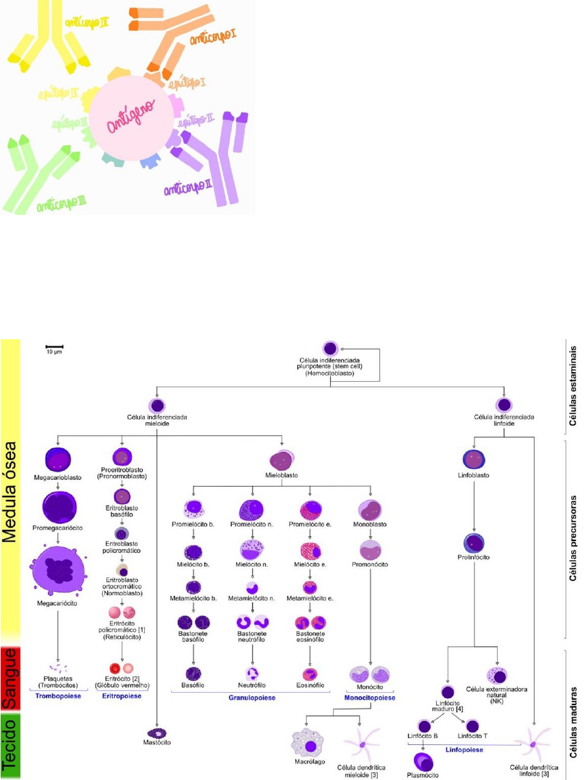 IMUNOLOGIA MARIANA AFONSO COSTA – MEDICINA: 4º PERÍODO 1 AULA 1 INTRODUÇÃO À IMUNOLOGIA Imunologia é o ramo da miologia que estuda o sistema imunológico dos seres vivos e sua habilidade de responder a ação de agentes patogênicos. Na visão moderna, a imunologia está relacionada a regulação e homeostase do organismo. A imunologia é uma ciência experimental, e o principal feito dessa área são as vacinas. Em 1789, o médico Edward Jenner observou, numa época em que a varíola estava em alta, que pessoas que ordenhavam vacas não contraíam a doença, desde que tivessem adquirido sua forma animal (cowpox). Com isso, em 1796, Jenner extraiu o pus da mão de uma ordenhadora que havia contraído a doença e inoculou em um menino saudável de 8 anos. O menino contraiu a doença e depois se curou. A partir daí, Jenner inoculou, nesse mesmo menino, o líquido extraído de uma pústula de varíola humana, e ele não contraiu a doença, ou seja, estava imune a doença. Termos importantes: · Imunógeno – qualquer substância capaz de desencadear uma resposta imunológica. · Antígeno – qualquer substância que se ligue os receptores específicos de linfócitos, levando à produção de anticorpos. - Linfócitos B produzem anticorpos para combater e/ou neutralizar os antígenos quando expostos a ele. OBS.: Todo antígeno é um imunógeno, a diferença é que antígenos atua especificamente em linfócitos. · Epítopos Antigênicos – região de ligação do anticorpo ao antígeno. - Os anticorpos são específicos para os epítopos, ou seja, cada anticorpo possui um epítopo específico. · Haptenos – moléculas pequenas que podem se ligar a receptores de linfócitos, mas não são capazes de, por si só, estimular uma resposta imune específica. Eles devem ser quimicamente unidos a carreadores proteicos para poder ativar linfócitos T e B, para, aí sim, estimular a produção anticorpos. OBS.: Os carreadores só servem para aumentar o peso moléculas dos haptenos. · Hematopoese – processo responsável pela formação das células do sangue: as células se desenvolvem a partir de células tronco produzidas na medula óssea e no fígado fetal. É regulada por citocinas e fatores de crescimento. Um indivíduo com leucemia tem células que se multiplicaram desordenadamente, provocando um déficit de plaquetas , pois as células do sistema imune não conseguem competir com as tumorais. Cada uma das células do sistema imune tem tempo de vida, funcionamento, e etc., diferentes. O funcionamento da medula óssea é analisado por meio do hemograma, que, se estiver sadia é apresentado de forma constante. - Período Mesoblástico: eritrócitos. - Período Hepato-Esplênico: eritrócito, granulócito e plaquetas. IMUNOLOGIA MARIANA AFONSO COSTA – MEDICINA: 4º PERÍODO 2 - Hematopoese Definitiva medula óssea vermelha (é perdida ao longo dos anos). · Moléculas CD (“Cluster of Differentiation”) – moléculas de superfície celular expressas em vários tipos celulares, podendo atuar como receptores, ligantes (ativar receptores) ou proporcionar adesão celular. Os Linfócitos T são formados pela medula óssea, e é no timo que ele amadurece e recebe seus marcadores específicos. Já os Linfócitos B são formados e amadurecidos na medula óssea. - Linfócitos T – CD1, CD2, CD3, CD4 ou CD8 (o que possui CD4 não possui CD8, vice-versa), CD5, CD6, CD7. - Linfócitos B – CD19, CD20, CD22, CD9, CD10, CD7a, CD7b. Para verificar o tipo de linfócito carente, é necessário um exame específico via citometria de fluxo, que analisa a pesquisa fenotípica de antígenos de superfície celular. OBS.: A contagem de CD4 e CD8 é rotina para paciente com HIV. · Citocinas – proteínas produzidas por diferentes tipos de células, responsáveis por mediar reações inflamatórias e imunes. São os principais mediadores de comunicação entre as células do sistema imune. - As citocinas se ligam aos receptores das células desencadeando uma resposta (não entram nas células). - Propriedades Gerais: (1). São produzidas durante as fases efetoras da imunidade natural e específica; (2). São mediadores e reguladores de respostas imunes e inflamatórias; (3). São secretadas de maneira autolimitada (só o necessário); (4). O RNAm codificados das citocinas são instáveis; (5). A mesma citocina é produzida por diferentes células; (6). Pleiotropismo – agem em células diferentes desencadeando respostas diferentes, desde que tenha receptor para ela; (7). Redundância – diferentes citocinas possuem o mesmo efeito; (8). Antagonismo – podem atuar ativando ou inibindo macrófagos; (9). Sinergia – aumentam MHC classe I nas células; (10). Agem por meio da ligação a receptores específicos; (11). Possuem ação parácrina, autócrina e endócrina; (12). A expressão de seus receptores é regulada por sinais específicos, que podem vir de outra citocina ou dela mesma. Em suma, as citocinas são mediadores da imunidade natural, reguladoras da ativação, crescimento e diferenciação de linfócitos, reguladores de inflamação e estimuladores de crescimento e diferenciação de leucócitos maduros. As citocinas também podem ser chamadas de Interleucinas (IL). · Quimiocinas – um tipo de citocinas de baixo peso molecular (PM), responsáveis por estimular a quimiotaxia de leucócitos, por regular a migração destes para os tecidos através da ativação de integrinas, e pela manutenção da organização espacial dos linfócitos e células do sistema imune dentro dos órgãos linfoides. · Fatores de Transcrição – proteínas que ajudam a transformar genes específicos em “ligados” ou “desligados” através da conexão com um DNA próximo. Fatores de transcrição ativadores impulsionam a transcrição de um determinado gene, enquanto os repressores reduzem essa transcrição. IMUNOLOGIA MARIANA AFONSO COSTA – MEDICINA: 4º PERÍODO 3 Esses fatores permitem que as c
