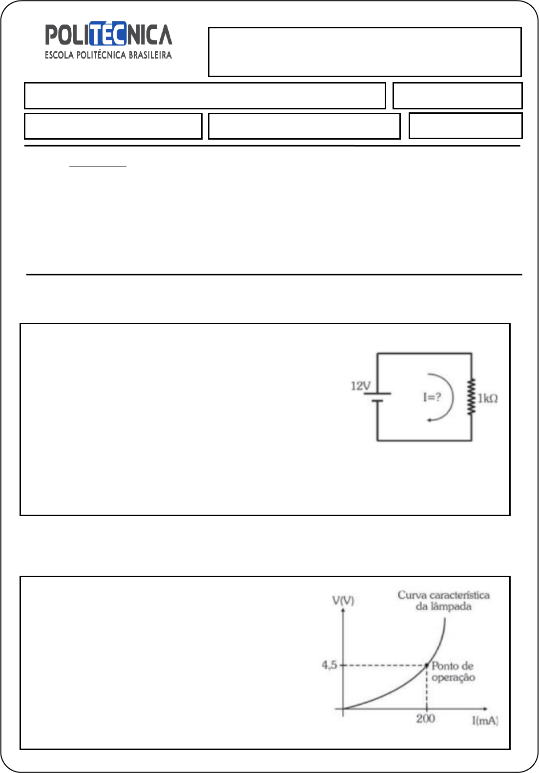 Atividade de Pesquisa: ELETRICIDADE I 1) Qual é a intensidade da corrente elétrica que passa por uma resistência de 1kΩ submetida a uma tensão de 12V? 2) A lâmpada da lanterna possui comportamento não ôhmico devido, principalmente, à temperatura do filamento durante a incandescência. Determine a resistência da lâmpada para a sua condição normal de operação: V = 4,5V e I = 200mA. ELETRICIDADE I Aluno (a): David batista conrado Data: 09 /02 /2023 Atividade de Pesquisa NOTA: INSTRUÇÕES: → Esta Atividade contém 17 questões. Totalizando 10 pontos. → Preencher devidamente seus dados no cabeçalho. → Utilize o espaço delimitado abaixo de cada questão para as suas respostas. → Ao terminar grave o arquivo com o nome Atividade de Envio (nome do aluno). → Salve o arquivo no formato .pdf e envie pelo sistema. V=RI R=V/I......= 4.5V/0,2A = 22,5Ω I=0,012A Atividade de Pesquisa: ELETRICIDADE I 3) Determine a resistência de um fio de cobre de 4 mm de diâmetro e 10 km de comprimento. 4) Considere um resistor com as seguintes especificações: 1kΩ - 1/2W. resistividade do cobre 1,68.10^-8 R=PL/A 10km=10^4m A=(2.10-3)^2. =4.10^-6 m^2 R=1,68.10^- 8.10^4/4.10^-6 =14ohms a) Qual é a corrente Imáx e a tensão Vmáx que ele pode suportar? b) Que potência P’ ele dissiparia caso a tensão aplicada V’ fosse metade de Vmáx? c) Quanto vale a relação Pmáx / P’ e qual conclusão pode ser tirada? a) 22,4mA 22,32V b)0,12W c) 4,17 Atividade de Pesquisa: ELETRICIDADE I 5) Uma lâmpada residencial está especificada para 127V / 100W. Determine: 6) Uma turbina de uma usina hidrelétrica com capacidade de 100.000 kWh abastece uma região com tensão de 127V. Quantas lâmpadas de 200W/127V essa turbina pode alimentar simultaneamente? 7) No circuito ao lado, são conhecidos os valores de E1, E3, V1, V2 e V4. Determine E2 e V3 para que a lei de Kirchhoff para tensões seja válida. a) A energia elétrica consumida por essa lâmpada num período de cinco horas diárias em um mês de 30 dias; b) O valor a ser pago por esse consumo, sabendo que a empresa de energia elétrica cobra a tarifa de R$ 0,30 por kWh mais um imposto de 33,33%. a) E = P.Δt 5 horas (uso diário) . 30 dias = 150 horas(uso mensal) E = P.Δt => E = 100W.150 h E = 15.000 Wh ou 15 kWwh b) 15 kWh/mensal . 0,30 R$/kWh = 4,50 R$/mensal + 33% = 1,45 total=5,985 R$/mensal E=105.10³W.h--->E=108W.h Cada lâmpada ---> 200 W ---> Em 1 hora ----> e = 200 W.h ---> Para x lâmpadas ---> 200.x W.h 200.x = 108 ---> 2x = 10.105 ----> x = 5.105 ---> x = 500 000 E2=10V. V3=22V. Atividade de Pesquisa: ELETRICIDADE I 8) Determine a resistência equivalente entre os terminais A e B do circuito: 9) Determine a tensão, a corrente e a potência em cada resistor da rede resistiva ao lado. resistência equivalente entre os terminais A e B do circuito.= 30Ω i1= 4mA v1=2V p1= 8mW i2=2,2mA v2=18V p2=39,6mW i3= 1,8mA v3=18V p3=32,4mV Atividade de Pesquisa: ELETRICIDADE I 10) Determine a tensão e a corrente no resistor R4 do circuito ao lado. 11) No circuito ao lado, determine a potência dissipada pelo resistor R5, sabendo que I2 = 120mA i=5mA R=4400Ω v1=5V v2=11V v4=6V i4=2,5mA R=175Ω i1=0,24A i2=0,12A i3=0,12A i4=0,06A i5=0,05A P5=360mV Atividade de Pesquisa: ELETRICIDADE I a) A resistência equivalente do circuito; b) A corrente total fornecida pela fonte de alimentação ao circuito. 12) No circuito ao lado, determine a resistência equivalente e a corrente fornecida pela fonte de alimentação. 13) Considere a rede resistiva ao lado e determine: Req=75Ω i=0,33A Req= 142Ω i=105mA Atividade de Pesquisa: ELETRICIDADE I i=0,15A Rr=20Ω Req=15,67Ω R2=72,4Ω i1= 2,55mA ... i2=21,44mA 14) Um rádio AM/FM portátil funciona, em condições normais de operação, com as seguintes especificações: 3V/450mW. Qual deve ser o valor do resistor R2 para que esse rádio opere a partir de uma fonte de 12V, conforme a montagem ao lado? Observação: O divisor de tensão é formado por R1 e R2 // Rrádio. 15) Considerando o divisor de corrente ao lado, determine I1 e I2 a partir da sua equação geral. Atividade de Pesquisa: ELETRICIDADE I 16) Dado o circuito ao lado, determine a corrente e a tensão na carga RL pelo método de Thévenin, para cada um dos valores seguintes que ela pode assumir: RL1 = 100Ω; RL2 = 500 Ω; RL3 = 1,5kΩ. RTH=319,7ohms ETH=0,33V 17) Considere o circuito RC ao lado, no qual o capacitor encontra-se totalmente descarregado. Atividade de Pesquisa: ELETRICIDADE I Atividade de Pesquisa: ELETRICIDADE I