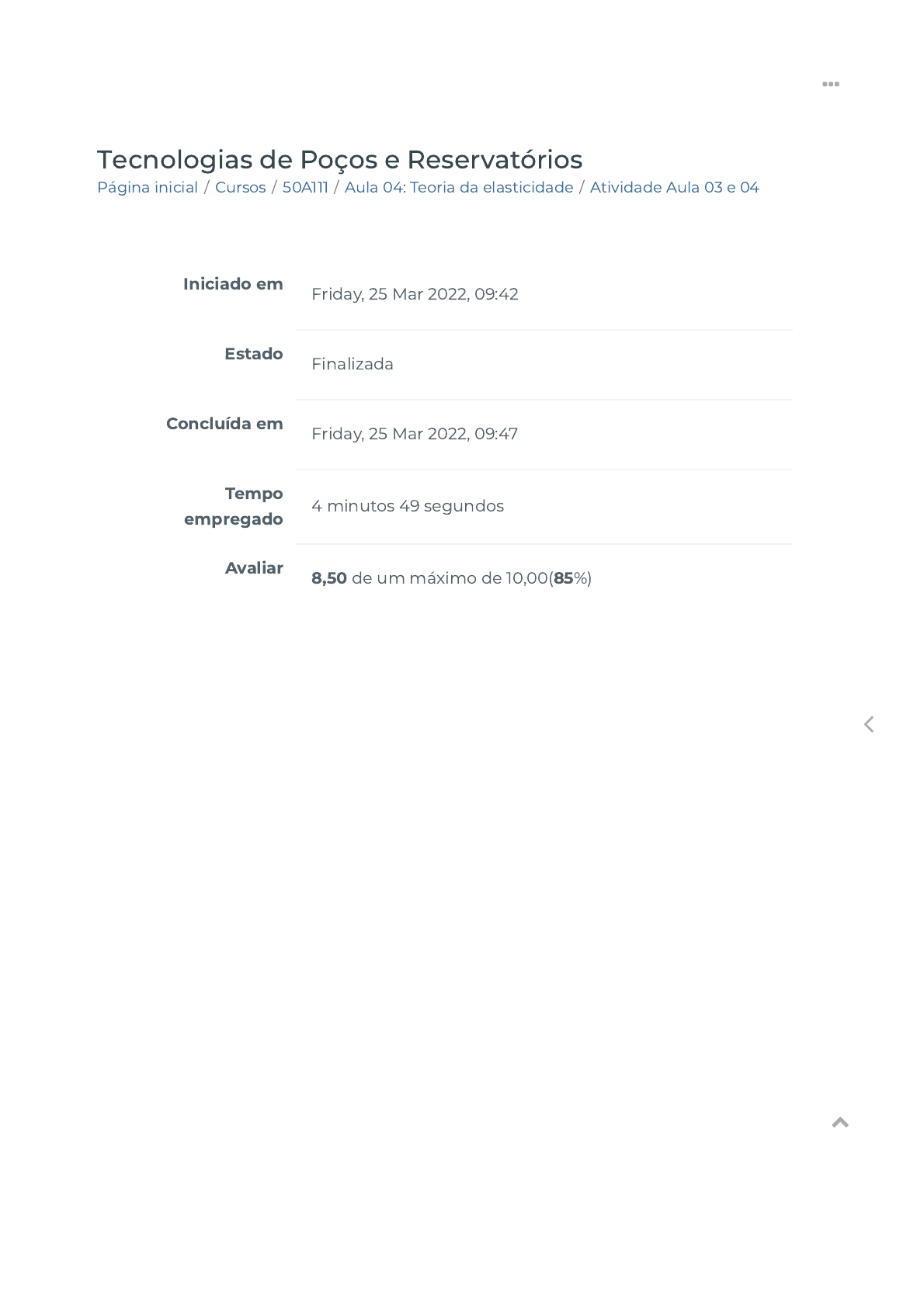 25/03/2022 09:47 Atividade Aula 03 e 04 https://ava.politecnicabr.com.br/mod/quiz/review.php?attempt=2804222#q3 1/9 Página inicial / Cursos / 50A111 / Aula 04: Teoria da elasticidade / Atividade Aula 03 e 04 Tecnologias de Poços e Reservatórios Iniciado em Friday, 25 Mar 2022, 09:42 Estado Finalizada Concluída em Friday, 25 Mar 2022, 09:47 Tempo empregado 4 minutos 49 segundos Avaliar 8,50 de um máximo de 10,00(85%) https://ava.politecnicabr.com.br/ https://ava.politecnicabr.com.br/course/index.php https://ava.politecnicabr.com.br/course/view.php?id=1087 https://ava.politecnicabr.com.br/course/view.php?id=1087#section-5 https://ava.politecnicabr.com.br/mod/quiz/view.php?id=36786 https://ava.politecnicabr.com.br/ 25/03/2022 09:47 Atividade Aula 03 e 04 https://ava.politecnicabr.com.br/mod/quiz/review.php?attempt=2804222#q3 2/9 Questão 1 Correto Atingiu 1,00 de 1,00 Quanto a relação constitutiva para rochas, marque corretamente. ( ) As rochas se comportam da mesma forma que os metais frágeis; ou seja, elas deformam linearmente sob pequenas cargas, mas de forma não linear ou plástica sob carregamentos mais altos. Portanto, o modelo elástico e inelástico combinado linearizado pode representar muitos materiais, incluindo rochas, com uma precisão razoável. No entanto, dependendo dos materiais rochosos, às vezes um modelo mais preciso pode ser necessário. Escolha uma opção: Verdadeiro Falso https://ava.politecnicabr.com.br/ 25/03/2022 09:47 Atividade Aula 03 e 04 https://ava.politecnicabr.com.br/mod/quiz/review.php?attempt=2804222#q3 3/9 Questão 2 Incorreto Atingiu 0,00 de 1,50 Pode-se observar que não existem tensões de cisalhamento no estado de tensão hidrostático e que seria apresentado como um ponto sobre o eixo de tensão normal no círculo de Mohr. Portanto, pode-se concluir corretamente que: Escolha uma opção: a. um �uido em movimento não pode transmitir tensões de cisalhamento. b. as tensões de cisalhamento surgem quando as tensões principais são iguais. c. um �uido sob compressão está em equilíbrio hidrostático. d. nenhuma das alternativas corretas. e. mais de uma alternativa correta. https://ava.politecnicabr.com.br/ 25/03/2022 09:47 Atividade Aula 03 e 04 https://ava.politecnicabr.com.br/mod/quiz/review.php?attempt=2804222#q3 4/9 Questão 3 Correto Atingiu 1,50 de 1,50 Com base na Figura 4.2, marque corretamente. ( ) Considere uma haste com comprimento inicial ∫ sob tração, como mostrado na Figura 4.2. Aplicando-se uma carga axial à haste, ela se estende a um comprimento adicional Δ∫ = ∫ – ∫ . Pode- se perceber que a haste se alonga na direção axial, e porque o seu volume deve permanecer constante, ela se tornará mais �na na seção intermediária transversal. Escolha uma opção: o o Verdadeiro Falso https://ava.politecnicabr.com.br/ 25/03/2022 09:47 Atividade Aula 03 e 04 https://ava.politecnicabr.com.br/mod/quiz/review.php?attempt=2804222#q3 5/9 Questão 4 Correto Atingiu 1,50 de 1,50 Marque Verdadeiro ou Falso quanto a Lei de Hooke no cisalhamento: ( ) O segundo grupo de estruturas é, no entanto, mais complexo e suas reações e forças internas não podem ser avaliadas somente pela equação de equilíbrio. ( ) Estruturas podem ser classi�cadas em dois grupos principais: (i) estruturas estaticamente determinadas e (ii) estruturas estaticamente indeterminadas. ( ) A característica do primeiro grupo é que suas reações e forças internas podem ser determinadas exclusivamente a partir de diagramas de corpo livre e a equação de equilíbrio. ( ) Para analisar tais estruturas, devemos fornecer equações adicionais referentes à sua deformação/deslocamento. Escolha uma opção: a. V, V, V, V. b. V, F, V, V. c. V, F, F, V. d. F, V, V, V. e. F, F, F, F. https://ava.politecnicabr.com.br/ 25/03/2022 09:47 Atividade Aula 03 e 04 https://ava.politecnicabr.com.br/mod/quiz/review.php?attempt=2804222#q3 6/9 Questão 5 Correto Atingiu 1,50 de 1,50 Assinale Verdadeiro ou Falso: ( ) A Equação J é frequentemente utilizada nos cálculos de resistência de cisalhamento de materiais e é conhecida como Teoria de ruptura de Von Mises. Escolha uma opção: 2 Verdadeiro Falso https://ava.politecnicabr.com.br/ 25/03/2022 09:47 Atividade Aula 03 e 04 https://ava.politecnicabr.com.br/mod/quiz/review.php?attempt=2804222#q3 7/9 Questão 6 Correto Atingiu 1,50 de 1,50 Marque a alternativa correta para traçar o círculo do Mohr a partir de determinado estado de tensão de duas dimensões: Escolha uma opção: a. sobre o eixo das tensões de cisalhamento, marque t correspondente a σ e –t para δ xy x xy y b. marque σ e σ sobre o eixo de tensão normal (considerar compressão positiva para materiais rochosos x y c. trace uma linha entre os dois pontos e faça um círculo com centro na intersecção desta linha com o eixo de σx d. mais de uma alternativa correta e. nenhuma alternativa correta https://ava.politecnicabr.com.br/ 25/03/2022 09:47 Atividade Aula 03 e 04 https://ava.politecnicabr.com.br/mod/quiz/review.php?attempt=2804222#q3 8/9 Questão 7 Correto Atingiu 1,50 de 1,50 Marque Verdadeiro ou Falso quanto ao material de aula. ( ) O grau de deformação de uma estrutura depende da magnitude de uma carga ou tensão imposta. O elemento de tensão é, portanto, fundamental em mecânica dos sólidos. No entanto, a tensão não pode ser medida diretamente. Escolha uma opção: Verdadeiro Falso Entre em Contato https://www.politecnicabr.com.br 0800 084 2627 indisponível devido a pandemia de COVID-19, use outro canal! 0800 084 2627 comercial@politecnicabr.com.br Links Úteis Dicas da nossa Diretora Acadêmica Planner de Estudos Declaração de Matrícula Orientações do AVA Abertura de Ticket Fale com o Tutor Cronograma de Estudos Manual de Estágio Manual de Competência Siga-nos nas redes sociais https://www.politecnicabr.com.br/ mailto:comercial@politecnicabr.com.br https://soundcloud.com/user-501638417/sets/escola-politecnica-brasi