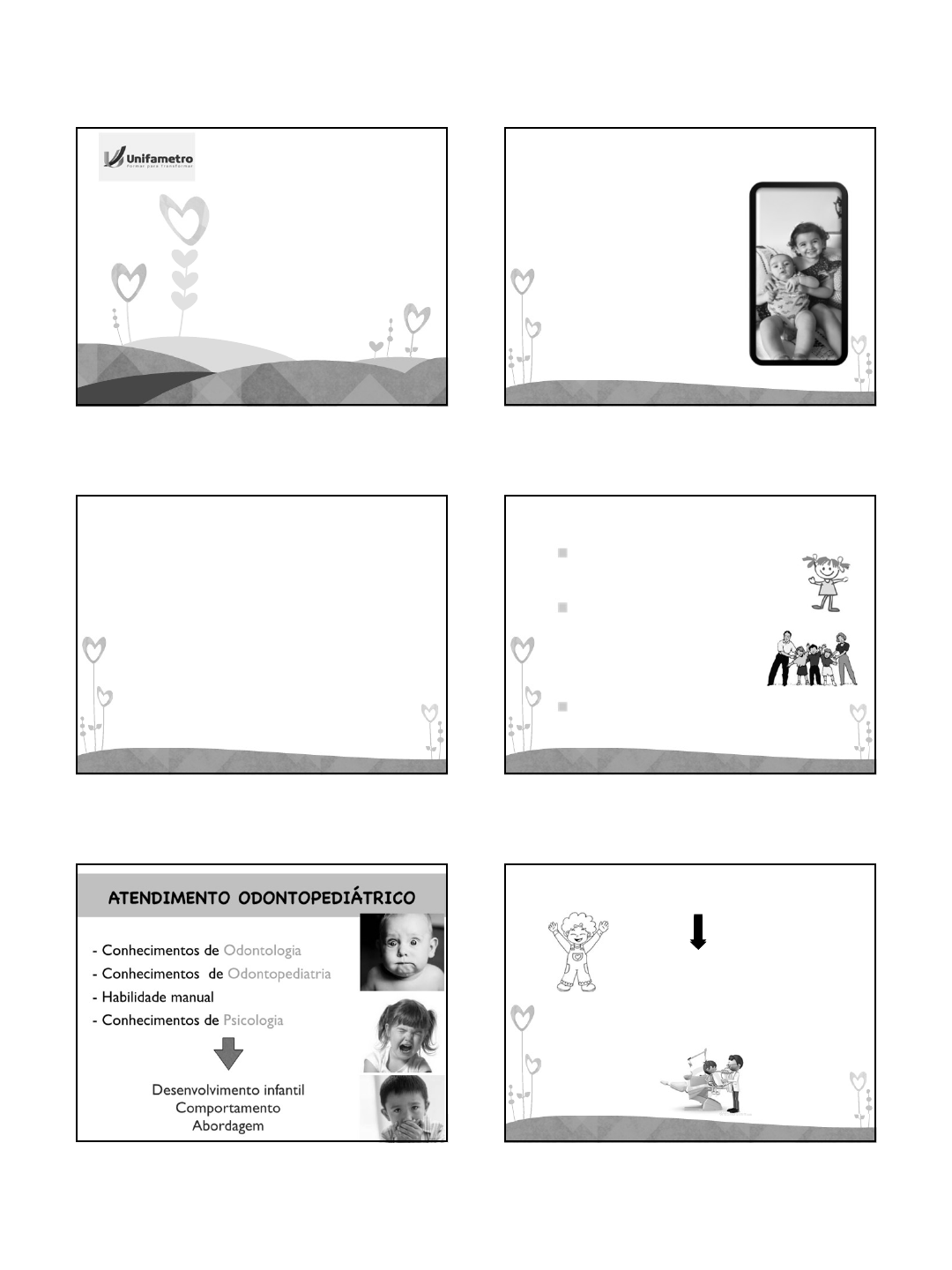 17/08/2021 1 MANEJO DO COMPORTAMENTO INFANTIL Prof: Mirella de Sousa Pereira Agosto, 2021 ODONTOPEDIATRIA É uma especialidade da Odontologia que cuida da saúde bucal de crianças, desde o nascimento até a adolescência. ORTODONTIA A Ortodontia é a especialidade da Odontologia relacionada ao estudo, prevenção e tratamento dos problemas de crescimento, desenvolvimento e amadurecimento da face, dos arcos dentários e da oclusão, ou seja, disfunções dento-faciais. ODONTOPEDIATRIA Cuidados bucodentais Cuidados preventivos quanto comportamento, hábitos e doenças Educação e Promoção de saúde do paciente e núcleo familiar Google Imagens CONHECIMENTO DA CRIANÇA Qualidade do relacionamento durante o tratamento odontológico 17/08/2021 2 CONDIÇÕES BÁSICAS PARA O TRATAMENTO DE CRIANÇAS 1- Qualidades profissionais • Amar as crianças / Fazer-se querido • Gostar de tratar crianças • Boa comunicação (nível do diálogo/ tom de voz) • Paciência / Autoridade • Capacidade de persuadir e convencer • Conhecimento de Odontologia/ Odontopediatria/ Psicologia infantil Guedes Pinto e Corrêa, 1997 2- Características relevantes do profissional • Aparência (Equipamento de Proteção Individual) • Segurança profissional • Habilidade e rapidez • Organização e cuidado com instrumental O uso do EPI e da roupa branca NÃO SÃO empecilhos para o atendimento infantil Apresentação gradativa destes acessórios. Cohen, 1973; Molinari, 1992; Oliveira et al., 2002 Odontopediatria X Psicologia infantil ODONTOPEDIATRIA Conhecimentos a respeito dos estágios de desenvolvimento psicológico da criança Influência dos estágios no comportamento infantil durante o tratamento Desenvolvimento psicológico O desenvolvimento de uma criança pode ser revelado pela forma como se comporta, este desenvolvimento é contínuo, identificando-se fases, não só ao longo dos primeiros anos, mas também da infância, adolescência, juventude e até o fim da vida. A Harmonia e Alegria familiar são experiências que serão sentidas pelo feto, influenciando diretamente no comportamento do bebê após o nascimento. O PRIMEIRO ANO DE VIDA PRIMEIRAS SEMANAS: satisfação de suas necessidades, não há qualquer diferenciação entre ele e a mãe sistema unitário (sensação de abandono quando afastado da mãe) 6 MESES: diferenciação entre a mãe e o outro, medo de pessoas estranhas, sorrir para pessoas conhecidas. Com aparecimento dos dentes o bebê pode começar a morder Mahler et al., 1977 17/08/2021 3 10 MESES: capacidade de engatinhar; ansiedade de separação; começa a apresentar vontades; vocaliza e sorrir. Durante o atendimento odontológico pode cantar, linguagem simples de modo que assim facilite a compreensão da criança nesse novo ambiente 12 MESES: locomoção na posição ereta. A presença dos pais no consultório é essencial para que eles conheçam o trabalho do profissional, entendam as condutas, sentirem-se mais seguros. Coutinnho, 1978; Guthrie, 1997 Primeiro ano de vida do bebê: criança não suporta ficar muito tempo na mesma posição. 18 MESES: fase de frustração, carência, ansiedade e exigência. A separação dos pais pode causar ansiedade Mahler et al., 1977 A criança se interessa por histórias ou brinquedos, tornam-se atentas. “A comunicação melhora de acordo com a melhor interação com o profissional. Nessa fase a criança sente-se motivada pelo elogio e pela premiação.” 2 ANOS DE IDADE •Transição do estágio de dependência para o de responsabilidade pessoal e autocontrole • Negativismo evidente • Resistência física e verbal – responde sim /não, elabora frases simples • Enorme crescimento intelectual e emocional • Necessidade de pegar e sentir os objetos Wright, 2001 2 ANOS DE IDADE •Consolidação da individualidade Começa a produzir resposta racional frente ao tratamento odontológico. Consultas devem ser rápidas. Wright, 2001 A criança não entende a necessidade de sentar na cadeira, abrir a boca. Ela vai preferir passear e brincar. 17/08/2021 4 3 ANOS DE IDADE • Idade do “eu também” •Aptidões e formação dos hábitos • Habilidade maior de comunicação /socialização • Mais independente diante das pessoas e ambientes • Capacidade de fantasiar (mundo real / imaginário) • Gosta de conversar, ouvir e contar histórias • Medo de estranhos está quase extinto Já não tem medo de separar-se dos pais. Podem ser bastante cooperativas durante a visita odontológica. Wright, 2001 4 ANOS DE IDADE • Raciocínio cresce de forma significativa • Pode responder exageradamente ao desconforto • Pode tornar-se agressiva, mandona e arrogante • Facilmente separada dos pais Demonstra ansiedade de diferentes formas (queixa dor de barriga, quer ir ao banheiro, tossir ). Menos cooperativas que aquelas com 3 anos de idade. Demonstra ansiedade de diferentes formas (queixa dor de barriga, quer ir ao banheiro, tossir ). Menos cooperativas que aquelas com 3 anos de idade. Musselman, 1991 5 ANOS DE IDADE •Temores reduzidos • Facilmente separada dos pais • Orgulha-se de suas realizações e posses • Particularmente sensível aos elogios Comentários positivos sobre as roupas, aparência pessoal ou atitudes favoráveis são muito eficientes. 17/08/2021 5 6-10 ANOS DE IDADE • Cada vez mais independente de seus pais e ligado ao grupo de amigos • Maior capacidade para lidar com seus temores • Pode sentir ansiedade, mas procura esconder com falsa valentia Sabe lidar com situações desagradáveis. Dentista deve facilitar o relacionamento através de explicações sobre os procedimentos à serem realizados Toledo e Rocca, 1996; Wright, 2001 Diferenciar as diversas faixas etárias dos pacientes odontopediátricos. Abordagem e Diálogo Diferenciar as diversas faixas etárias dos pacientes odontopediátricos. 7 anos Colaboradora Tímida, não expressa duas dúvidas 3 anos Colaborador Extremamente agitado Não tem medo 