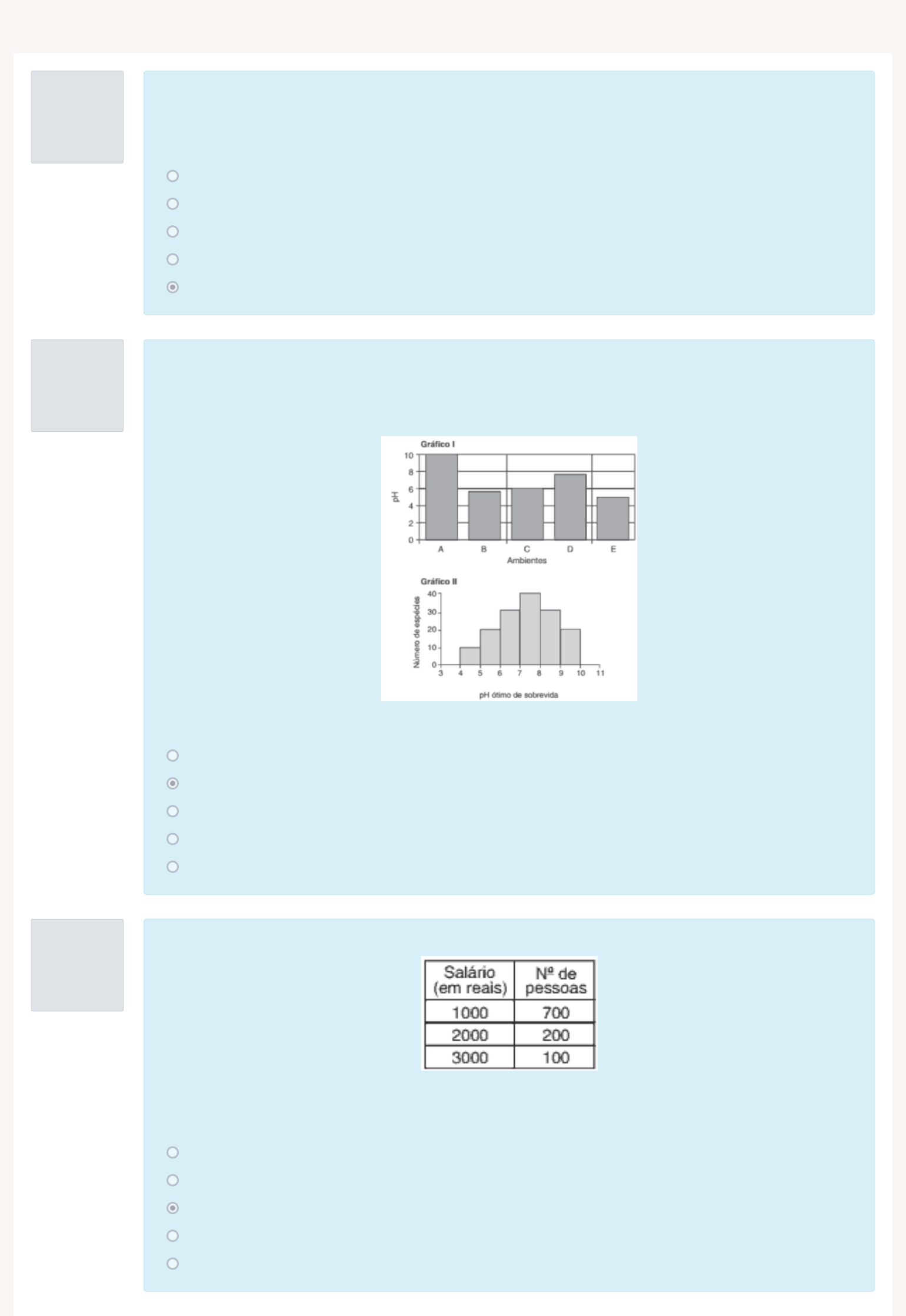 Questão 1 Correto Atingiu 1,00 de 1,00 Questão 2 Correto Atingiu 1,00 de 1,00 Questão 3 Correto Atingiu 2,00 de 2,00 A média aritmética das notas dos alunos de uma turma formada por 25 meninas e 5 meninos é igual a 7. Se a média aritmética das notas dos meninos é igual a 6, a média aritmética das notas das meninas é igual a: Escolha uma opção: a. 6,5. b. 7,4. c. 8,0. d. 7,8. e. 7,2. Um estudo caracterizou 5 ambientes aquáticos, nomeados de A a E, em uma região, medindo parâmetros físico- químicos de cada um deles, incluindo o pH nos ambientes. O Gráfico I representa os valores de pH dos 5 ambientes. Utilizando o Gráfico II, que representa a distribuição estatística de espécies em diferentes faixas de pH, pode-se esperar um maior número de espécies no ambiente: Escolha uma opção: a. C b. D c. A d. E e. B A tabela a seguir representa a distribuição de salários dos trabalhadores de uma cidade. Se todos passassem a ter o mesmo salário (mantendo o total de salários dado pela tabela), cada pessoa receberia: Escolha uma opção: a. R$ 2000,00. b. R$ 1189,10. c. R$ 1400,00. d. R$ 1200,00. e. R$ 3000,00. Questão 4 Correto Atingiu 2,00 de 2,00 Questão 5 Correto Atingiu 2,00 de 2,00 No quadro seguinte, são informados os turnos em que foram eleitos os prefeitos das capitais de todos os estados brasileiros, em 2004. Almanaque ABRIL: Brasil 2005. São Paulo: Abril, 2005. Na região Norte, a frequência relativa de eleição dos prefeitos no 2º turno foi, aproximadamente: Escolha uma opção: a. 50,00% b. 44,44% c. 57,69% d. 42,86% e. 57,14% Para votar, cinco eleitores demoraram, respectivamente, 3 minutos e 38 segundos, 3 minutos e 18 segundos, 2 minutos e 46 segundos, 2 minutos e 57 segundos e 3 minutos e 26 segundos. Qual foi a média do tempo de votação em minutos e segundos desses eleitores? Escolha uma opção: a. 3 minutos e 00 segundos; b. 3 minutos e 13 segundos c. 2 minutos e 30 segundos. d. 2 minutos e 59 segundos; e. 2 minutos e 13 segundos;