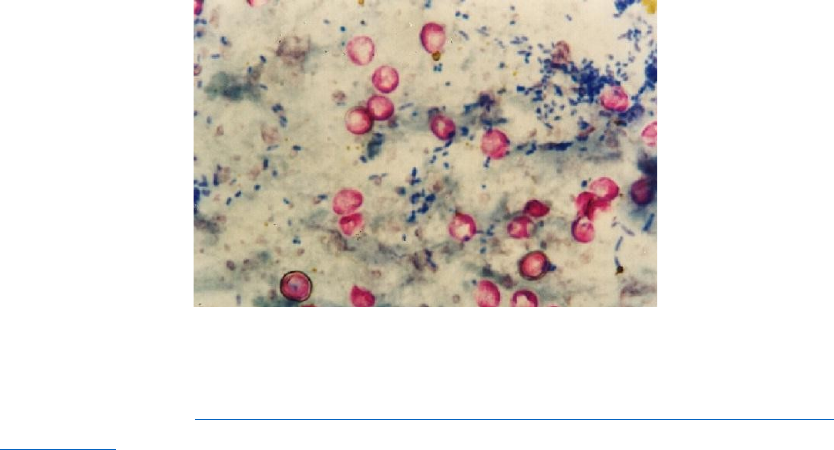 Coloração de Kynioum PRINCÍPIO: Identificação de coccídeos através de diagnóstico laboratorial a técnica de coloração de Kynioum é utilizada em exames de pacientes imunocomprometidos por apresentarem risco para infecções oportunistas. PROCEDIMENTO: As etapas para realização consistem em 1. Concentração onde homogeniza as fezes em solução formalina, feita filtração em gaze. 2. Transfere suspensão para tubo de ensaio juntamente ao éter que será usado para preservação de amostra. 3. Centrifugar e decantar para preparação de esfregaço em lâmina que deve secar em temperatura ambiente. · A triagem se faz opcional e necessita de fluorescência. A fixação do esfregaço depois de seco com metanol, deve cobrir a lâmina e deixar evaporar. · A fucsinacarbólica dimetilsulfóxido em 30 minutos à frio irá penetrar o coccídeo ao corar. 4. Posteriormente lavar em água corrente, descorar a lâmina com (álcool-ácido) e lavar. 5. Para diferenciar usar solução verde malaquita ou azul de metileno, lavar e secar e observar no microscópio. Legenda: Cryptosporidium parvum corado com coloração de Kinyoun. Revisão bibliográfica: https://maestrovirtuale.com/coloracao-de-kinyoun-fundacao-e-tecnicas/