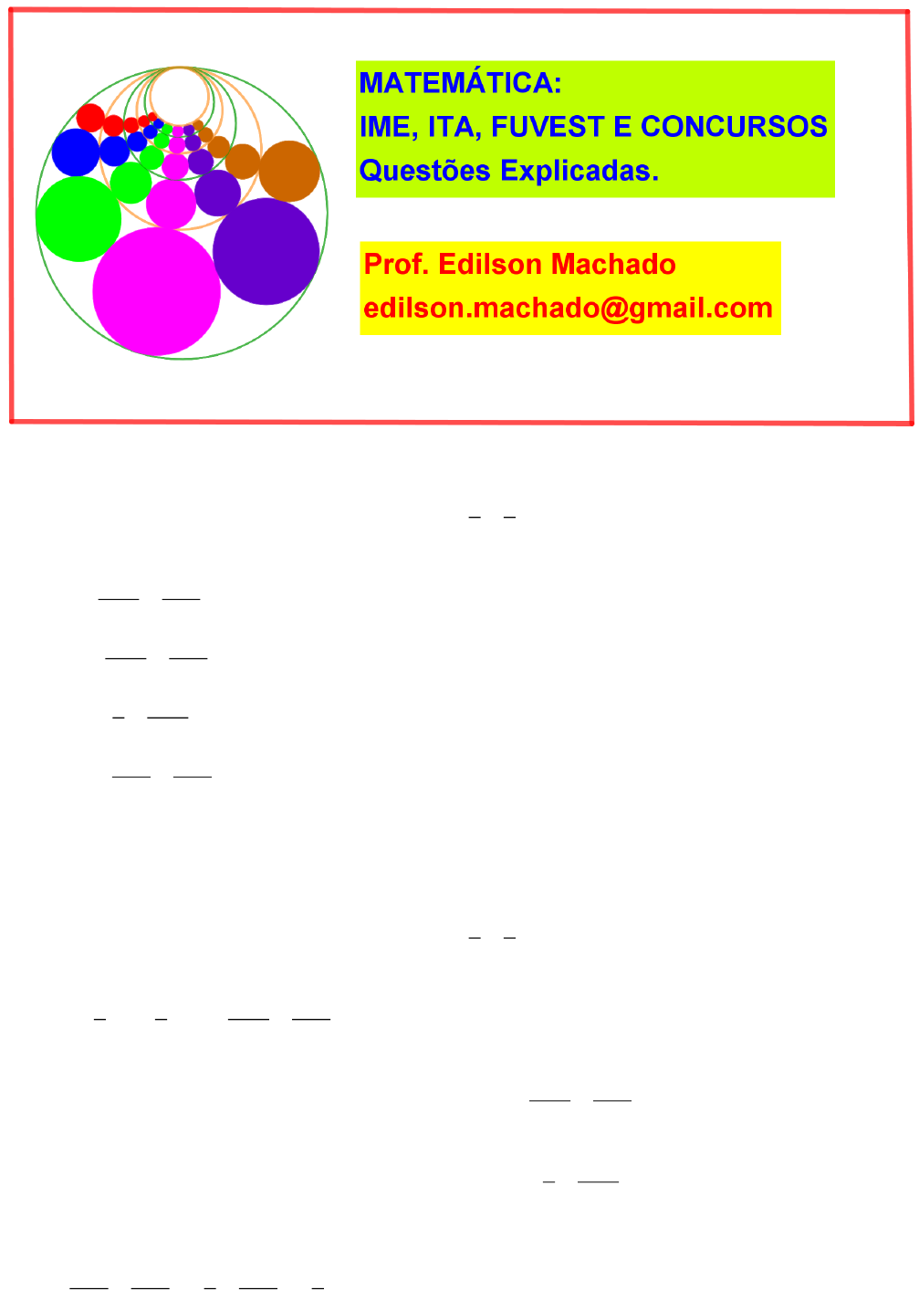1 QUESTÕES EXPLICADAS: 1) Sejam , , ,r s t v números inteiros positivos tais que: r t s v Considere as seguintes relações: ( ) ( ) ( ) ( ) r s t v I s v r t II r s t v r r t III s s v r t r t IV s v + + + + + + + + Quais destas relações podemos garantir que serão sempre corretas para quaisquer valores inteiros: SOLUÇÃO! Como , , ,r s t v números inteiros positivos tais que: r t s v Temos as seguintes relações decorrentes: ( ) 1 1 r t r s t v i s v s v + + + + Portanto a relação (I) é verdadeira. ( ) ( )( ) rt r t ii rv st rv rt st rt r v t t s r s r v t + + + + + + + Portanto a relação (II) é verdadeira. ( ) ( )( ) rs r t r iii rv st rv rs st rs r v s s t r s v s + + + + + + + Portanto a relação (III) é verdadeira. Vamos analisar a relação (IV): 1 r t r t v r t v v s s v s r t s + + + + 2 Mas não temos esta informação no enunciado, portanto, não podemos afirmar sua veracidade. ALTERNATIVA C. 2) Calcule o determinante da matriz abaixo: 5 1 1 1 1 1 1 3 0 0 0 0 1 3 0 0 0 0 1 3 0 0 0 0 1 3 − = − − − SOLUÇÃO! Como a primeira coluna apresenta apenas seus dois primeiros elementos diferentes de zero vamos aplicar o Teorema de Laplace a esta coluna. ( ) ( ) ( ) ( ) 1 1 2 1 5 1 1 1 1 1 3 0 0 0 1 1 1 1 1 3 0 0 0 1 3 0 0 1 3 0 0 1 1 1 10 1 3 0 0 0 1 3 0 0 1 3 0 0 0 1 3 0 0 0 1 3 0 0 1 3 0 0 0 1 3 + + − − − = = + − −− − − − − − − 4 5 1 1 1 1 1 1 1 1 1 1 3 0 0 0 1 3 0 0 30 1 3 0 0 0 1 3 0 0 0 1 3 0 0 0 1 3 0 0 0 1 3 − − = = +− − − − − Como a primeira coluna desta matriz 4 4 apresenta apenas seus dois primeiros elementos diferentes de zero vamos aplicar o Teorema de Laplace a esta coluna. ( ) ( ) 2 11 1 3 4 2 2 3 3 2 4 1 1 1 1 3 0 0 1 1 1 1 1 1 1 3 0 0 1 1 1 3 0 1 1 1 3 0 3 1 3 0 0 1 3 0 0 1 3 0 1 3 0 1 3 0 0 1 3 1 1 1 1 3 0 3 1 3 3 3 1 0 1 3 3 3 3 1 ++ − = = − + − − − = + − − − − − − = − = + + = + + − = + + + Portanto 4 3 2 1 0 5 3 3 3 3 3 81 27 9 3 1 121 = + + + + = + + + + = 3 3) Considere o círculo de centro O inscrito no triângulo ABC. Determine a medida do segmento AO. SOLUÇÃO: Usando a notação da figura acima o perímetro 2 p e a área S do triângulo ABC são dados por: ( )( )( ) ( )( )( ) ( )( ) ( ) 2 3 5 2 2 28 26 18 72 36 36 26 36 18 36 28 36 10 18 8 6 2 5 3 2 2 6 2 3 5 6 4 3 2 5 72 10 p S p p AB p AC p BC S S S = + + = = − − − = − − − = = = = = Mas considerando r o raio do círculo inscrito e o triângulo ABC subdividido em três triângulos ABO , BCO e ACO temos: ABO BCO ACOS S S S = + + Mas: 26 13 2 2 ABO AB r r S r = = = 28 14 2 2 BCO BC r r S r = = = 18 9 2 2 ACO AC r r S r = = = Portanto: 72 10 13 14 9 72 10 36 72 10 36 2 10 r r r r r r + + = = = = Mas: 18 26 28 2 2 16 8 AB x y BC y z AC AB BC x z x y y z x x x AC x z = + = + + − = + + + − − + − = = = = + 4 Observando o triângulo retângulo AOE e aplicando o Teorema de Pitágoras: ( ) 2 2 2 2 2 2 2 8 2 10 64 40 104 104 AO x r AO AO AO = + = + = + = = 4) Considere o sistema: 3 2 2 3 2 2 5 2 2 6 xy x y x y x y x y xy + − = − − + = Onde x e y são números inteiros. Determine o valor numérico da expressão 2 2x y+ . SOLUÇÃO! Trabalhando a segunda equação: ( ) ( ) ( )( ) 3 2 2 3 2 2 2 22 2 6 2 6 2 6 x y x y x y xy x y x y xy x y xy x y xy − − + = − − − = − − = Da primeira equação do sistema: 5x y xy− = − Substituindo esta expressão na equação anterior: ( )( ) ( )( ) 2 6 5 2 6 xy x y xy xy xy xy − − = − − = Considerando, por hipótese x e y números inteiros, temos que: ( ) ( ) 3 5 5 3 2 2 3 2 1 5 2 3 2 1 6 xy xy xy xy xy xy = − = − = − = − = − − = = Como 3xy = os possíveis valores inteiros para x e y são: 3 1 3 1 1 3 1 3 x y x y x y x y = = = − = − = = = − = − Então, 2 2 9 1 10x y+ = + = 5 5) Cada um dos quatro quadradinhos numerados do cartão abaixo é pintado nas cores vermelho, amarelo, preto ou rosa. Por exemplo: Qual a probabilidade de que dois quadradinhos com um lado em comum não sejam pintados da mesma cor? SOLUÇÃO! Sejam 1P , 2P , 3P e 4P o número de cores que podemos pintar os quadradinhos 1, 2, 3 e 4, respectivamente. 1º caso: 1 e 4 foram pintados da mesma cor. Isto pode ocorrer de 4 maneiras. Para os quadradinhos 2 e 4 temos 2 3 3P P= = (cores diferentes dos outros) Pelo Princípio Multiplicativo da Combinatória temos 4 3 3 36 = possibilidades. 2º caso: 2 e 3 foram pintados da mesma cor. Este caso é semelhante ao primeiro, então, temos também 4 3 3 36 = possibilidades. 3º caso: 1 e 4 foram pintados de cores diferentes. Neste caso temos: 1 4 2 3 4 3 2 P P P P = = = = Pelo Princípio Multiplicativo da Combinatória temos 4 3 2 2 48 = possibilidades. 4º caso: 2 e 3 foram pintados de cores diferentes. Este caso é semelhante ao anterior, então, temos também 4 3 2 2 48 = possibilidades. O número de formas possíveis para pintar os quadradinhos atendendo a exigência de dois quadradinhos com um lado em comum não sejam pintados da mesma cor é: 36 36 48 48 168N = + + + = . O número de total T de formas possíveis para pintar os quadradinhos sem se preocupar em atender à exigência de dois quadradinhos com um lado em comum não sejam pintados da mesma cor é: 1 2 3 4 4P P P P= = = = 4 4 4 4 256T = = A probabilidade de cumprir a exigência será: 168 21 256 32 N P T = = =
