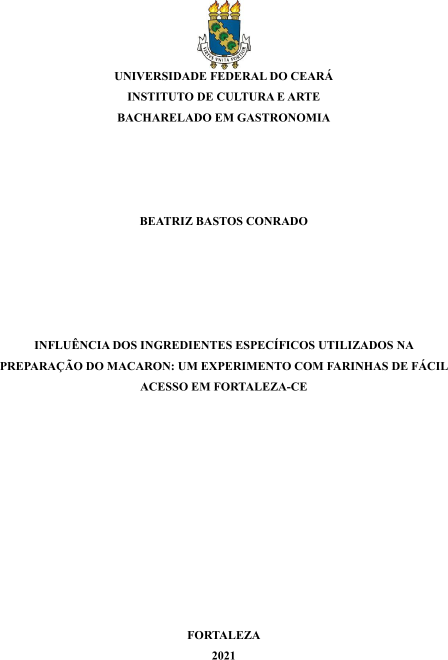 UNIVERSIDADE FEDERAL DO CEARÁ INSTITUTO DE CULTURA E ARTE BACHARELADO EM GASTRONOMIA BEATRIZ BASTOS CONRADO INFLUÊNCIA DOS INGREDIENTES ESPECÍFICOS UTILIZADOS NA PREPARAÇÃO DO MACARON: UM EXPERIMENTO COM FARINHAS DE FÁCIL ACESSO EM FORTALEZA-CE FORTALEZA 2021 BEATRIZ BASTOS CONRADO INFLUÊNCIA DOS INGREDIENTES ESPECÍFICOS UTILIZADOS NA PREPARAÇÃO DO MACARON: UM EXPERIMENTO COM FARINHAS DE FÁCIL ACESSO EM FORTALEZA-CE Trabalho de Conclusão de Curso apresentado à Coordenação do curso de Gastronomia da Universidade Federal do Ceará, como requisito parcial à obtenção do título de Bacharel em Gastronomia. Área de concentração: Tecnologia dos Alimentos. Orientador: Prof. Dra. Alessandra Pinheiro de Góes Carneiro. FORTALEZA 2021 Dados Internacionais de Catalogação na Publicação Universidade Federal do Ceará Biblioteca Universitária Gerada automaticamente pelo módulo Catalog, mediante os dados fornecidos pelo(a) autor(a) C764i Conrado, Beatriz Bastos. Influência dos ingredientes específicos utilizados na preparação do macaron : um experimento com farinhas de fácil acesso em Fortaleza-CE / Beatriz Bastos Conrado. – 2021. 21 f. : il. color. Trabalho de Conclusão de Curso (graduação) – Universidade Federal do Ceará, Instituto de cultura e Arte, Curso de Gastronomia, Fortaleza, 2021. Orientação: Profa. Dra. Alessandra Pinheiro de Góes Carneiro. 1. Culinária francesa. 2. Prunus dulcis. 3. Gastronomia. I. Título. CDD 641.013 BEATRIZ BASTOS CONRADO INFLUÊNCIA DOS INGREDIENTES ESPECÍFICOS UTILIZADOS NA PREPARAÇÃO DO MACARON: UM ESTUDO DE CASO COM FARINHAS DE FÁCIL ACESSO EM FORTALEZA-CE Trabalho de Conclusão de Curso apresentado à Coordenação do curso de Gastronomia da Universidade Federal do Ceará, como requisito parcial à obtenção do título de Bacharel em Gastronomia. Área de concentração: Tecnologia dos Alimentos. Aprovada em: 23/08/2021. BANCA EXAMINADORA ________________________________________ Prof. Dra. Alessandra Pinheiro de Góes Carneiro (Orientador) Universidade Federal do Ceará (UFC) _________________________________________ Prof. Ma. Matusaila Aragão Macêdo Universidade Federal do Ceará (UFC) _________________________________________ Prof. Dra. Uiara Maria Oliveira Martins Centro Universitário Maurício de Nassau (Uninassau) A Deus. Aos meus pais, Jair e Josina. AGRADECIMENTOS A Prof. Dra. Alessandra Pinheiro de Góes Carneiro, pela excelente orientação. Aos professores participantes da banca examinadora Matusaila Aragão Macêdo e Uiara Maria Oliveira Martins. Letícia, minha irmã, pelo tempo, pelas valiosas colaborações e sugestões. Felipe, meu namorado, por me apoiar em todos os meus objetivos. Alison, amigo querido e colega da turma de graduação, pelas reflexões, críticas e sugestões. Esther, amiga querida há tanto tempo, por sua sinceridade, apoio e companheirismo. Riot Games, por criar o League of Legends que me ajudou a passar por tantos momentos difíceis da graduação, na pandemia. A Deus seja a glória, amém. RESUMO Macaron é um doce que chegou à França por meio da corte de Catarina de Médici ao casar-se com Henry II em 1533. Existem variações da receita, sendo a mais conhecida a de macarons parisienses. Esses são tradicionalmente feitos à base de farinha de amêndoas, açúcar impalpável e merengue. Possuem como características básicas: crosta fina com brilho leve e um pouco crocante; pés proporcionais em toda a circunferência da casca; interior macio, moderadamente molhado e ligeiramente denso. Seus ingredientes podem ser substituídos de forma a atender públicos específicos, como diabéticos e vegetarianos, assim como para reduzir custos na produção através da substituição da farinha de amêndoas. O objetivo geral da pesquisa é estudar a influência dos ingredientes específicos utilizados na preparação do macaron buscando otimizar a produção. Foram elaboradas seis formulações com a variação do tipo de farinha utilizada: farinha de amêndoas (Ref), farinha de coco (F1), farinha de castanha do Pará (F2), farinha de castanha de caju (F3), farinha de amendoim (F4) e corante em gel (c). Seis das formulações elaboradas apresentaram textura da macaronagem dentro do esperado, não havendo necessidade de alterar a quantidade dos ingredientes. Somente uma variação (F1) teve comportamento discrepante, sendo a única que não se enquadrou nas três características físicas básicas. As amostras F3, Fc3, F4 e Fc4 foram as que mais se aproximaram da referência literária. Em termos de variação de cor e percepção de textura a F3 e Fc3 não sofreram tanta alteração apresentando a crosta mais lisa, e o sabor de castanha de caju é agradável e não tem gosto residual rançoso. Pode-se observar quanto à presença do corante (c) que não houve influência negativa na crosta, apenas quanto à coloração das amostras. As formulações de castanha do Pará e coco, apesar de não terem tido o resultado esperado com a formulação utilizada, se realizados ajustes na receita, aumentando a quantidade de açúcar no primeiro e a de claras no segundo, poderiam se tornar opções viáveis. A produção de macaron com farinhas de diferentes oleaginosas é possível e tem resultados satisfatórios. Podem ser alternativas para baratear uma produção e até mesmo se adequar aos sabores mais aceitos de acordo com a cultura e hábitos alimentares nordestinos através da castanha de caju, coco e do amendoim, ou para populações com restrições ou alergias alimentares. Palavras-chave: culinária francesa; Prunus dulcis; gastronomia. ABSTRACT Macaron is a confectionery product that arrived in France through the court of Catherine de Medici when she married Henry II in 1533. There are variations of the recipe, the best known being the Parisian macarons. These are traditionally made from almond flour, impalpable sugar and meringue. They have as basic characteristics: thin crust with a li