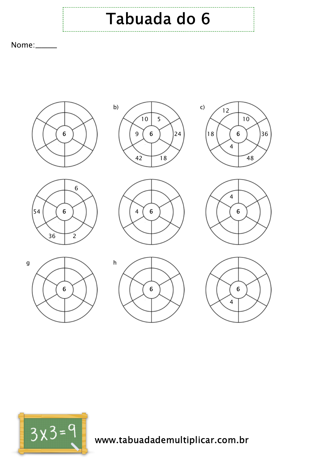 Tabuada do 6 Nome:_________________ Complete o círculo multiplicando o número no centro pelo anel central para obter os números exteriores. Para mais fichas de trabalho, jogos e exercícios: www.tabuadademultiplicar.com.br 18 30 48 10 7 4 6 a) 24 42 18 10 5 9 6 b) 12 18 36 48 10 4 6 c) 6 54 36 24 7 36 d) 6 30 604 3 2 6 e) 48 42 18 12 4 5 6 f) 18 60 54 30 1 4 6 g) 36 12 54 3 8 10 6 h) 30 54 36 12 7 4 6 i)