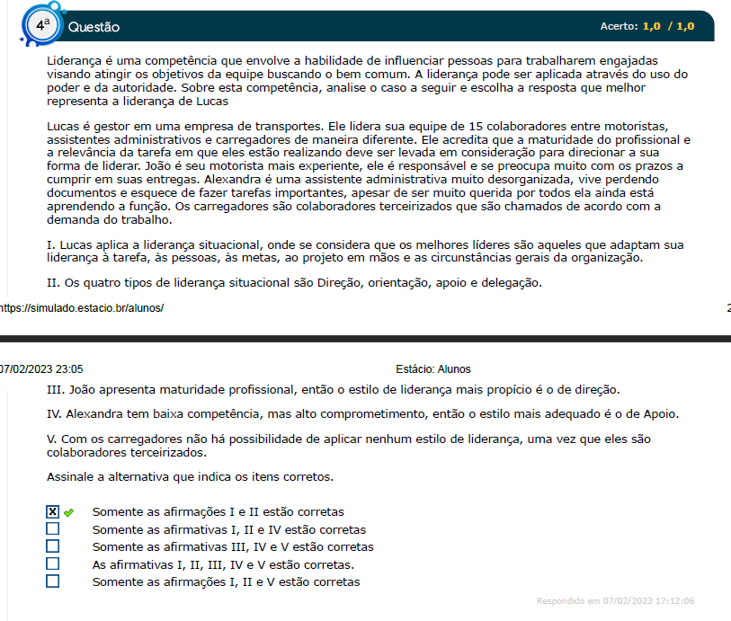 Liderança é uma competência que envolve a habilidade de pessoas para trabalharem engajadas visando atingir os objetivos da equipe buscando bem comum. A liderança pode ser aplicada através do uso do poder e da autoridade. Sobre esta competência, analise o caso a seguir e escolha a resposta que melhor representa a liderança de Lucas. Lucas é em uma empresa de transportes. Ele lidera sua equipe de 15 colaboradores entre motoristas, assistentes administrativos e carregadores de maneira diferente. Ele acredita que a maturidade do profissional e a relevância da tarefa em que eles estão realizando deve ser levada em consideração para direcionar a sua forma de liderar. João é seu motorista mais experiente, ele é responsável e se preocupa muito com os prazos a cumprir em suas entregas. Alexandra é uma assistente administrativa muito desorganizada, vive perdendo documentos e esquece de fazer tarefas importantes, apesar de ser muito querida por todos ela ainda está aprendendo a função. Os carregadores são colaboradores terceirizados que são chamados de acordo com a demanda do trabalho. I. Lucas aplica a liderança situacional, onde se considera que os melhores líderes são aqueles que adaptam sua liderança à tarefa, às pessoas, às metas, ao projeto em mãos e as circunstâncias gerais da organização. II. Os quatro tipos de liderança situacional são Direção, orientação, apoio e delegação. III. João apresenta maturidade profissional, então estilo de liderança mais propício é de direção. IV. Alexandra tem baixa competência, mas alto comprometimento, então estilo mais adequado é de Apoio. V. Com os carregadores não há possibilidade de aplicar nenhum estilo de liderança, uma vez que eles são colaboradores terceirizados. Assinale a alternativa que indica os itens corretos. I. Lucas aplica a liderança situacional, onde se considera que os melhores líderes são aqueles que adaptam sua liderança à tarefa, às pessoas, às metas, ao projeto em mãos e as circunstâncias gerais da organização. II. Os quatro tipos de liderança situacional são Direção, orientação, apoio e delegação. III. João apresenta maturidade profissional, então estilo de liderança mais propício é de direção. IV. Alexandra tem baixa competência, mas alto comprometimento, então estilo mais adequado é de Apoio. V. Com os carregadores não há possibilidade de aplicar nenhum estilo de liderança, uma vez que eles são colaboradores terceirizados. Somente as afirmacoes I e II estão corretas Somente as afirmativas I, II e IV estão corretas Somente as afirmativas III, IV e estão corretas As afirmativas I, II, III, IV e V estão corretas. Somente as afirmações I, II e V estão corretas