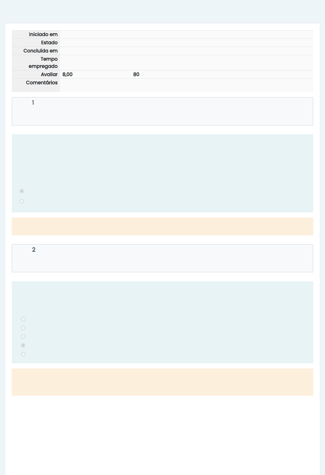 Iniciado em sábado, 22 out 2022, 15:34 Estado Finalizada Concluída em sábado, 22 out 2022, 15:50 Tempo empregado 16 minutos 28 segundos Avaliar 8,00 de um máximo de 10,00(80%) Comentários Parabéns! Você está no caminho certo! Questão 1 Correto Atingiu 1,00 de 1,00 Questão 2 Correto Atingiu 1,00 de 1,00 Acerca das funções e dos objetivos básicos da gestão de pessoas, julgue o item que se segue. Os dois principais focos de intervenção das políticas e das práticas de gestão de pessoas são os trabalhadores e seus contextos de trabalho. Escolha uma opção: Verdadeiro Falso A resposta correta é 'Verdadeiro'. A administração de recursos humanos é a área da empresa que cuida do suprimento, da manutenção e do desenvolvimento de pessoas. Assim, é correto afirmar que as funções da administração de recursos humanos: Escolha uma opção: a. desenvolver talentos, administrar salários e demitir b. recrutar, entrevistar e selecionar pessoas c. manter, desenvolver e promover talentos d. atrair, manter e desenvolver pessoas e. atrair recursos, desenvolver tecnologias e promover a satisfação Sua resposta está correta. A resposta correta é: atrair, manter e desenvolver pessoas Questão 3 Correto Atingiu 1,00 de 1,00 Questão 4 Incorreto Atingiu 0,00 de 1,00 Acerca das funções e dos objetivos básicos da gestão de pessoas, julgue o item que se segue. Foco em resultados, alinhamento estratégico, estruturas organizacionais matriciais e gestão participativa são elementos que caracterizam a moderna gestão de pessoas, diferenciando-a do modelo de administração de recursos humanos. Escolha uma opção: Verdadeiro Falso A resposta correta é 'Verdadeiro'. Um empresa farmacêutica quer adotar o Balanced Scorecard como ferramenta de gestão. O diretor de recursos humanos precisa propor indicadores relativos à categoria de objetivos “motivação, empowermente alinhamento”, dentro da perspectiva “aprendizado e crescimento” do Balanced Scorecard. Seria um indicador adequado: Escolha uma opção: a. produtividade por funcionário; b. índice de retenção dos funcionários; c. número de sugestões por funcionário; d. índice de cobertura de informações estratégicas; e. grau de satisfação dos funcionários; Sua resposta está incorreta. A resposta correta é: número de sugestões por funcionário; Questão 5 Correto Atingiu 1,00 de 1,00 Questão 6 Correto Atingiu 1,00 de 1,00 Analise as afirmativas abaixo que tratam de desafios da área de administração de recursos humanos. 1. A diversidade da força de trabalho vem trazendo desafios aos gestores de recursos humanos de organizações em diferentes países. 2. Os gestores estão cada vez mais investindo em suas carreiras de forma independente, sem esperar que as organizações onde trabalham façam isso por eles. 3. O assédio sexual é um grave problema organizacional e a despeito disso constitui-se em prática existente nas organizações brasileiras. Em virtude disso, o assédio sexual tornou-se um importante desafio para os gestores de recursos humanos. 4. Conseguir um emprego em uma organização, mais do que nunca, é uma garantia de longo prazo para qualquer trabalhador. Assinale a alternativa que indica todas as afirmativas corretas. Escolha uma opção: a. São corretas apenas as afirmativas 1 e 2. b. São corretas apenas as afirmativas 1, 2 e 4. c. São corretas apenas as afirmativas 1, 2 e 3. d. São corretas apenas as afirmativas 3 e 4. e. São corretas as afirmativas 1, 2, 3 e 4. Sua resposta está correta. A resposta correta é: São corretas apenas as afirmativas 1, 2 e 3. Toda Organização para se organizar e perseguir seus objetivos em sua estrutura existem os chamados níveis das empresas. Assinale a alternativa que corresponde aos três níveis básicos de uma empresa: Escolha uma opção: a. Nível Institucional, Nível Fragmentado, Nível Intermediário. b. Nível Institucional, Nível Operacional, Nível Azul. c. Nível Institucional, Nível intermediário, Nível Fragmentado. d. Nível Institucional, Nível Intermediário, Nível Operacional. Sua resposta está correta. A resposta correta é: Nível Institucional, Nível Intermediário, Nível Operacional. Questão 7 Incorreto Atingiu 0,00 de 1,00 Questão 8 Correto Atingiu 1,00 de 1,00 Em relação à Administração Estratégica de Recursos Humanos (AERH), é COR-RETO afirmar: Escolha uma opção: a. A AERH tem como principais atividades o treinamento, o recrutamento in-terno, o desenvolvimento, a busca de práticas ideais, a terceirização e a des-centralização. b. A adaptação das pessoas às necessidades estratégicas é um papel que não cabe à AERH. c. Maior competitividade, necessidade de diferenciação, pessoas vistas como recursos para vantagem competitiva foram as condições que propiciaram o surgimento da AERH. d. Motivar empregados, manter segurança e bom ambiente, garantindo envolvi-mento, não são considerados aspectos relativos às funções e contribuições da AERH. Sua resposta está incorreta. A resposta correta é: A AERH tem como principais atividades o treinamento, o recrutamento in-terno, o desenvolvimento, a busca de práticas ideais, a terceirização e a des-centralização. No que se refere à administração de recursos humanos, é correto afirmar: Escolha uma opção: a. A legislação e a tecnologia têm pouca influência sobre a administração de recursos humanos. b. Os sistemas de incentivo a produtividade dos funcionários devem ser individuais e vinculados ao desempenho do funcionário. c. Apresenta 3 níveis de atuação: estratégico, tático e operacional. d. A política de remuneração estabelecida pela administração de recursos humanos deve basear-se exclusivamente na lucratividade da organização. e. A primeira etapa de um processo de administração de recursos humanos é o treinamento dos funcionários da organização. Sua resposta está correta. A resposta correta é: Apresent