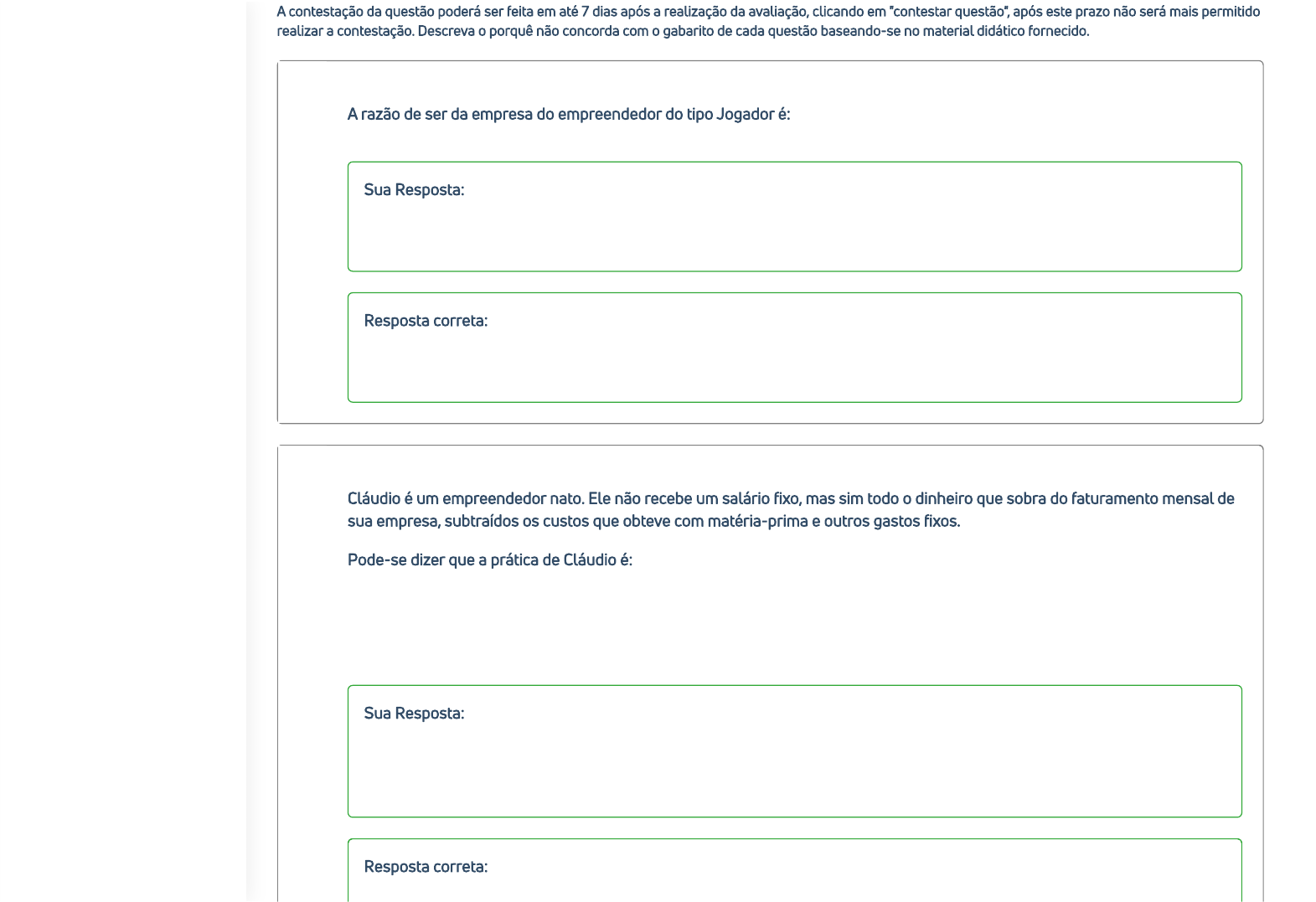 15/02/2023 23:37 Rever Avaliação https://ava.institutoprominas.com.br/notas/rever-avaliacao 2/5 A contestação da questão poderá ser feita em até 7 dias após a realização da avaliação, clicando em "contestar questão", após este prazo não será mais permitido realizar a contestação. Descreva o porquê não concorda com o gabarito de cada questão baseando-se no material didático fornecido. 1 A razão de ser da empresa do empreendedor do tipo Jogador é: Sua Resposta: Lazer Resposta correta: Lazer 2 Cláudio é um empreendedor nato. Ele não recebe um salário fixo, mas sim todo o dinheiro que sobra do faturamento mensal de sua empresa, subtraídos os custos que obteve com matéria-prima e outros gastos fixos. Pode-se dizer que a prática de Cláudio é: Sua Resposta: Não estratégica. Uma vez que as boas práticas de gestão indicam que Cláudio deva definir um salário fixo mensal e incluir esse valor entre os custos da empresa. Resposta correta: 15/02/2023 23:37 Rever Avaliação https://ava.institutoprominas.com.br/notas/rever-avaliacao 3/5 Não estratégica. Uma vez que as boas práticas de gestão indicam que Cláudio deva definir um salário fixo mensal e incluir esse valor entre os custos da empresa. 3 Tendo em vista o conceito de Plano de Negócios, assinale a alternativa correta: Sua Resposta: O plano de negócios é uma ferramenta valiosa para que o empreendedor assuma riscos calculados ao implementar suas ideias de negócios. Resposta correta: Empreendimentos que não realizam um plano de negócios não sobrevivem. 4 “O Programa Shark Tank apresenta sessões de pitch realizadas por empreendedores, com negócios já validados no mercado, que estão em busca de recursos financeiros e apoio estratégico para fazer crescer suas empresas”. Pode-se dizer que as práticas vistas no programa estão relacionadas a que forma de captação de recursos financeiros? Sua Resposta: Venture Capital. Resposta correta: Contestar questão 15/02/2023 23:37 Rever Avaliação https://ava.institutoprominas.com.br/notas/rever-avaliacao 4/5 Venture Capital. 5 Sobre o conceito de Bootstrapping é possível afirmar que se trata de: Sua Resposta: arrecadação de todos os fundos pessoais para aplicar no negócio Resposta correta: arrecadação de todos os fundos pessoais para aplicar no negócio 6 Os componentes da matriz SWOT podem ser representados por: Sua Resposta: Força, Fraqueza, Ameaças e Oportunidade. Resposta correta: Força, Fraqueza, Ameaças e Oportunidade. 15/02/2023 23:37 Rever Avaliação https://ava.institutoprominas.com.br/notas/rever-avaliacao 5/5 7 “A matéria-prima da estratégia empresarial é a Informação. Investe-se cada vez mais em funções de Business Intelligence (BI) nas organizações modernas”. O que é Business Intelligence (BI)? Sua Resposta: Aplicação de técnicas científicas para a coleta, organização, análise e compartilhamento de informações pertinentes para a tomada de decisões. Resposta correta: Aplicação de técnicas científicas para a coleta, organização, análise e compartilhamento de informações pertinentes para a tomada de decisões. 8 “Samuel tem uma brilhante ideia. Observando que muitos estudantes de sua universidade compravam e vendiam produtos e serviços entre si, ele decidiu criar um aplicativo para intermediar essa troca. A plataforma digital criada por Sam ainda não é um sucesso, o empreendedor faz tudo sozinho, e uma quantia considerável de recursos deve ser aplicada no negócio, a fim de que sua plataforma digital seja conhecida entre os estudantes”. É possível identificar na história de Samuel alguns elementos-chave do processo empreendedor, destacados no modelo de Timmons. Indique a alternativa correta: Sua Resposta: