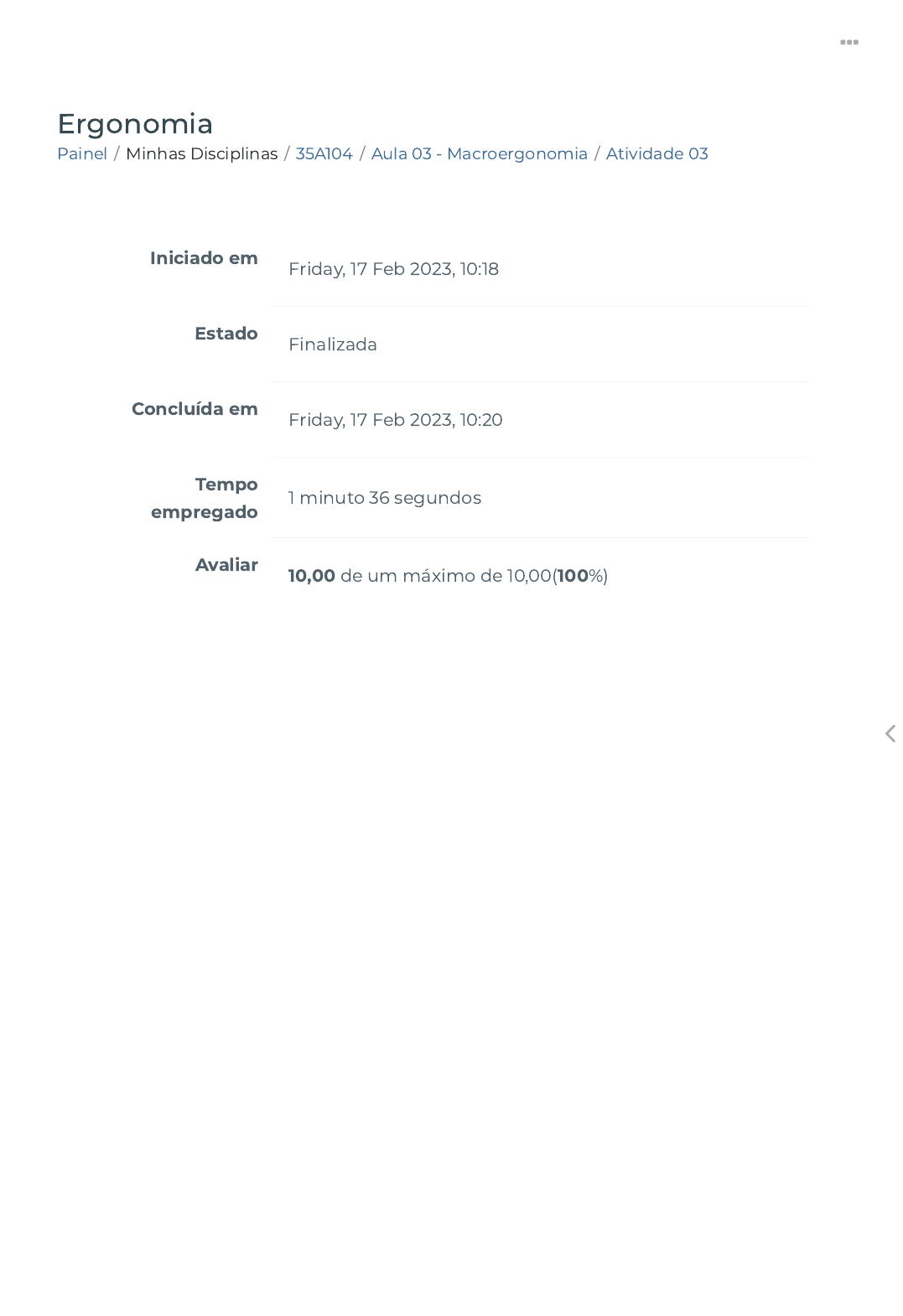 17/02/2023, 09:20 Atividade 03 https://ava.politecnicabr.com.br/mod/quiz/review.php?attempt=4396614 1/5 Painel / Minhas Disciplinas / 35A104 / Aula 03 - Macroergonomia / Atividade 03 Ergonomia Iniciado em Friday, 17 Feb 2023, 10:18 Estado Finalizada Concluída em Friday, 17 Feb 2023, 10:20 Tempo empregado 1 minuto 36 segundos Avaliar 10,00 de um máximo de 10,00(100%) https://ava.politecnicabr.com.br/my/ https://ava.politecnicabr.com.br/course/view.php?id=1026 https://ava.politecnicabr.com.br/course/view.php?id=1026#section-4 https://ava.politecnicabr.com.br/mod/quiz/view.php?id=34037 https://ava.politecnicabr.com.br/ 17/02/2023, 09:20 Atividade 03 https://ava.politecnicabr.com.br/mod/quiz/review.php?attempt=4396614 2/5 Questão 1 Correto Atingiu 2,50 de 2,50 O uso das cores no ambiente de trabalho pode interferir no ânimo do trabalhador e até na sua produtividade. Há cores que transmitem mais paz e tranquilidade, e outras que são mais densas. Marque a alternativa correta em relação a cor e sua indicação. Escolha uma opção: a. Vermelho - Perigo de colisão, atenção, alerta, risco de tropeço; em geral, as listras amarelas sobre um fundo preto indicam alerta nos transportes. b. Verde - Nos serviços de resgate, indica saída de segurança e que as “coisas estão em ordem”; se refere a todas as formas de equipamento de resgate e primeiros socorros. c. Azul - Nos serviços de resgate, indica saída de segurança e que as “coisas estão em ordem”; se refere a todas as formas de equipamento de resgate e primeiros socorros. d. Amarelo - Perigo, parar e proibido; alertas para fogo (é empregada em extintores e equipamentos de combate a incêndio). https://ava.politecnicabr.com.br/ 17/02/2023, 09:20 Atividade 03 https://ava.politecnicabr.com.br/mod/quiz/review.php?attempt=4396614 3/5 Questão 2 Correto Atingiu 2,50 de 2,50 Nos locais de trabalho onde são executadas atividades que exijam solicitação intelectual e atenção constantes, como salas de controle, laboratórios, escritórios, salas de desenvolvimento ou análise de projetos, dentre outros, são recomendadas as seguintes condições de conforto, exceto na opção: Escolha uma opção: a. Velocidade do ar não superior a 0,45 m/s. b. Umidade relativa do ar não inferior a 40 (quarenta)por cento. c. Índice de temperatura efetiva entre 20°C (vinte) e 23°C (vinte e três graus centígrados). d. Níveis de ruído de acordo com o estabelecido na NBR 10152, norma brasileira registrada no INMETRO. https://ava.politecnicabr.com.br/ 17/02/2023, 09:20 Atividade 03 https://ava.politecnicabr.com.br/mod/quiz/review.php?attempt=4396614 4/5 Questão 3 Correto Atingiu 2,50 de 2,50 Podemos a�rmar que A ECO (Escala de Clima Organizacional) é uma escala unidirecional construída e validada com o objetivo de avaliar a percepção do trabalhador sobre uma única dimensão do clima organizacional. Escolha uma opção: Questão 4 Correto Atingiu 2,50 de 2,50 Visa estabelecer parâmetros que permitam a adaptação das condições de trabalho às características psico�siológicas dos trabalhadores, de modo a proporcionar um máximo de conforto, segurança e desempenho e�ciente. Escolha uma opção: Verdadeiro Falso a. NR 33 - Ergonomia b. NR 17 - Ergonomia c. NR 15 - Ergonomia d. NR 18 - Ergonomia https://ava.politecnicabr.com.br/ 17/02/2023, 09:20 Atividade 03 https://ava.politecnicabr.com.br/mod/quiz/review.php?attempt=4396614 5/5 © 2022 - Escola Politécnica Brasileira Entre em Contato https://www.politecnicabr.com.br 0800 084 2627 0800 084 2627 Links Úteis Dicas da nossa Diretora Acadêmica Planner de Estudos Declaração de Matrícula Orientações do AVA Abertura de Ticket Fale com o Tutor Cronograma de Estudos Manual de Estágio Manual de Competência Siga-nos nas redes sociais https://ava.politecnicabr.com.br/mod/quiz/0 https://www.politecnicabr.com.br/ https://soundcloud.com/user-501638417/sets/escola-politecnica-brasileira https://storage.googleapis.com/sirius-pubstore/semestre_plannerdeestudo%20poli.pdf https://storage.googleapis.com/sirius-pubstore/declaracao_matricula.pdf https://storage.googleapis.com/sirius-pubstore/orientacoes_ava.pdf https://storage.googleapis.com/sirius-pubstore/abertura_ticket.pdf https://storage.googleapis.com/sirius-pubstore/fale_com_tutor.pdf https://storage.googleapis.com/sirius-pubstore/cronograma_estudos.pdf https://storage.googleapis.com/sirius-pubstore/manual_estagio.pdf https://storage.googleapis.com/sirius-pubstore/manual_competencia.pdf https://www.facebook.com/politecnicabr https://www.instagram.com/politecnicabr_oficial https://ava.politecnicabr.com.br/