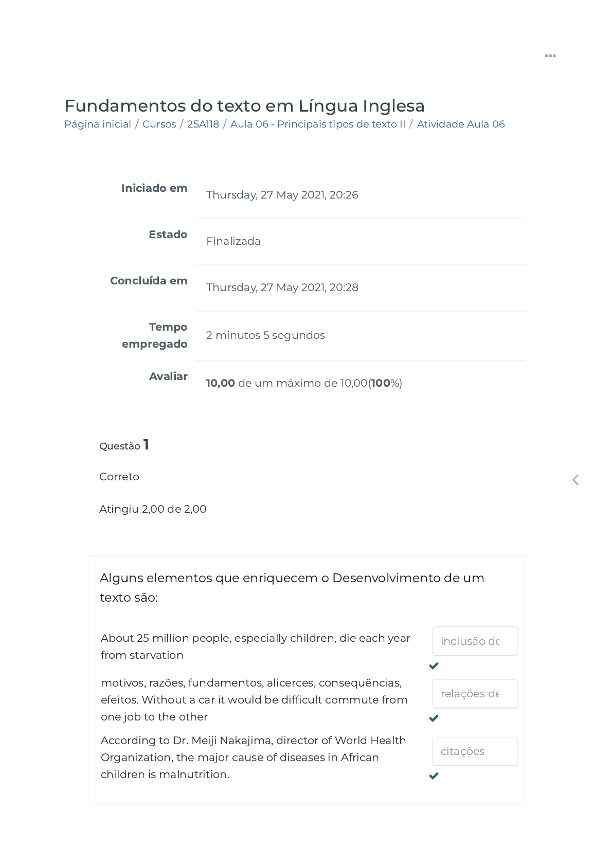 05/05/22, 10:58 Atividade Aula 06 https://ava.politecnicabr.com.br/mod/quiz/review.php?attempt=1543899 1/5 Página inicial / Cursos / 25A118 / Aula 06 - Principais tipos de texto II / Atividade Aula 06 Fundamentos do texto em Língua Inglesa Iniciado em Thursday, 27 May 2021, 20:26 Estado Finalizada Concluída em Thursday, 27 May 2021, 20:28 Tempo empregado 2 minutos 5 segundos Avaliar 10,00 de um máximo de 10,00(100%) Questão 1 Correto Atingiu 2,00 de 2,00 Alguns elementos que enriquecem o Desenvolvimento de um texto são: About 25 million people, especially children, die each year from starvation motivos, razões, fundamentos, alicerces, consequências, efeitos. Without a car it would be dif�cult commute from one job to the other According to Dr. Meiji Nakajima, director of World Health Organization, the major cause of diseases in African children is malnutrition. inclusão de relações de citações https://ava.politecnicabr.com.br/ https://ava.politecnicabr.com.br/course/index.php https://ava.politecnicabr.com.br/course/view.php?id=1127 https://ava.politecnicabr.com.br/course/view.php?id=1127#section-7 https://ava.politecnicabr.com.br/mod/quiz/view.php?id=28761 https://ava.politecnicabr.com.br/ 05/05/22, 10:58 Atividade Aula 06 https://ava.politecnicabr.com.br/mod/quiz/review.php?attempt=1543899 2/5 Questão 2 Correto Atingiu 2,00 de 2,00 Children should not be allowed to watch too much TV. Today with parents out of the household for longer periods it is very dif�cult to restrict children to be in front of a TV screen for hours. This can result in a serious threat to kids’ health, specially preschoolers. According to the American Academy of Pediatrics around 15,000 children suffer from neurological problems caused by TV. Last year it was reported a case of a �ve-year old boy that fainted while watching his favorite cartoon. Com relação ao texto, assinale corretamente referente a Relação de causa e efeito. ( ) today with parents out of the household for longer periods it is very dif�cult to restrict children to be in front of a TV screen for hours. This can result in a serious threat to kids’ health, especially preschoolers. Escolha uma opção: Verdadeiro Falso https://ava.politecnicabr.com.br/ 05/05/22, 10:58 Atividade Aula 06 https://ava.politecnicabr.com.br/mod/quiz/review.php?attempt=1543899 3/5 Questão 3 Correto Atingiu 2,00 de 2,00 Assinale (V) Verdadeiro ou (F) Falso: Moreover, a lot of families would rather like to exchange their cell phone for the latest models than acquiring best quality nutritional food. ( ) Conclusão Escolha uma opção: Questão 4 Correto Atingiu 2,00 de 2,00 Sobre algumas expressões típicas da argumentação ou da linguagem opinativa, marque a alternativa incorreta sobre contrastando: Escolha uma opção: Verdadeiro Falso a. However (entretanto) b. It is true that (é verdade que) c. On the other hand( Por outro lado) d. Nevertheless (não obstante) https://ava.politecnicabr.com.br/ 05/05/22, 10:58 Atividade Aula 06 https://ava.politecnicabr.com.br/mod/quiz/review.php?attempt=1543899 4/5 Questão 5 Correto Atingiu 2,00 de 2,00 Marque (V) Verdadeiro ou (F) Falso: The media has been discussing the quality of food that we eat. Usually governmental authorities and food makers are blamed. Actually, if we think, we are also responsible since sometimes we opt for price and convenience over nutritional value. ( ) Tese + explicação Escolha uma opção: Verdadeiro Falso Entre em Contato https://www.politecnicabr.com.br 0800 084 2627 indisponível devido a pandemia de COVID-19, use outro canal! 0800 084 2627 comercial@politecnicabr.com.br Links Úteis Dicas da nossa Diretora Acadêmica Planner de Estudos Declaração de Matrícula Orientações do AVA Abertura de Ticket Fale com o Tutor Cronograma de Estudos Manual de Estágio Manual de Competência Siga-nos nas redes sociais https://www.politecnicabr.com.br/ mailto:comercial@politecnicabr.com.br https://soundcloud.com/user-501638417/sets/escola-politecnica-brasileira https://storage.googleapis.com/sirius-pubstore/semestre_plannerdeestudo%20poli.pdf https://storage.googleapis.com/sirius-pubstore/declaracao_matricula.pdf https://storage.googleapis.com/sirius-pubstore/orientacoes_ava.pdf https://storage.googleapis.com/sirius-pubstore/abertura_ticket.pdf https://storage.googleapis.com/sirius-pubstore/fale_com_tutor.pdf https://storage.googleapis.com/sirius-pubstore/cronograma_estudos.pdf https://storage.googleapis.com/sirius-pubstore/manual_estagio.pdf https://storage.googleapis.com/sirius-pubstore/manual_competencia.pdf https://www.facebook.com/politecnicabr https://www.instagram.com/politecnicabr_oficial https://ava.politecnicabr.com.br/ 05/05/22, 10:58 Atividade Aula 06 https://ava.politecnicabr.com.br/mod/quiz/review.php?attempt=1543899 5/5 © 2022 - Escola Politécnica Brasileira https://ava.politecnicabr.com.br/mod/quiz/0 https://www.facebook.com/politecnicabr https://www.instagram.com/politecnicabr_oficial https://ava.politecnicabr.com.br/