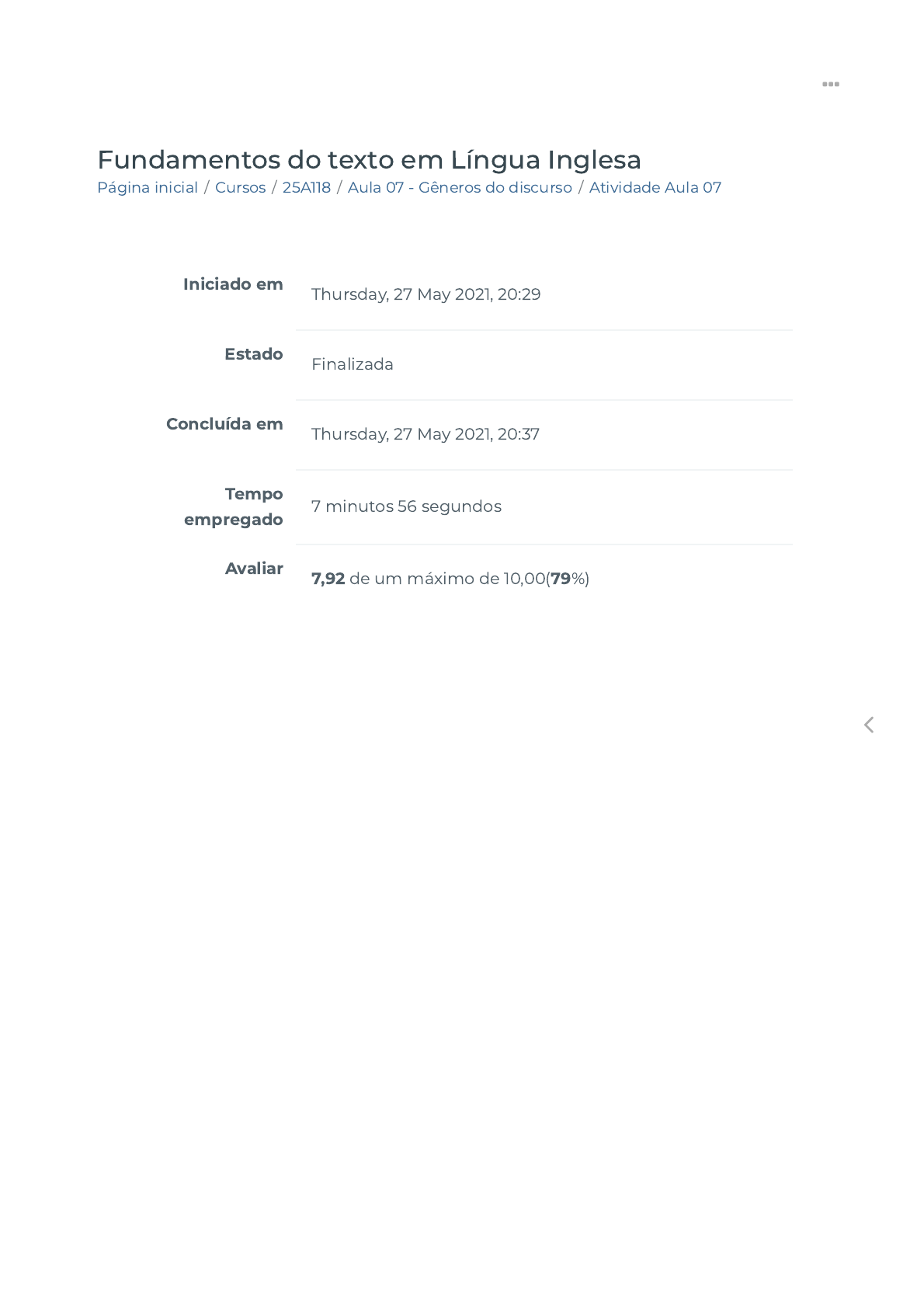 05/05/22, 10:59 Atividade Aula 07 https://ava.politecnicabr.com.br/mod/quiz/review.php?attempt=1543931 1/7 Página inicial / Cursos / 25A118 / Aula 07 - Gêneros do discurso / Atividade Aula 07 Fundamentos do texto em Língua Inglesa Iniciado em Thursday, 27 May 2021, 20:29 Estado Finalizada Concluída em Thursday, 27 May 2021, 20:37 Tempo empregado 7 minutos 56 segundos Avaliar 7,92 de um máximo de 10,00(79%) https://ava.politecnicabr.com.br/ https://ava.politecnicabr.com.br/course/index.php https://ava.politecnicabr.com.br/course/view.php?id=1127 https://ava.politecnicabr.com.br/course/view.php?id=1127#section-8 https://ava.politecnicabr.com.br/mod/quiz/view.php?id=28765 https://ava.politecnicabr.com.br/ 05/05/22, 10:59 Atividade Aula 07 https://ava.politecnicabr.com.br/mod/quiz/review.php?attempt=1543931 2/7 Questão 1 Correto Atingiu 2,00 de 2,00 Com relação ao texto Why genres matter, marque a alternativa incorreta: Escolha uma opção: a. Is there anything I should do before I start? Prerequisites b. Could you give me an example of the way this step is supposed to work? Troubleshooting c. How does this task fit into the larger process I am working on? Process diagram d. Now that I’ve done what you said to do, what’s the result? Result statement https://ava.politecnicabr.com.br/ 05/05/22, 10:59 Atividade Aula 07 https://ava.politecnicabr.com.br/mod/quiz/review.php?attempt=1543931 3/7 Questão 2 Correto Atingiu 2,00 de 2,00 Referente ao texto, assinale a alternativa correta: A genre is born as a response to an audience’s questions, needs, wishes, fantasies Writers don’t start genres, audiences do. A niche audience starts the conversation by asking a certain kind of question over and over in the same general context. For instance, newspaper editors tend to ask, “What’s the news item here? When can I release this? Who can I call for more info? ”In response, publicists came up with the generic press release, a fairly standard approach to answering those questions in a methodical way, with a heading, release date, and contact phone number. Through the ongoing virtual conversation between editors and flacks, a peculiar type of text is developed—a genre. Escolha uma opção: a. What’s the real crime here, and how will it be solved? Annual report b. How do I do x? Definition c. What can you do for my organization? Detective novel d. What is your original idea? Academic essay https://ava.politecnicabr.com.br/ 05/05/22, 10:59 Atividade Aula 07 https://ava.politecnicabr.com.br/mod/quiz/review.php?attempt=1543931 4/7 Questão 3 Parcialmente correto Atingiu 0,42 de 2,50 Combine as colunas de modo a estabelecer a organização estrutural (retórica) da resenha a seguir sobre o livro Zahir de Paulo Coelho: The narrator has had has plenty of success in his life: well attended book signings, power lunches with �lm industry people, and interviews with journalists. But it all leaves him with a sour taste in his mouth. He remembers a story by Jorge Luis Borges about a mystical coin: “A year later, I wake thinking about the story by Borges, about something which, once touched or seen, can never be forgotten, and which gradually so �lls our thoughts that we are driven to madness. My Zahir is not a romantic metaphor — a blind man, a compass, a tiger, or a coin. It has a name, and her name is Esther.” Brazilian-born writer Paulo Coelho is the author of The Alchemist and many other quest novels. He has sold an estimated 65 million books in 150 countries in 60 languages. Then Mikhail, the last person Esther was seen with, contacts the narrator and promises to take him to her. Mikhail, a young man who works with unhappily married couples, has his own spiritual perspective on love. The narrator’s struggle is that of a man as trying to come to terms with something he cannot understand or control: the mystery of Esther’s absence. It is very hard for him to let go of his feeling that she is the only one who �lls his life with meaning. The inner journey he takes opens him up to new possibilities. Coelho has not created a masterwork on the level of The Alchemist, but for those who are willing to travel lightly, there are some interesting insights here on obsessive love, the emptiness of celebrity-status success, and the courage needed to square off against the mysteries and rewards of letting go of ego and stepping into the dark unknown. 2 4 3 1 6 https://ava.politecnicabr.com.br/ 05/05/22, 10:59 Atividade Aula 07 https://ava.politecnicabr.com.br/mod/quiz/review.php?attempt=1543931 5/7 The unnamed narrator of this story is a wildly successful novelist and celebrity who lives in Paris with his wife Esther, a war correspondent who speaks four languages. Their marriage has hit a dry spot and she is restless, wanting to move on in search of her own happiness. When Esther disappears, he is tormented and traumatized by the mystery of what has happened to her. Has she been kidnapped, killed, or has she left him for another lover? Questão 4 Correto Atingiu 1,50 de 1,50 Como essas páginas iniciais de sites (home pages) se con�guram como gêneros: seu propósito comunicativo – as home pages são páginas iniciais de apresentação de sites, servindo como canal de veiculação inicial de informações; sua comunidade discursiva – o público-alvo é variado mas podemos dizer que geralmente quem acessa as páginas dessas empresas são clientes, fornecedores, investidores e funcionários em busca de alguma informação especí�ca; sua organização retórica – você deve ter percebido como essas home pages são semelhantes. O quadro abaixo compara os elementos estruturais presentes em ambas empresas. Escolha uma opção: 5 Verdadeiro Falso https://ava.politecnicabr.com.br/ 05/05/22, 10:59 Atividade Aula 07 https://ava.politecnicabr.com.br/mod/quiz/review.php?attempt=1543931 6/7 Questão 5 Correto Atingiu 2,00 de 2,00 Vamos ver como essas páginas iniciais de sites (home pages) se 