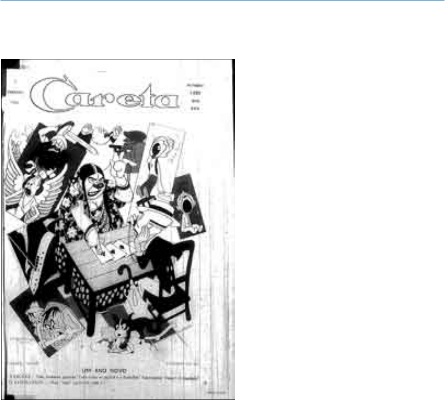 Tan ia Reg ina de Luca (Org . ) 76 TÍTULO: CARETA ENDEREÇO: Redação, gerência e oficina: Rua Frei Caneca, 383. CIDADE: Rio de Janeiro. PERIODICIDADE: Semanal. Nº DE PÁGINAS: 40 a 52. DATAS-LIMITE: Jun. 1908 a 1961. EXEMPLARES: 606. REDAÇÃO/RESPONSÁVEL: Fundador: Jorge Schmidt; Diretor responsável: Robert Schmidt. ILUSTRAÇÃO: Fotos e charges assinadas por J. Carlos e Robert Schmidt. COLABORADORES: Heitor Peres, Herodo, Peregrino Junior, Orvacio Santa Maina, Osvaldo Orico. CARACTERIZAÇÃO: Apresenta, em cada edição, uma capa com charges relacionadas ao assunto da semana, de cunho nacional ou internacional. Apresenta, também, colunas variadas que tratam desde notícias sobre os astros hollywoodianos, cinema, curiosidades do mundo e eventos no Rio de Janeiro, como visitações e campeonatos esportivos. As publicidades eram constantes, sendo algumas de produtos muito conhecidos hoje, como o sabonete Gessy e Palmolive, lâminas Gillette, creme Rugol e publicidades de produtos que hoje não circulam mais, porém, ainda são conhecidos, como o creme dental Kolynos. A revista ainda traz diversas anedotas e curiosidades de literatura e história. DESCRIÇÃO: Apresenta conteúdo variado, curiosidades sobre famosos e o mundo do glamour. Ao longo dos anos, recebeu mudanças em sua linha editorial, caracterizada pela ampliação do número de fotos e, a partir de 1947, traz editoriais discutindo a política brasileira, os atos do governo, das indústrias, bem como as condições financeiras do Brasil.