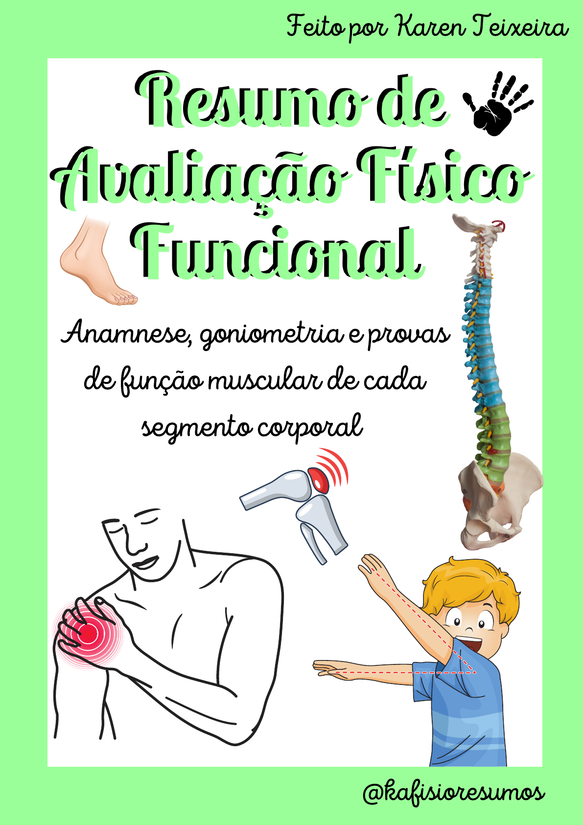 Ellen paese - ellenpaese@hotmail.com - CPF: 820.948.968-20 IntroduçãoIntrodução Meu nome é Karen Teixeira, sou Fisioterapeuta empresária. Estou muito feliz pela sua decisão em usar meus resumos pra facilitar seu aprendizado e auxiliar a concluir a faculdade com leveza e eficiência. Esse arquivo é protegido por direitos autorais, sendo apenas de uso individual. Gratidão pela confiança e bons estudos ❤ Clique aqui pra me contar o que achou desse resumo, e também, estou a disposição pra tirar dúvidas! Escreva os tópicos do sumário no cronograma de estudos pra agendar suas revisões! SUGESTÃO: Ellen paese - ellenpaese@hotmail.com - CPF: 820.948.968-20 https://wa.me/message/OPRO2DHAVWXYK1 Avaliação do ombro.......................................................4 Avaliação do cotovelo..................................................7 Avaliação da mão...........................................................8 Avaliação da coluna vertebral................................11 Siglas....................................................................................17 Avaliação do quadril...................................................17 Avaliação do joelho......................................................20 Avaliação do tornozelo e pé....................................22 Provas de função muscular.....................................25 @Kafisioresumos Avaliação do ombro Avaliação do cotovelo Avaliação da mão Avaliação da coluna vertebral Data: Data: Data: Data:Data: Data: Data: Data:Data: Data: Data: Data: Data: Data:Data: Data:Data:Data: Data: Data: Data: Data: Data: Data: Avaliação do quadril Avaliação do joelho Avaliação do tornozelo e pé Provas de função muscular Ellen paese - ellenpaese@hotmail.com - CPF: 820.948.968-20 O ombro deve ser examinado no plano frontal anterior, posterior e plano sagital (esquerdo e direito) → Determinar alterações posturais gerais (conferir alinhamento de ambos os lados) ➢ Manúbrio ➢ Articulação esternoclavicular ➢ Clavícula ➢ Articulação acromioclavicular ➢ Acrômio ➢ Tubérculo maior do úmero ➢ Tubérculo menor do úmero ➢ Sulco intertubercular (tendão da cabeça longa do bíceps braquial) ➢ Processo coracóide ➢ Espinha da escápula ➢ Ângulo superior da escápula ➢ Ângulo inferior da escápula ➢ Borda medial da escápula ➢ Borda lateral da escápula ➢ Fossa supraespinal ➢ Fossa infraespinal ➢ Músculo trapézio ➢ M. Peitoral maior ➢ M. Deltóide ➢ M. Latíssimo do dorso ➢ Bursa subacromial (borda do sutiã) ➢ Tendão do infraespinal e redondo menor ➢ Tendão do supraespinal @kafisioresumos 1 Elevação/abaixamento Protrusão/retração Rotação superior e inferior Inclinação escapular Avaliação do Ombro Avaliação do Ombro 4 Ellen paese - ellenpaese@hotmail.com - CPF: 820.948.968-20 ➢ O paciente sustenta o membro superior em uma posição protegida? ➢ Houve lesão? Qual foi o seu mecanismo (como ocorreu)? ➢ Movimentos que causam dor? Comportamento da dor? ➢ O que o paciente é capaz de fazer funcionalmente? ➢ Há quanto tempo está com esse problema? ➢ Há indicação de espasmo muscular, deformidade, atrofia, parestesia? ➢ Há queixa de uma sensação de fraqueza e peso no membro depois da atividade? @kafisioresumos 25 Ellen paese - ellenpaese@hotmail.com - CPF: 820.948.968-20 ➢ Flexão (0° - 180°) Posição do paciente → Sentado ou em pé Eixo → Próximo ao acrômio Braço fixo → Ao longo da linha axilar média do tronco Braço móvel → Sobre a superfície lateral do corpo do úmero em direção ao epicôndilo lateral ➢ Extensão (0° - 45°) Posição do paciente → Sentado ou em pé Eixo → Articulação glenoumeral (próximo ao acrômio) Braço fixo → Ao longo da linha axilar média do tronco, apontando para o trocânter maior do fêmur Braço móvel → Sobre a superfície lateral do corpo do úmero voltado para o epicôndilo lateral ➢ Abdução (0° - 180°) Posição do paciente → Sentado ou em pé Eixo → Próximo ao acrômio Braço fixo → Sobre a linha axilar posterior do ombro Braço móvel → Sobre a superfície posterior do braço, apontado para o olécrano ➢ Adução (0° - 40°) Posição do paciente → Sentado ou em pé Eixo → Sobre o eixo ântero-posterior da articulação glenoumeral Braço fixo → Paralelo a linha mediana anterior Braço móvel → Sobre a superfície lateral do úmero em direção ao 3° dedo @kafisioresumos 3 É:*.!!! 9¥ , Ei É 6 Ellen paese - ellenpaese@hotmail.com - CPF: 820.948.968-20 ➢ Rotação medial (0° - 90°) Posição do paciente → Decúbito dorsal com cotovelo fletido, ombro abduzido em 90° graus e com a palma da mão voltada medialmente Eixo → Olécrano Braço fixo → Paralelo a maca Braço móvel → Em direção ao 3° dedo ➢ Rotação lateral (0° - 90°) Posição do paciente → Decúbito dorsal com cotovelo fletido, ombro abduzido em 90° graus e com a palma da mão voltada medialmente Eixo → Olécrano Braço fixo → Paralelo a maca Braço móvel → Em direção ao 3° dedo ➢ Epicôndilo medial ➢ Epicôndilo lateral ➢ Capítulo → lateral ➢ Tróclea → medial ➢ Olécrano ➢ Fossa olecraniana ➢ Cabeça do radio ➢ Tuberosidade radial ➢ Ligamento colateral medial ➢ Ligamento colateral lateral ➢ Tendão do bíceps braquial ➢ Tendão do tríceps braquial ➢ Nervo ulnar ➢ Nervo radial ➢ Nervo mediano ➢ Fossa cubital ➢ Ventre muscular do bíceps braquial ➢ Ventre muscular do tríceps braquial ➢ Ventre muscular do braquiorradial @kafisioresumos 4 Avaliação do CotoveloAvaliação do Cotovelo - Taéis 7 Ellen paese - ellenpaese@hotmail.com - CPF: 820.948.968-20 ➢ Ventre muscular dos flexores de punho, dedos e pronador redondo ➢ Ventre muscular dos extensores de punho, dedos e supinador ➢ Linha supracondilar média ➢ Pronador redondo → Até o meio do rádio ➢ Flexor radial do 