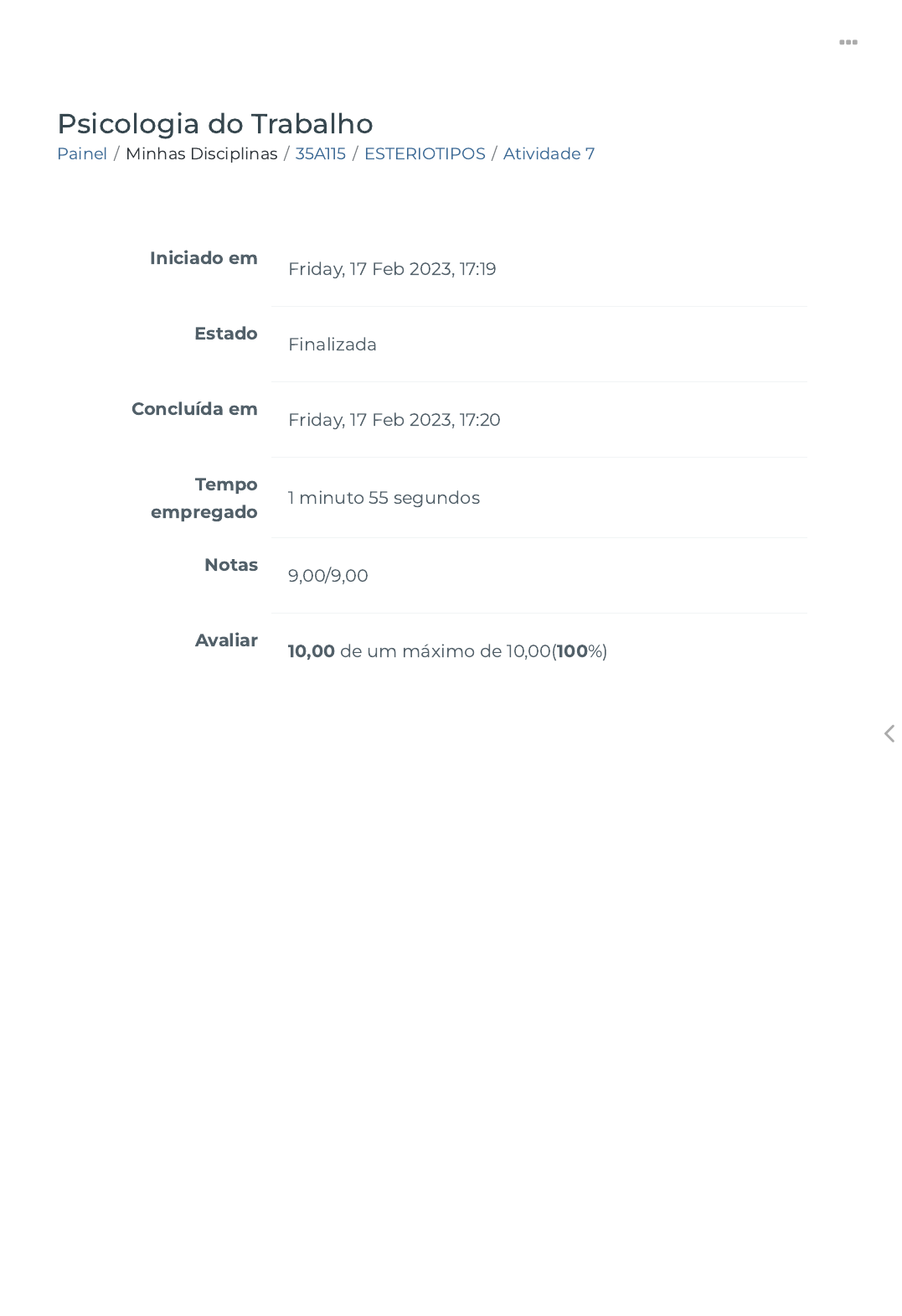 17/02/2023, 16:21 Atividade 7 https://ava.politecnicabr.com.br/mod/quiz/review.php?attempt=4398649 1/9 Painel / Minhas Disciplinas / 35A115 / ESTERIOTIPOS / Atividade 7 Psicologia do Trabalho Iniciado em Friday, 17 Feb 2023, 17:19 Estado Finalizada Concluída em Friday, 17 Feb 2023, 17:20 Tempo empregado 1 minuto 55 segundos Notas 9,00/9,00 Avaliar 10,00 de um máximo de 10,00(100%) https://ava.politecnicabr.com.br/my/ https://ava.politecnicabr.com.br/course/view.php?id=1037 https://ava.politecnicabr.com.br/course/view.php?id=1037#section-8 https://ava.politecnicabr.com.br/mod/quiz/view.php?id=25561 https://ava.politecnicabr.com.br/ 17/02/2023, 16:21 Atividade 7 https://ava.politecnicabr.com.br/mod/quiz/review.php?attempt=4398649 2/9 Questão 1 Correto Atingiu 1,00 de 1,00 Escolha abaixo a alternativa correta para o signi�cado de Estereótipo: Escolha uma opção: a. impressão colorida b. impressão líquida c. impressão sólida d. impressão comum https://ava.politecnicabr.com.br/ 17/02/2023, 16:21 Atividade 7 https://ava.politecnicabr.com.br/mod/quiz/review.php?attempt=4398649 3/9 Questão 2 Correto Atingiu 1,00 de 1,00 O conceito de estereótipo foi criado, pelo escritor estadunidense Walter Lippmann. É bastante confundido com preconceito, uma vez que estereótipo acabam se convertendo em rótulos, muitas vezes, pejorativos e causando impacto negativo nos outros, isso ocorreu em: Escolha uma opção: a. em 1921 b. em 1923 c. em 1929 d. em 1927 e. em 1922 https://ava.politecnicabr.com.br/ 17/02/2023, 16:21 Atividade 7 https://ava.politecnicabr.com.br/mod/quiz/review.php?attempt=4398649 4/9 Questão 3 Correto Atingiu 1,00 de 1,00 Estereótipo são generalizações que as pessoas fazem sobre comportamentos ou características de outros. Estereótipo signi�ca impressão sólida, e pode ser sobre a aparência, roupas, comportamento, cultura etc. Escolha uma opção: Verdadeiro Falso https://ava.politecnicabr.com.br/ 17/02/2023, 16:21 Atividade 7 https://ava.politecnicabr.com.br/mod/quiz/review.php?attempt=4398649 5/9 Questão 4 Correto Atingiu 1,00 de 1,00 Segundo Paradela e colaboradores (2010), alguns buscam utilizar a ciência, especialmente a genética, para justi�car o preconceito. De tal forma, os autores de�nem que que os fundamentos evolutivos para o surgimento da espécie humana e os aspectos genéticos a respeito da expressão de genes fornecem respaldo para a a�rmação de que não há raças humanas. Escolha uma opção: Verdadeiro Falso https://ava.politecnicabr.com.br/ 17/02/2023, 16:21 Atividade 7 https://ava.politecnicabr.com.br/mod/quiz/review.php?attempt=4398649 6/9 Questão 5 Correto Atingiu 1,00 de 1,00 O fato é que muitos estereótipos são geralmente adquiridos na infância sob a in�uência dos pais, familiares, amigos, professores e através da mídia. E quando um estereótipo é aprendido e armazenado no cérebro, a tendência é que seja passado para outras pessoas Escolha uma opção: Questão 6 Correto Atingiu 1,00 de 1,00 Estereótipo é geralmente um conceito infundado sobre algo e é geralmente depreciativo, que as pessoas se baseiam em opiniões alheias e as tornam como verdadeiras. Escolha uma opção: Verdadeiro Falso Verdadeiro Falso https://ava.politecnicabr.com.br/ 17/02/2023, 16:21 Atividade 7 https://ava.politecnicabr.com.br/mod/quiz/review.php?attempt=4398649 7/9 Questão 7 Correto Atingiu 1,00 de 1,00 Está correto a�rmar que Estereótipos de gênero, são estereótipos direcionados ao gênero masculino e feminino. Antigamente ouvia- se muito que o papel da mulher era casar e ter �lhos e o homem era visto como o provedor �nanceiro e tinha que focar em sua carreira. Escolha uma opção: Questão 8 Correto Atingiu 1,00 de 1,00 Preconceito é um "juízo" preconcebido, manifestado geralmente na forma de uma atitude discriminatória perante pessoas, culturas, lugares ou tradições considerados diferentes ou "estranhos". Escolha uma opção: Verdadeiro Falso Verdadeiro Falso https://ava.politecnicabr.com.br/ 17/02/2023, 16:21 Atividade 7 https://ava.politecnicabr.com.br/mod/quiz/review.php?attempt=4398649 8/9 Questão 9 Correto Atingiu 1,00 de 1,00 Está correto a�rmar que Estereótipos sócio-econômicos são estereótipos relacionados com a questão �nanceira de indivíduos e grupo de indivíduos. Exemplos: "Os mendigos são mendigos por opção", "os sem-terra são preguiçosos", "patricinhas são mesquinhas", entre outros. Escolha uma opção: Verdadeiro Falso Entre em Contato https://www.politecnicabr.com.br 0800 084 2627 0800 084 2627 Links Úteis Dicas da nossa Diretora Acadêmica Planner de Estudos Declaração de Matrícula Orientações do AVA Abertura de Ticket Fale com o Tutor Cronograma de Estudos Manual de Estágio Manual de Competência Siga-nos nas redes sociais https://www.politecnicabr.com.br/ https://soundcloud.com/user-501638417/sets/escola-politecnica-brasileira https://storage.googleapis.com/sirius-pubstore/semestre_plannerdeestudo%20poli.pdf https://storage.googleapis.com/sirius-pubstore/declaracao_matricula.pdf https://storage.googleapis.com/sirius-pubstore/orientacoes_ava.pdf https://storage.googleapis.com/sirius-pubstore/abertura_ticket.pdf https://storage.googleapis.com/sirius-pubstore/fale_com_tutor.pdf https://storage.googleapis.com/sirius-pubstore/cronograma_estudos.pdf https://storage.googleapis.com/sirius-pubstore/manual_estagio.pdf https://storage.googleapis.com/sirius-pubstore/manual_competencia.pdf https://ava.politecnicabr.com.br/ 17/02/2023, 16:21 Atividade 7 https://ava.politecnicabr.com.br/mod/quiz/review.php?attempt=4398649 9/9 © 2022 - Escola Politécnica Brasileira https://ava.politecnicabr.com.br/mod/quiz/0 https://www.facebook.com/politecnicabr https://www.instagram.com/politecnicabr_oficial https://ava.politecnicabr.com.br/