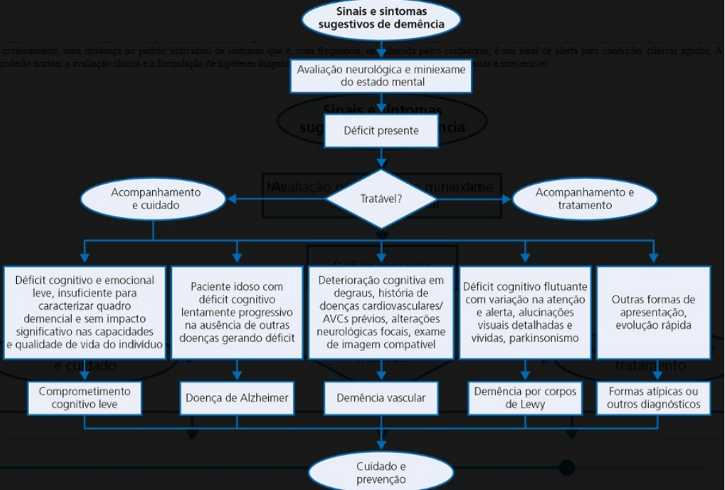 Demências Thaynara Silva Definição: Transtorno neurocognitivo maior. É uma síndrome clínica que cursa com deterioração dos domínios cognitivos, alterações de comportamento e prejuízo funcional. Comprometimento Cognitivo Leve (CCL): Declínio da função cognitiva que é maior que o esperado para a idade e base educacional de uma pessoa e que vai além das mudanças normais observadas no envelhecimento, MAS que não comprometem as atividades diárias. - CCL amnéstico (memória comprometida) - CCL não amnéstico #Paciente com CCL amnéstico pode evoluir para Doença de Alzheimer Considerado “fase pré-demência” Abordagem para o CCL: · Não há eficácia com isso de inibidores da acetilcolinesterase · Tratar comorbidades se presentes: depressão, fatores de RCV, deficiência de vitaminas e outros. Comprometimento Cognitivo Subjetivo: Mudança do funcionamento cognitivo autorrelatado, sem prejuízo funcional e não percebida por outros. O famoso esquecimento. Tem que saber diferenciar: Demência Delirium e Depressão Qual é a forma mais comum de demência entre os idosos? R- Doença de Alzheimer (60-80% dos casos) Comprometimento cognitivo vascular (18-20%) Demência frontotemporal-DFT (12%) - Variante comportamental (Doença de Pick) - Variante de linguagem Demência dos corpúsculos de Lewy (7-20%) Sinucleinopatia (acúmulo de alfa-sinucleína no SNC) Sinais parkinsonianos associados/ parkinsonismo Flutuações cognitivas Alucinações visuais bem elaboradas Intolerância aos neurolépticos Outros Fatores de risco para demência Idade (o mais importante) História familiar + Fatores genéticos Comprometimento cognitivo leve Estilo de vida (Alcoolismo, obesidade); Fatores de risco cardiovascular. Classificação das demências · Quanto ao tempo de evolução: <2 anos: Demência Rapidamente Progressiva (DRP): causas peculiares; Solicitar laboratório, RNM, EEG, LCR. Pode ser: - Prion (Doença de Creutzfeldt jacob)- encefalopatia espongiforme - Encefalites autoimunes ou paraneoplásicas - Infeccioso ( encefalite herpética, Tuberculose cerebral...) · Quanto à área cerebral envolvida Demências corticais Déficit de memória Alteração da linguagem Ex: Doença de Alzheimer e demência frontotemporal Demências subcorticais Lentidão intelectual Distúrbio de atenção Linguagem geralmente preservada Ex: Doença de Parkinson, demência por HIV, demência vascular subcortical... · Quanto à etiologia A incidência de demência aumenta exponencialmente com a idade Avaliação Diagnóstica: O diagnóstico de demência é essencialmente clínico, mas pode ser dificultado pela presença de múltiplas comorbidades. Critérios DSM-5 para diagnóstico de Transtorno neurocognitivo maior Prejuízo em uma ou mais Atenção Funcionamento executivo Aprendizado e memória Linguagem Percepção motora Cognição social - Interfere no funcionamento social e ocupacional - Deve haver um declínio significativo em relação ao nível funcional prévio - Não devem ocorrer exclusivamente durante o curso de delirium - Devem-se afastar causas psiquiátricas como causa primária; - Devem-se afastar causas sistêmicas ou outra doença cerebral que justifique o quadro. Critérios diagnósticos para transtorno neurocognitivo maior ou leve devido à doença de Alzheimer (DSM-5) A. São atendidos os critérios para transtorno neurocognitivo maior ou leve B. Há surgimento insidioso e progressão gradual de prejuízo em um ou mais domínios cognitivos (no caso de transtorno neurocognitivo maior, pelo menos 2 domínios devem estar prejudicados) C. Os critérios são atendidos para doença de Alzheimer provável ou possível, do seguinte modo: Para transtorno neurocognitivo maior: Provável doença de Alzheimer é diagnosticada se qualquer um dos seguintes está presente; caso contrário, deve ser diagnosticada possível doença de Alzheimer 1.Evidência de uma mutação genética causadora de doença de Alzheimer a partir de história familiar ou teste genético. 2.Todos os três a seguir estão presentes: ●Evidências claras de declínio na memória e na aprendizagem e em pelo menos outro domínio cognitivo (com base em história detalhada ou testes neuropsicológicos em série). ●Declínio constantemente progressivo e gradual na cognição, sem platôs prolongados. ●Ausência de evidências de etiologia mista (i.e., ausência de outra doença neurodegenerativa ou cerebrovascular, ou de outra doença ou condição neurológica, mental ou sistêmica, provavelmente contribuindo para o declínio cognitivo). Doença de Alzheimer Causa não conhecida (Aumento da produção ou redução da eliminação do peptídeo beta-amiloide) DA familiar representa <5% dos casos (herança autossômica dominante)- manifesta antes dos 60-65 anos Associação com Síndrome de Down Fatores de risco para DA: - Idade; - Sexo feminino; - História familiar; - Doença coronariana; - HAS; - Níveis elevados de homocisteína no sangue; - Antecedente de TCE grave - Dieta rica em gordura; - Polimorfismo específico no gene da apolipoproteína E. Quadro clínico: - Memória declarativa para fatos e acontecimentos afetada - Distúrbios da linguagem como anomia e diminuição da fluência verbal -Sintomas neuropsiquiátricos: isolamento, desinibição, agitação psicomotora, delírios, alucinações, agressividade. - Óbito em 7 a 18 anos: complicações comuns a pacientes acamados. Estágios da doença de Alzheimer: · Estágio 1 (forma inicial): alterações na memória, na personalidade e nas habilidades visuais e espaciais, perda da espontaneidade. · Estágio 2 (forma moderada): dificuldade para falar, realizar tarefas simples e coordenar movimentos. Agitação e insônia. Piora do esquecimento. · Estágio 3 (forma grave): resistência à execução de tarefas diárias. Incontinência urinária e fecal. Dificuldade para comer. Deficiência motora progressiva. Psicose · Estágio 4 (terminal): restrição ao leito. M