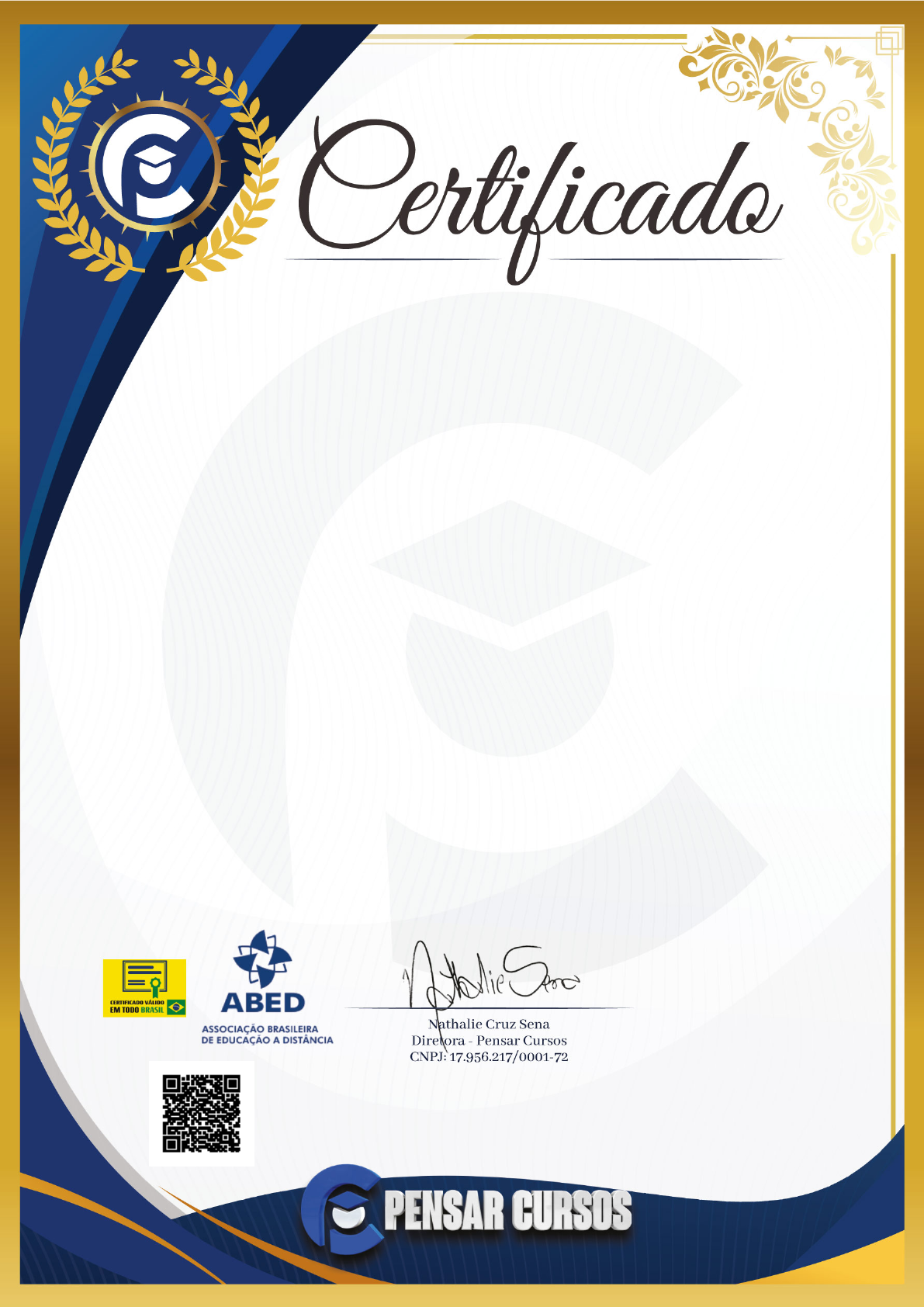 Certificamos para os devidos fins, que JUAN CARLOS portador(a) do CPF: 003.126.522-75 concluiu com êxito o curso livre de aperfeiçoamento: ATENDENTE E BALCONISTA DE FARMÁCIA Ipiaú, 02 de fevereiro de 2022 Realizado no período de 12/12/2021 a 16/01/2022, cumprindo uma carga horária de 70 HORAS, nos termos do Decreto Presidencial nº 5.154, de 23 de julho de 2004, Art 1º e 3º e de acordo com as normas do Ministério da Educação (MEC) pela resolução CNE nº 04/99, Art 11. O presente documento foi registrado sob o número 9166432207397449202201, em folha 486 do livro nº 378 desta instituição de ensino conforme listagem publicada no diário eletrônico no site Pensar Cursos Curso: Atendente e Balconista de Farmácia Nome: Juan Carlos Carga Horária 70 horas Número do Certificado: 9166432207397449202201 CONTEÚDO PROGRAMÁTICO Anatomia Farmacocinética Interações medicamentosas física e farmacêuticas Organização de medicamentos Recebimento Interpretações de receitas Noções de medicamentos Introdução aos fundamentos da gestão Psicologia do consumo Ciclo de produção-consumo e marketing promocional Gerenciamento de categorias Mix de produtos e serviços Gestão de estoque Atendimento ao consumidor Atenção farmacêutica e serviços farmacêuticos Formação de preço Gestão tributária e análise de margem Ipiaú, 02 de fevereiro de 2022