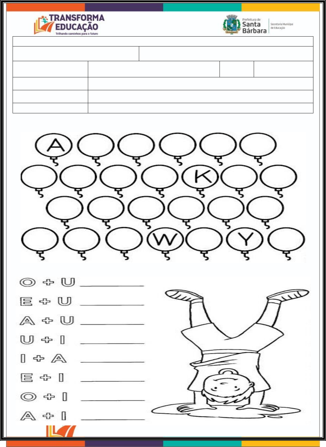 1. COMPLETE O ALFABETO COM ATENÇÃO. 2. JUNTE AS LETRAS E LEIA O QUE ESCREVEU. ESCOLA MUNICIPAL “CECÍLIA ÁLVARES DUARTE” COMPONENTE CURRICULAR: LÍNGUA PORTUGUESA ANO/TURMA: DATA: / /2023 TÍTULO: ALFABETO E VOGAIS PROFESSORA: ALUNO (A) 1. CUBRA AS LETRAS USANDO LÁPIS DE COR VERMELHO PARA AS VOGAIS E LÁPIS DE AZUL PARA AS CONSOANTES VOLTE AO QUADRO DO ALFABETO E REGISTRE NO QUADRADINHO QUANTAS LETRAS TEM O ALFABETO COMPLETO. ESCOLA MUNICIPAL “CECÍLIA ÁLVARES DUARTE” COMPONENTE CURRICULAR: LÍNGUA PORTUGUESA ANO/TURMA: DATA: / /2023 TÍTULO: ALFABETO PROFESSORA: ALUNO (A) CUBRA COM CAPRICHO AS LETRINHAS DO ALFABETO. AGORA REESCREVA AS LETRAS NO QUADRADINHO ABAIXO. ESCOLA MUNICIPAL “CECÍLIA ÁLVARES DUARTE” COMPONENTE CURRICULAR: LÍNGUA PORTUGUESA ANO/TURMA: DATA: / /2023 TÍTULO: ALFABETO PROFESSORA: ALUNO (A) ESCOLA MUNICIPAL “CECÍLIA ÁLVARES DUARTE” COMPONENTE CURRICULAR: MATEMÁTICA ANO/TURMA: DATA: / /2023 TÍTULO: SEQUÊNCIA NUMÉRICA PROFESSORA: ALUNO (A) MÊS:___________________________ ANO:_______________ ESCOLA MUNICIPAL “CECÍLIA ÁLVARES DUARTE” COMPONENTE CURRICULAR: MATEMÁTICA ANO/TURMA: DATA: / /2023 TÍTULO: CALENDÁRIO PROFESSORA: ALUNO (A) DOMINGO SEGUNDA- FEIRA TERÇA- FEIRA QUARTA- FEIRA QUINTA- FEIRA SEXTA- FEIRA SÁBADO O CARACOL VIAJANTE RODOLFO É UM CARACOL. ELE ADORA VIAJAR. ELE NÃO TEM PRESSA DE CHEGAR. RODOLFO LEVA A CASA NAS COSTAS. A BARRIGA VAI NO CHÃO. A CABEÇA VAI NO AR. RODOLFO VIVE SEMPRE SATISFEITO. ELE NÃO TEM ALUGUEL PARA PAGAR. SÔNIA JUNQUEIRA. 1. COM A AJUDA DA PROFESSORA, LEIA O TEXTO ABAIXO E RESPONDA: 1. ESCREVA O TÍTULO DO TEXTO. __________________________________________________________________ 2. QUAL O NOME DO CARACOL? __________________________________________________________________ 3. QUAL O ANIMAL QUE APARECE NO TEXTO: 4. QUAL A LETRA INICIAL DE CARACOL? 5. QUAL A LETRA FINAL DE CARACOL? 6. TOTAL DE LETRAS DA PALAVRA CARACOL. ESCOLA MUNICIPAL “CECÍLIA ÁLVARES DUARTE” COMPONENTE CURRICULAR: LÍNGUA PORTUGUESA ANO/TURMA: DATA: / /2023 TÍTULO: SEQUÊNCIA DIDÁTICA – LEITURA E INTERPRETAÇÃO PROFESSORA: ALUNO (A) 8 7 L C L C CARACOL CAVALO 7. COMPLETE O ALFABETO COM AS LETRAS QUE ESTÃO FALTANDO E PINTE AS VOGAIS DE VERDE. A E I O U 8. AGORA COMPLETE COM AS LETRS QUE VEM ANTES E DEPOIS. 9. OBSERVE COM ATENÇÃO A FRASE QUE O RODOLFO ESCREVEU. A) QUAL A PRIMEIRA PALAVRA DA FRASE? _____________________________ B) E A ÚLTIMA?__________________________________ RODOLFOLEVAACASANASCOSTAS. AJUDE-ME A ORGANIZAR A FRASE CORRETAMENTE REESCREVENDO NO ESPAÇO ABAIXO. 1. LIGUE OS PONTOS SEGUINDO A SEQUÊNCIA NUMÉRICA E, DEPOIS RESPONDA: A) VENHO ANTES DO NUMERAL 8. SOU O NUMERAL B) VENHO DEPOIS DO NUMERAL 5.SOU O NUMERAL C) VENHO ENTRE O NUMERAL 9 E O 11.SOU O NUMERAL 2. CONTE E ESCREVA O NUMERAL QUE INDICA A QUANTIDADE DE ELEMENTOS NO CÍRCULO AO LADO. ESCOLA MUNICIPAL “CECÍLIA ÁLVARES DUARTE” COMPONENTE CURRICULAR: MATEMÁTICA ANO/TURMA: DATA: / /2023 TÍTULO: SEQUÊNCIA NUMÉRICA - NUMERAIS- ADIÇÃO E SUBTRAÇÃO PROFESSORA: ALUNO (A) 3. RESOLVA O DESAFIO ABAIXO. -- = 4. RESOLVA OS FATOS DA ADIÇÃO. 5. O CARACOL GOSTA DE SE ALIMENTAR DE FRUTAS E PLANTAS. CONTE AS MAÇÃS E REGISTRE A QUANTIDADE NO QUADRADINHO. + + 2 As crianças aprendem muito com as experiências vividas durante interações e brincadeiras no ambiente onde elas estão inseridas. Por esse motivo, é muito importante que a família organize momentos para a realização das atividades enviadas para casa. Portanto organize uma rotina de estudos, assim a criança irá aprender a ter responsabilidade, autonomia e compromisso. As atividades de casa deverão ser orientadas por um adulto e também assinada pelo mesmo. Incentive-os a ter capricho e dedicação. Deixe que expressem seus anseios em relação às atividades isso facilita a interpretação de vocês sobre a facilidade ou dificuldade deles. Valorize a realização das atividades do jeitinho que fizer. Leia pausadamente as instruções e incentive-os a ler os enunciados das atividades propostas. Ajude-os a sentirem tranqüilos, acolhidos com confiança e autonomia nas realizações das atividades. Oriente a organizar os materiais, caderno, livros, bolsinha e mantenha os lápis apontados e margens nas folhas. Jamais faça as atividades pela criança. Utilize o caderno de bilhete para comunicar e fiquem atentos aos recados que também serão enviados pela escola/professora. Dessa forma teremos um ano abençoado, produtivo e feliz. Conto com sua parceria e estou a disposição para quaisquer dúvidas. Alessandra Branco ORIENTAÇÕES AOS PAIS E OU RESPONSÁVEIS PARA AS TAREFAS DE CASA.